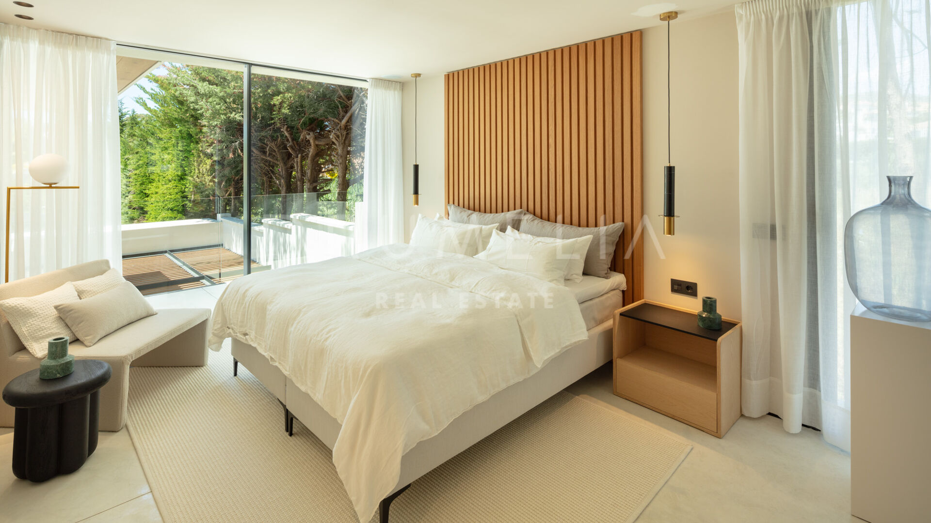 Główna sypialnia to prawdziwa oaza spokoju z luksusową łazienką i widokiem na ogród. Na zewnątrz willa oferuje prywatne sanktuarium z imponującym basenem, zadbanymi terenami zielonymi i strefami relaksu – idealnymi do wypoczynku lub spotkań towarzyskich.