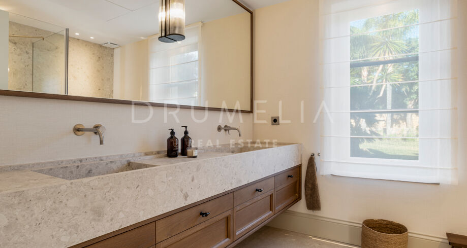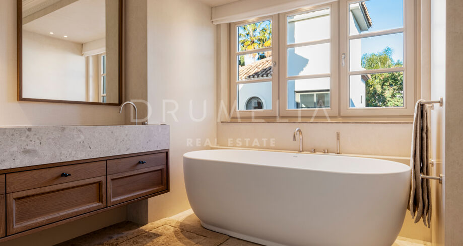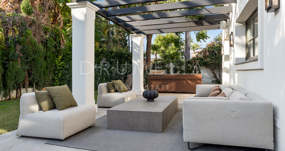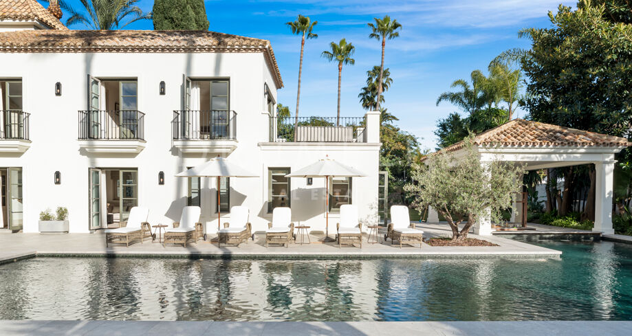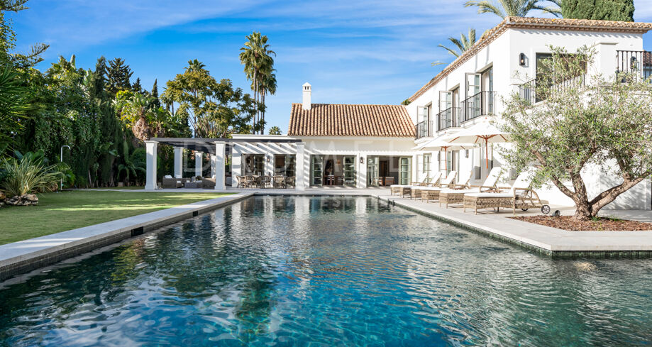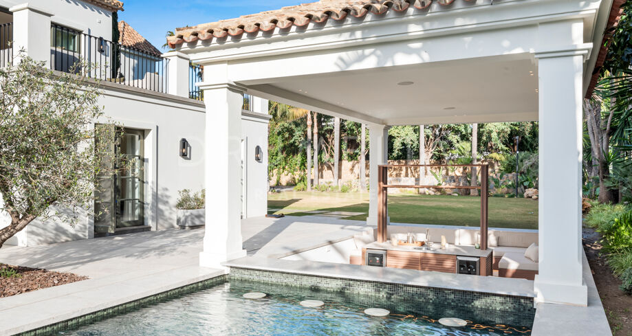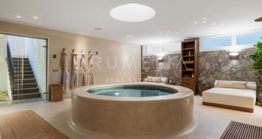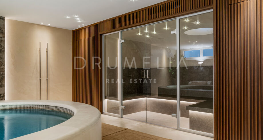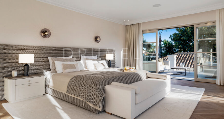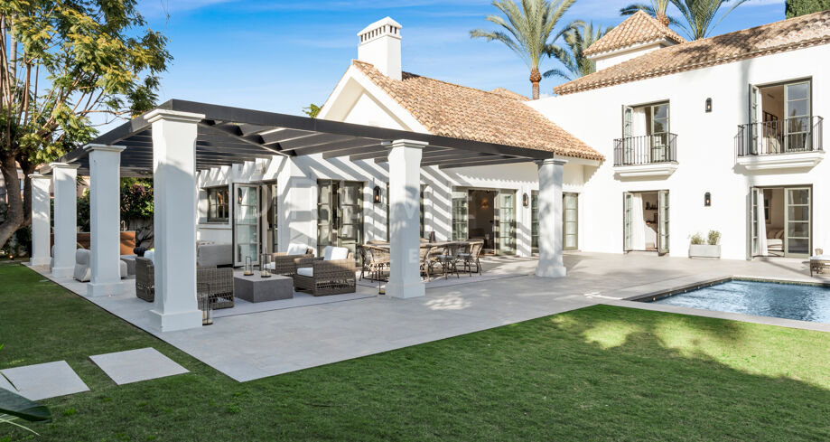 W pełni odnowiona willa z 5 sypialniami, prywatnym spa, siłownią, rozległymi tarasami i zagospodarowanym ogrodem z basenem w Nueva Andalucía, Marbella
