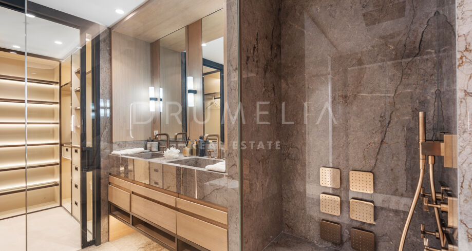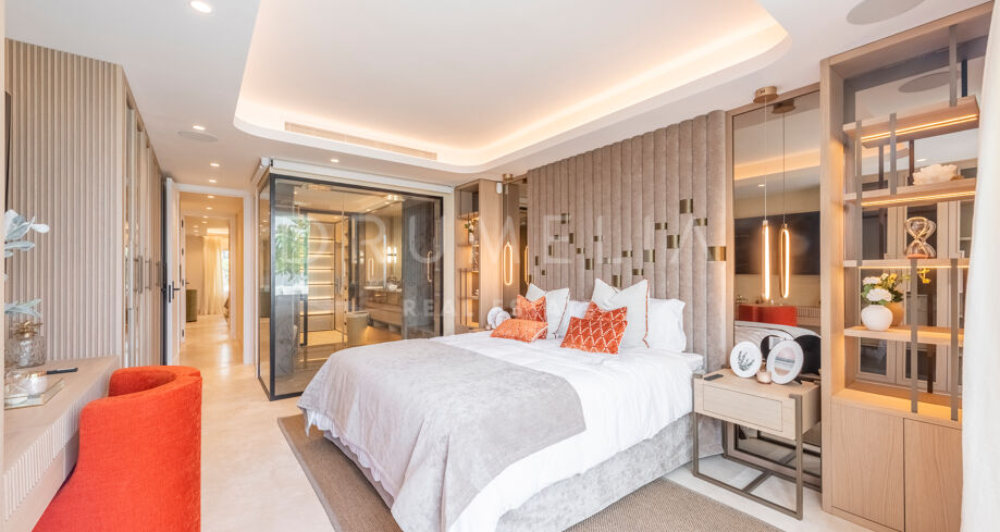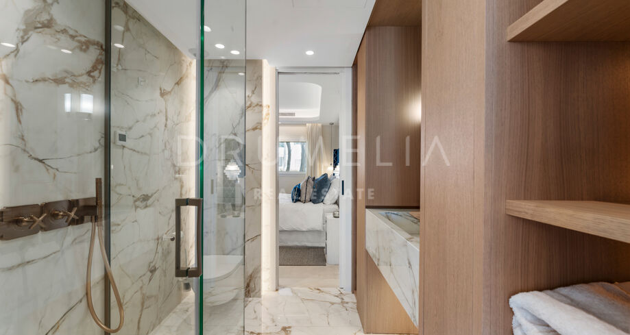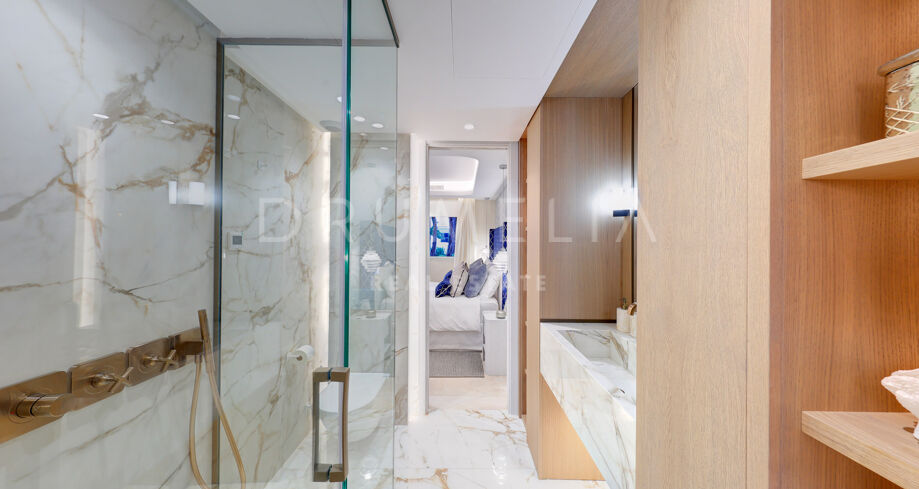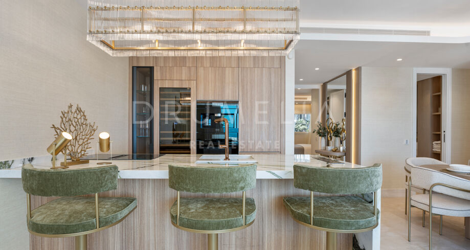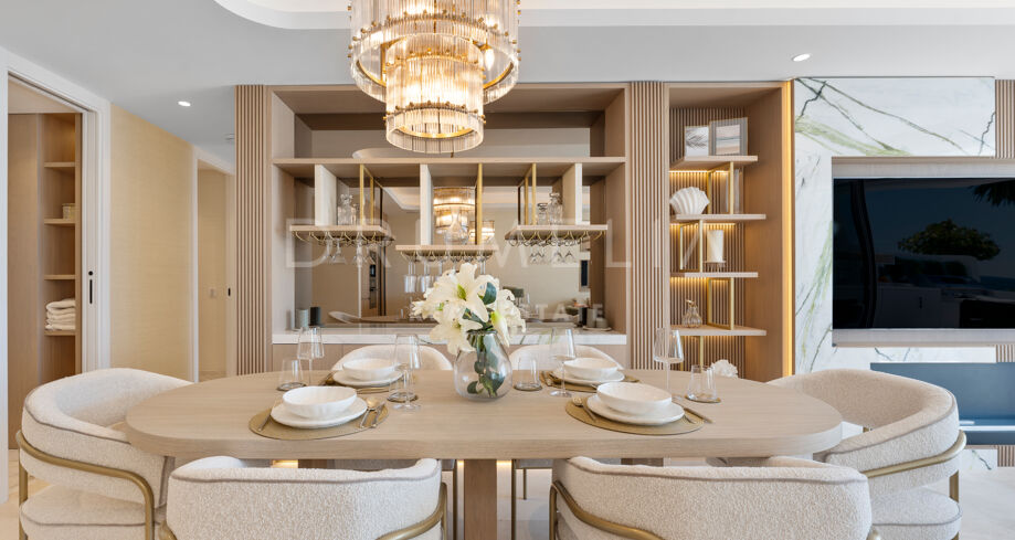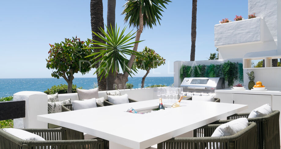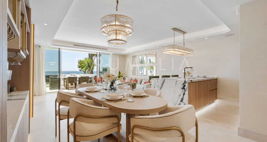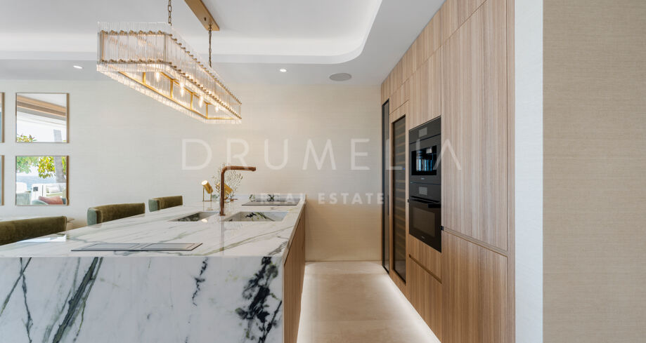 Skrupulatnie odnowiona zgodnie z nienagannymi standardami, nieruchomość oferuje zapierające dech w piersiach widoki na morze, które na nowo definiują koncepcję życia przy plaży. Po wejściu do nieruchomości wita nas przestronna i jasna kuchnia na otwartym planie, salon i jadalnia, która płynnie przechodzi na częściowo zadaszony taras, zapewniając wyjątkowy punkt widokowy, aby docenić hipnotyzujące widoki na morze. Kuchnia została starannie zaprojektowana z pomieszczeniem gospodarczym, uzupełniając komfort i styl przestrzeni.