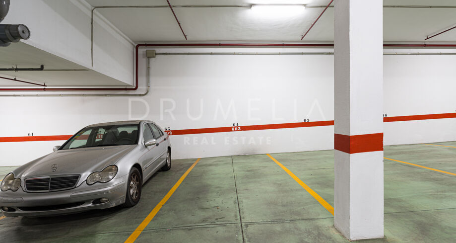 Wnętrza łączą marmurowe podłogi, drewniane detale i neutralną paletę barw, tworząc spokojną i nowoczesną atmosferę. Wyposażenie obejmuje elektryczne rolety, ogrzewanie podłogowe w łazienkach oraz klimatyzację zapewniającą komfort przez cały rok. Nieruchomość posiada również miejsce parkingowe w garażu podziemnym oraz komórkę lokatorską. Zamknięte osiedle oferuje całodobową ochronę, zadbane ogrody i baseny z otwartym widokiem na Morze Śródziemne, Gibraltar i wybrzeże Afryki.