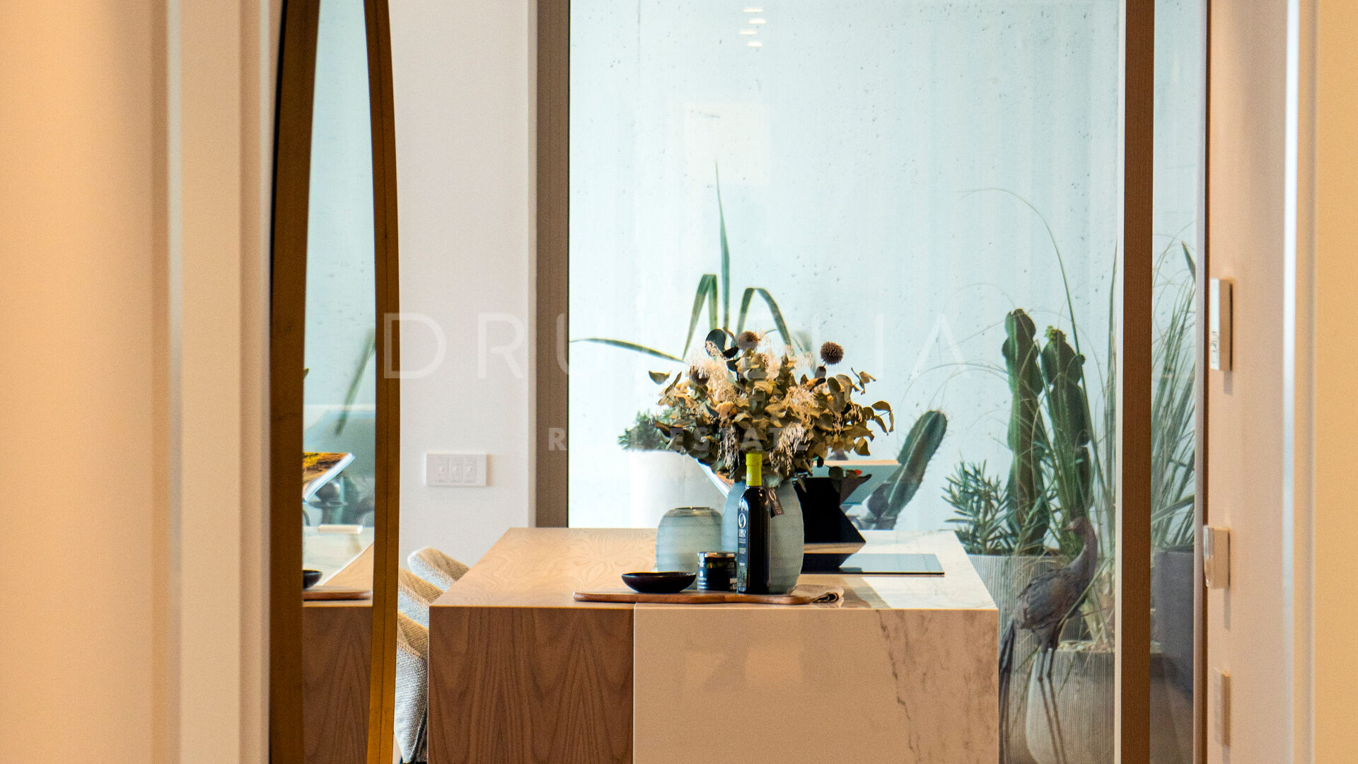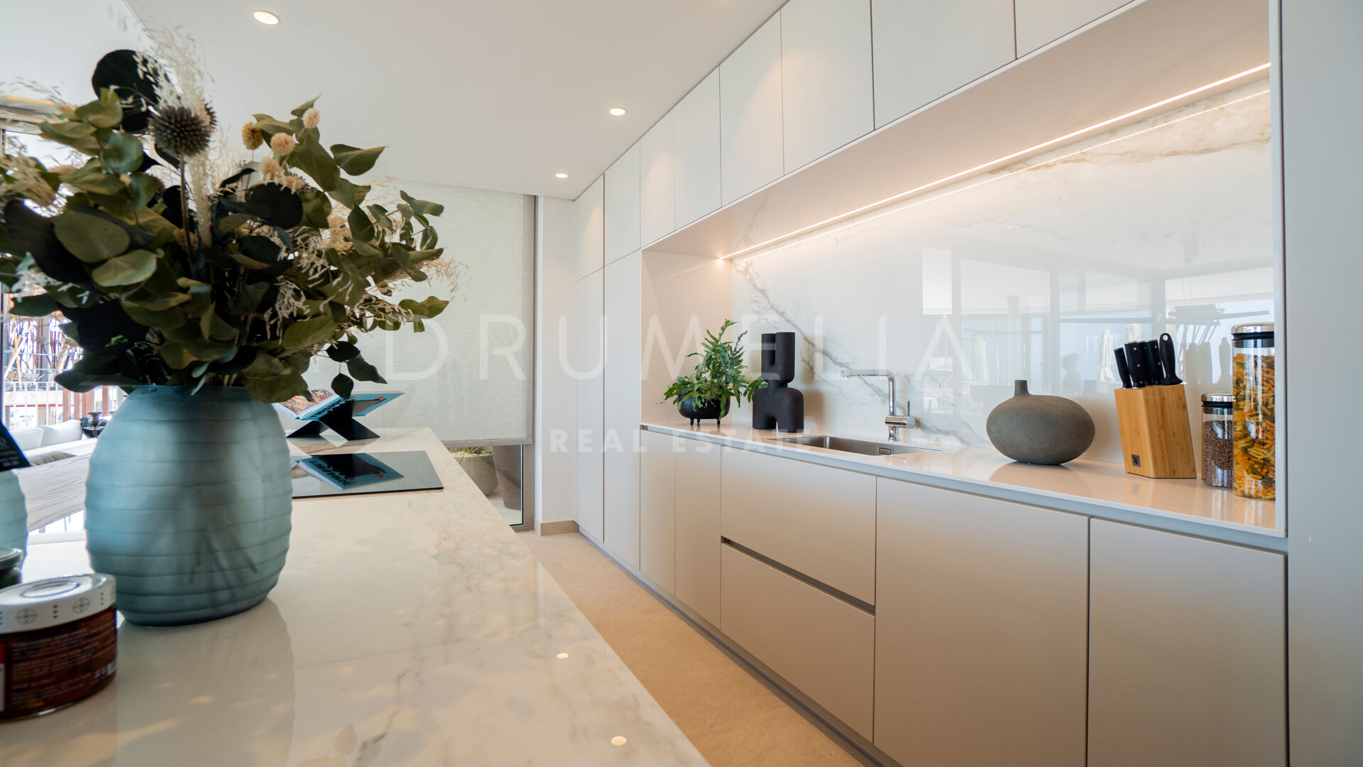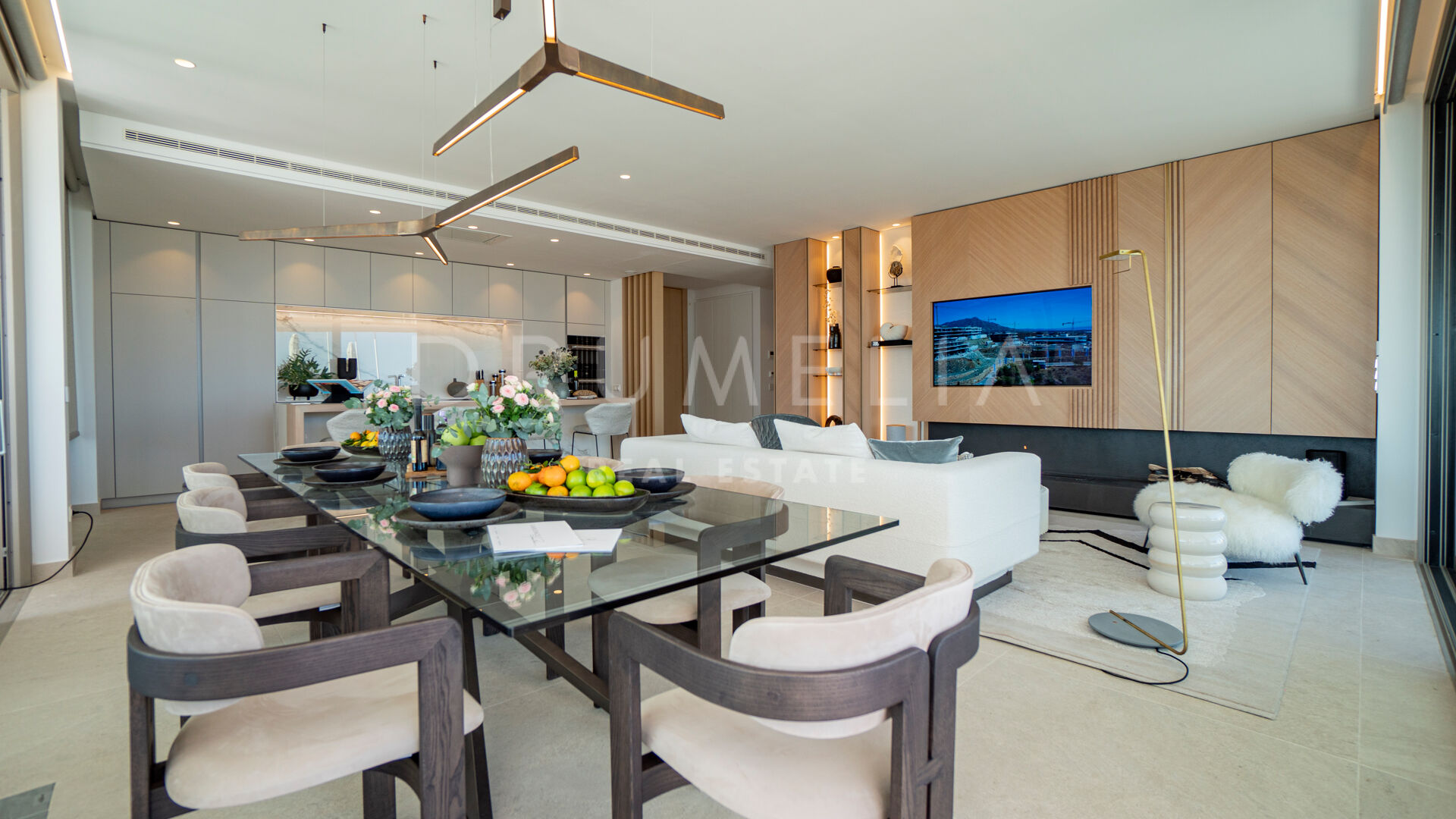 Sam apartament posiada salon na otwartym planie, płynnie łączący salon, jadalnię i kuchnię, wszystkie skąpane w naturalnym świetle dzięki oknom sięgającym od podłogi do sufitu. Rozległy układ tworzy zachęcającą przestrzeń idealną do rozrywki lub relaksu, podziwiając niezakłócony widok na wybrzeże Morza Śródziemnego.