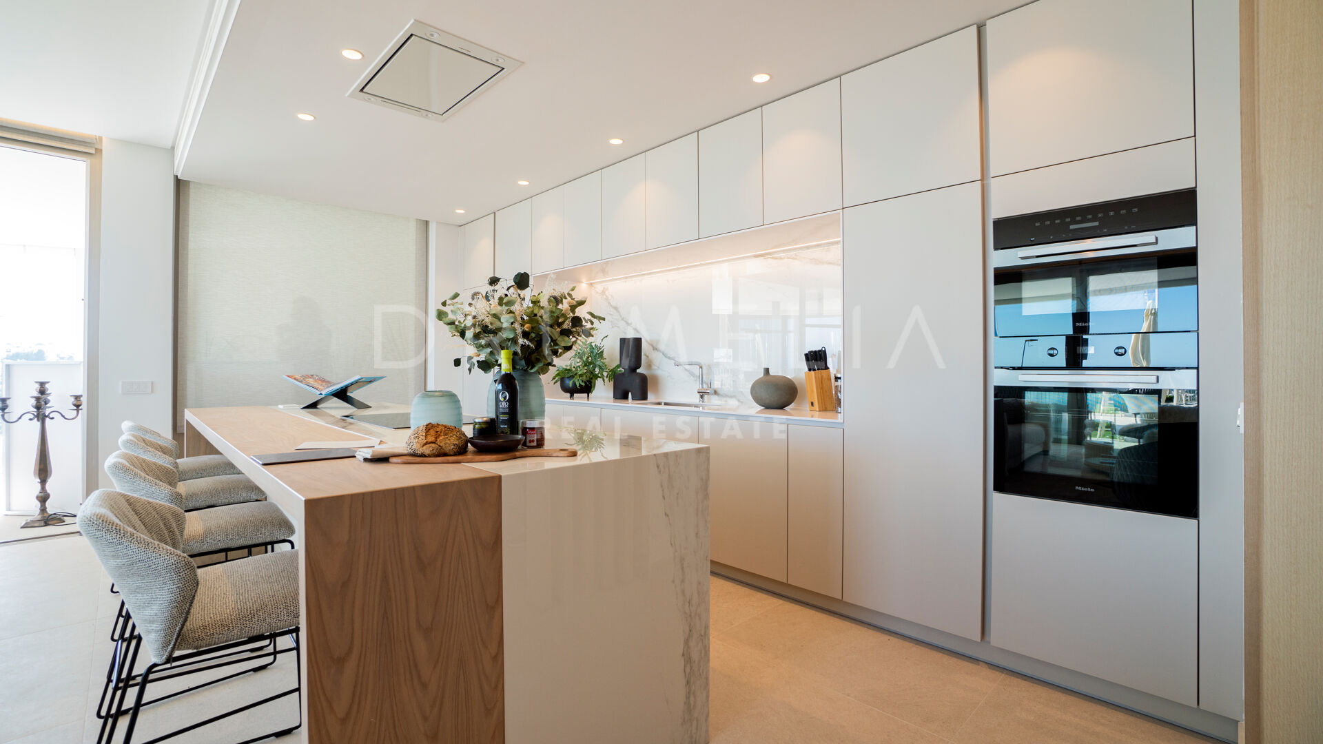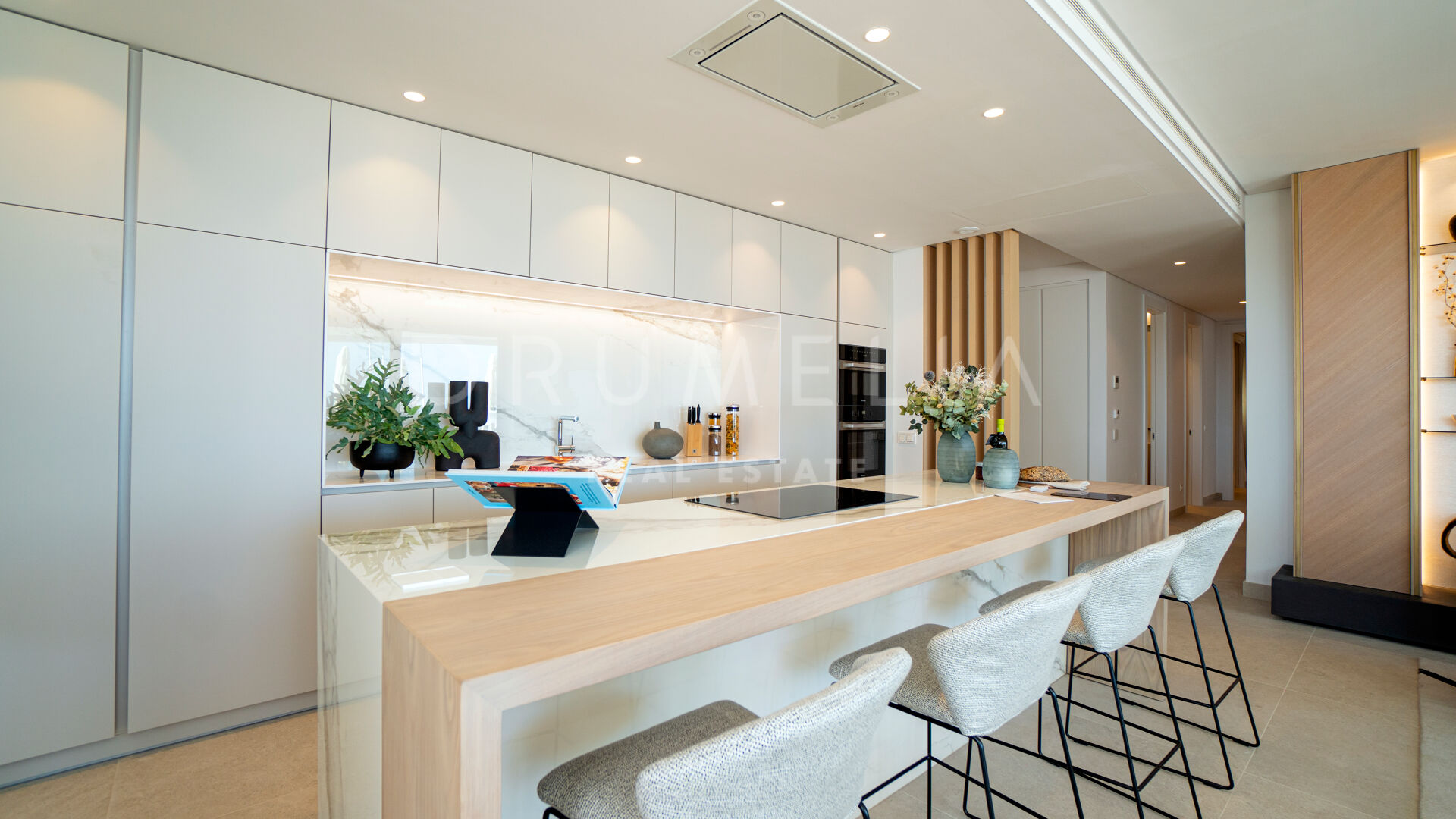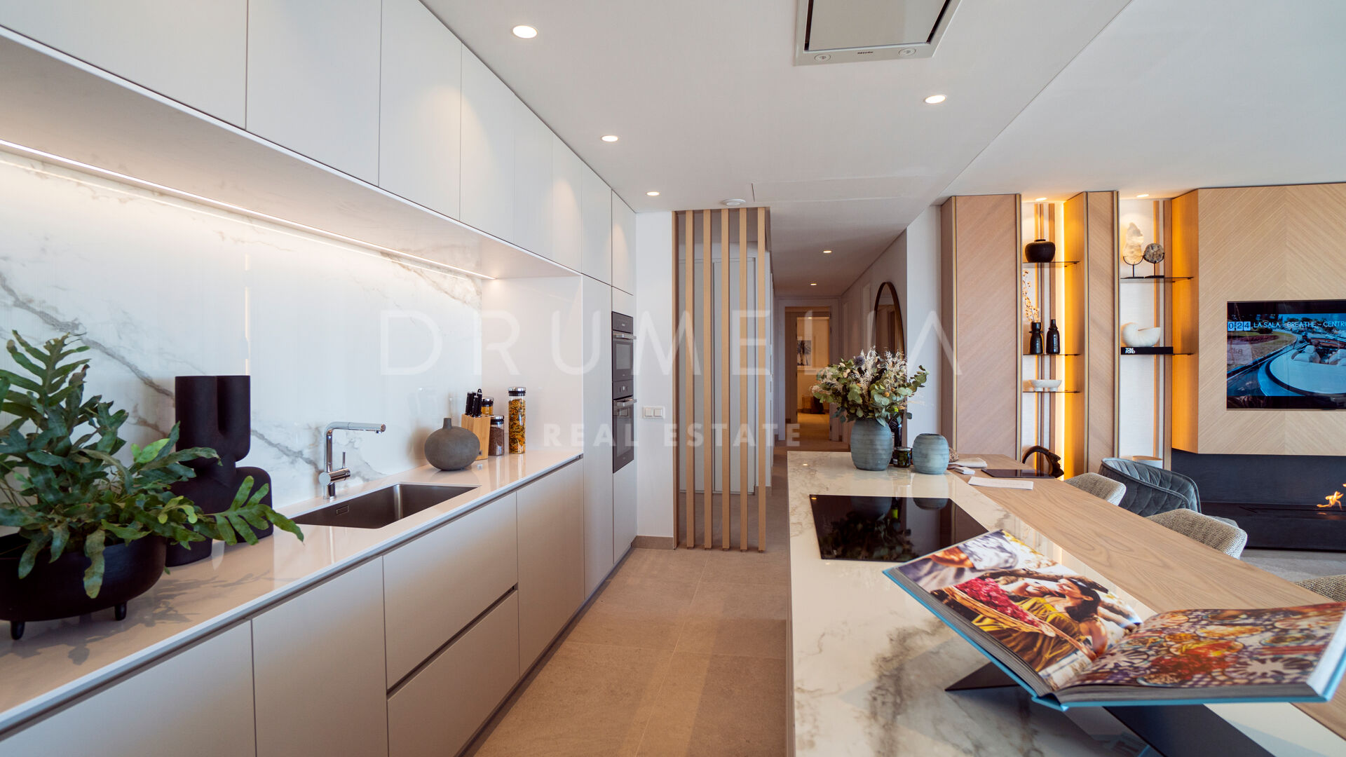 Sam apartament posiada salon na otwartym planie, płynnie łączący salon, jadalnię i kuchnię, wszystkie skąpane w naturalnym świetle dzięki oknom sięgającym od podłogi do sufitu. Rozległy układ tworzy zachęcającą przestrzeń idealną do rozrywki lub relaksu, podziwiając niezakłócony widok na wybrzeże Morza Śródziemnego.