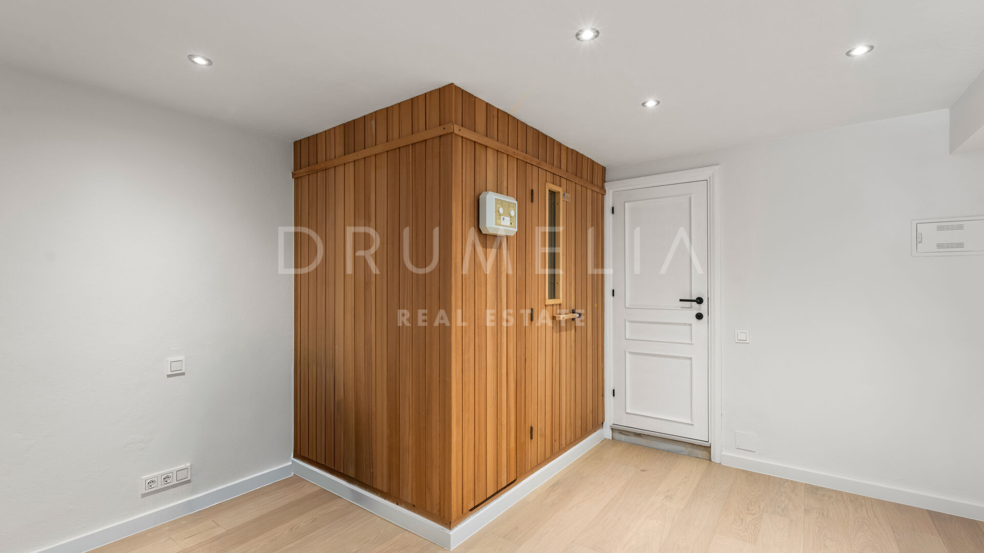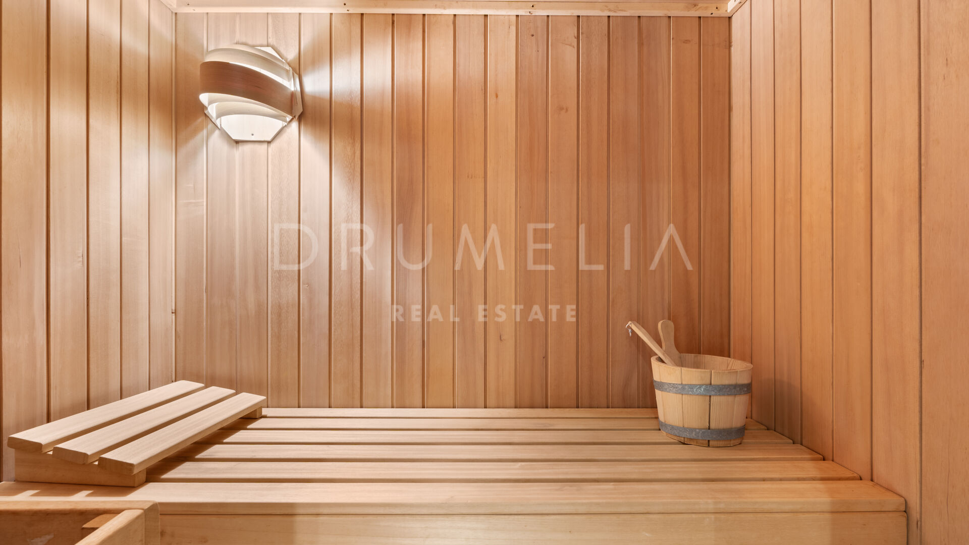 The villa offers four bedrooms, each with en-suite bathroom, along with a guest toilet, fitted wardrobes, and ample storage. Designed for relaxation and well-being, it includes a private sauna, swimming pool, and generous terraces that extend the living areas outdoors.