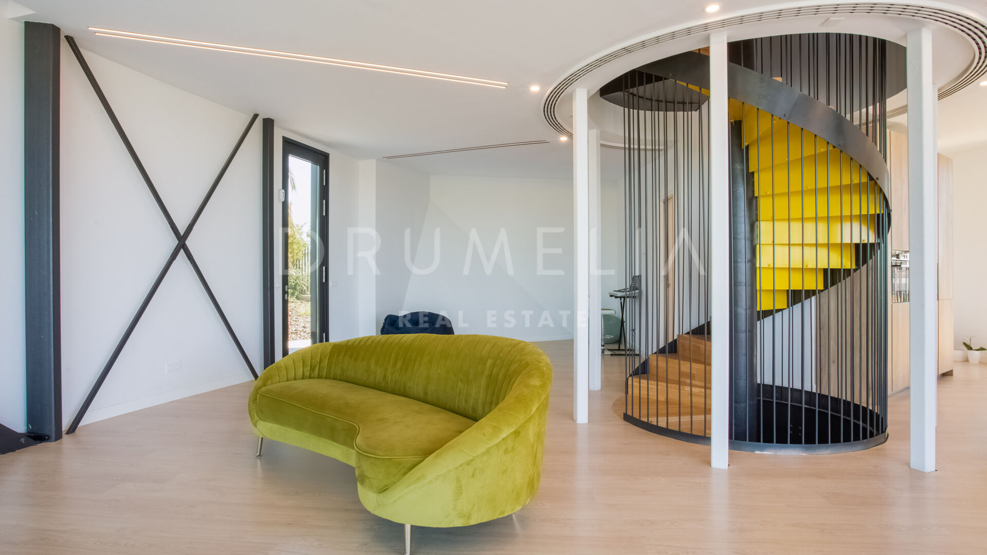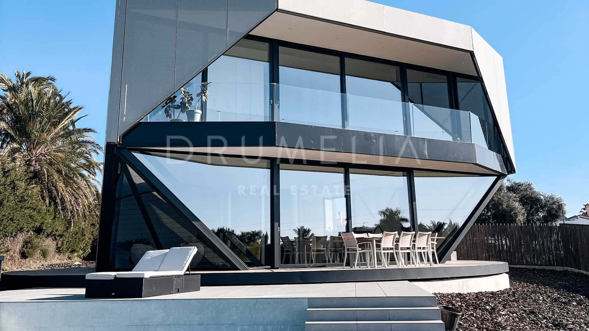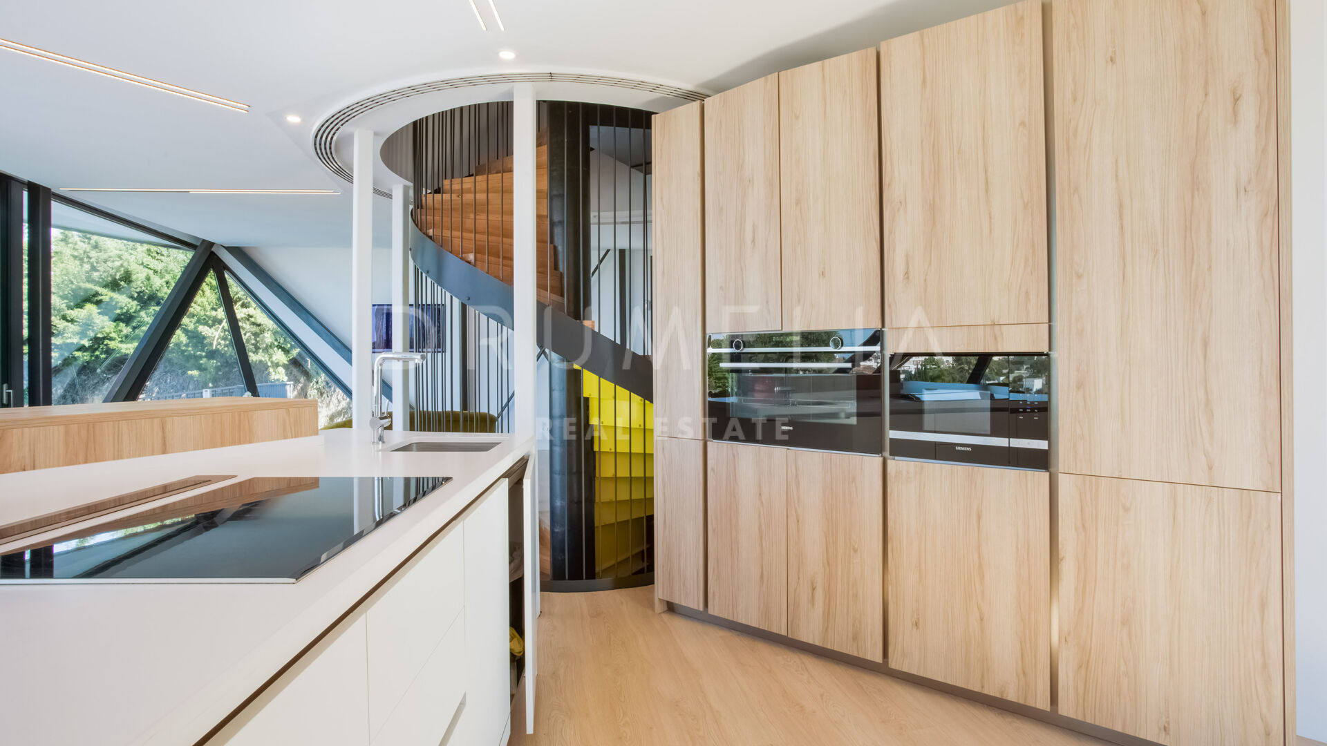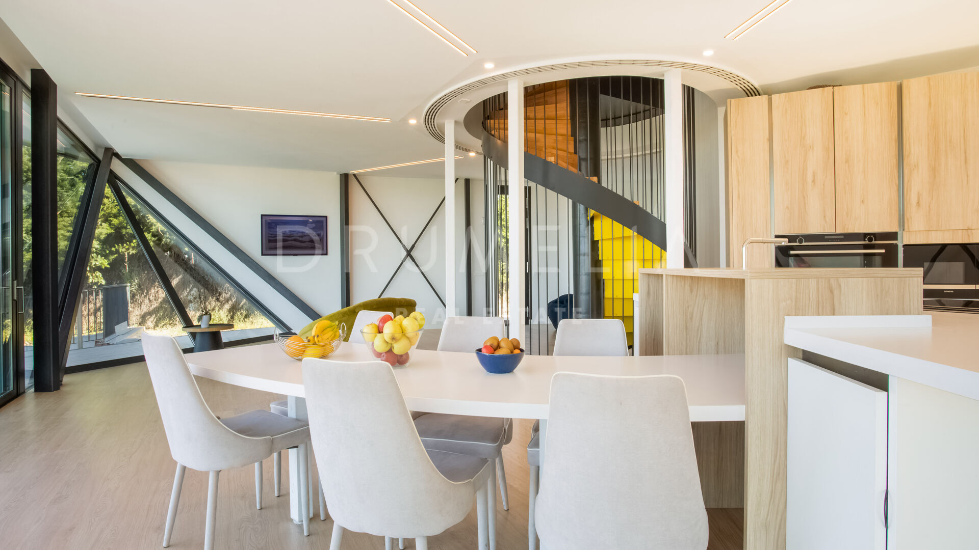 Surrounded by luxury properties and beautiful nature of the area, this house of the future has been designed with emphasis on space, light and energy savings. Add the optimal mix of weight, durability and low maintenance of the best construction and insulation materials available. The property features spacious and exciting rounded living and dining areas (probably more homely and welcoming than traditional square-rigged layouts) connected to a sleek kitchen and a terrace; 3 bedrooms and 3 bathrooms; an office; terraces of 107 m², a private garage and 10×5m swimming pool. The floors of the house are connected with a stylishly spiraling stairwell or a sleek glass lift.