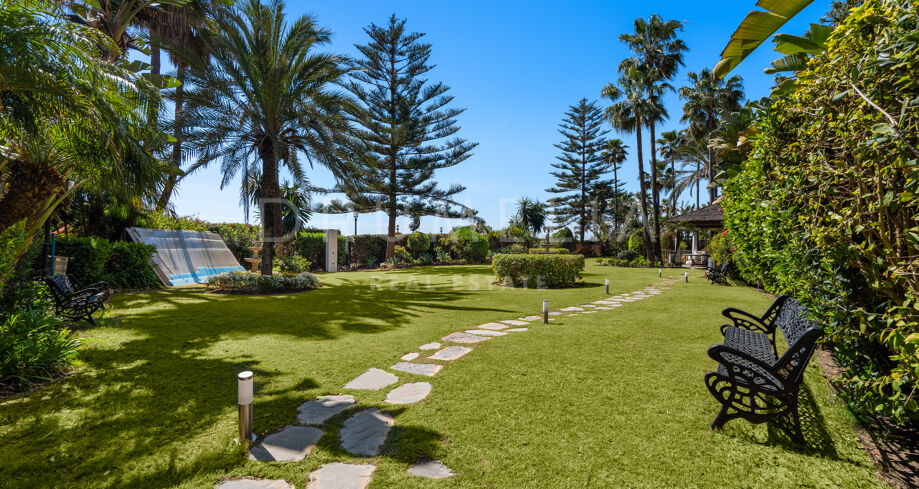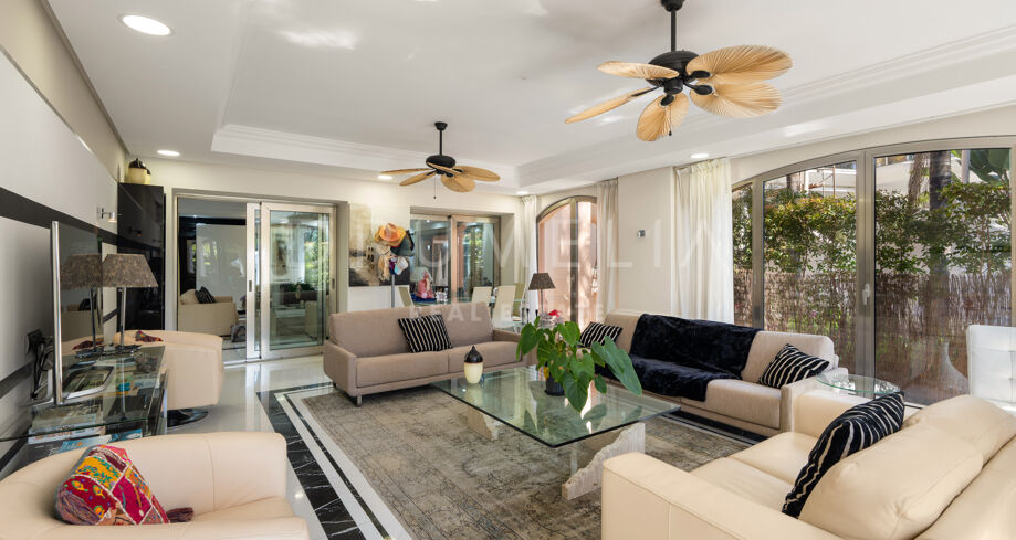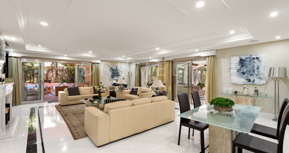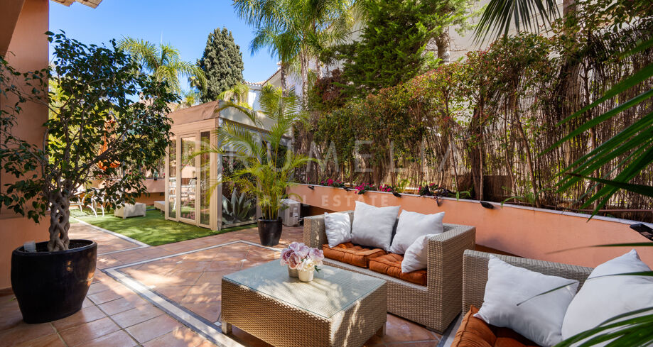 Outdoor areas include multiple lounge and dining zones, surrounded by mature greenery, providing privacy and a calm atmosphere within walking distance of Puerto Banús.