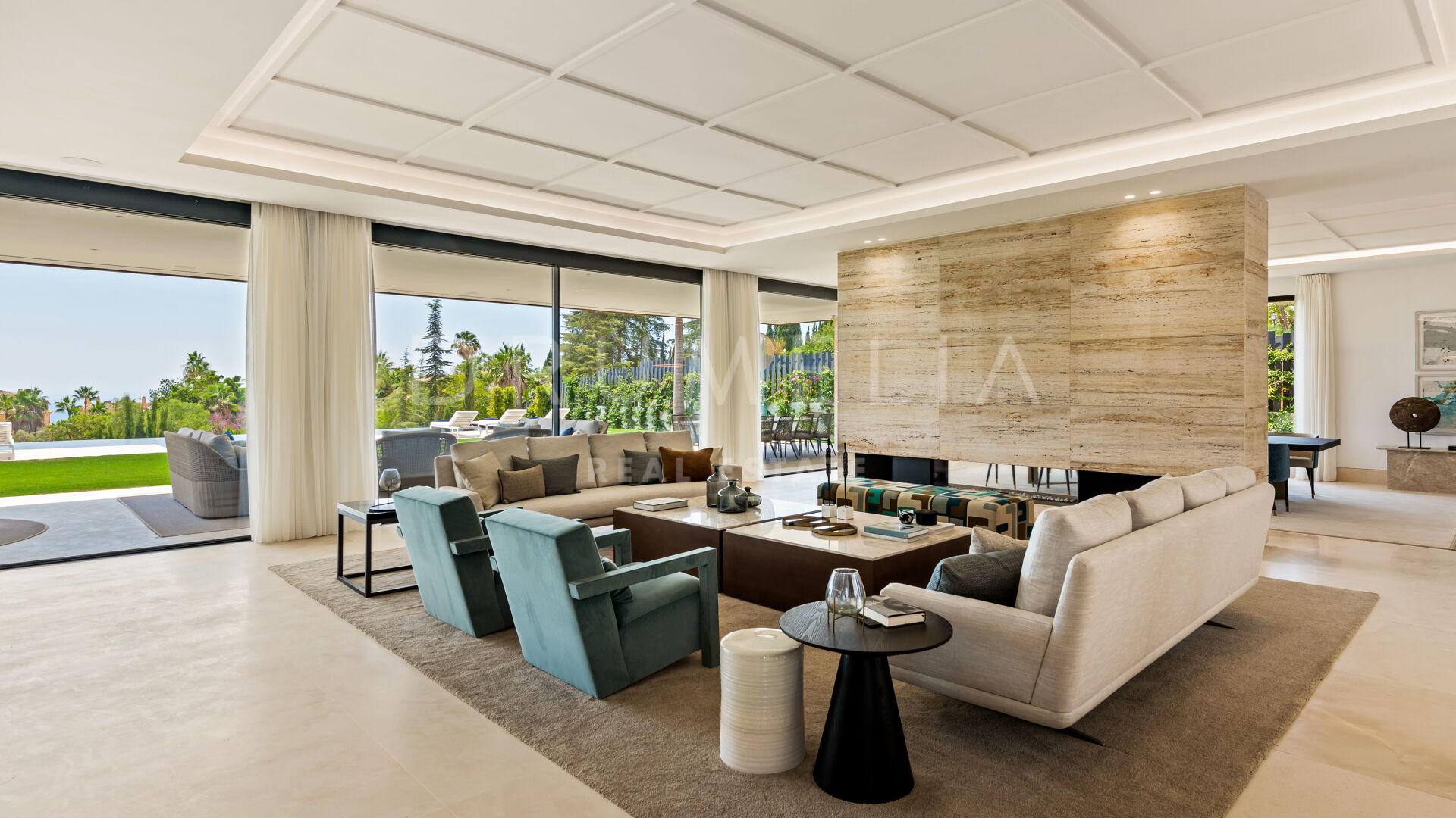 An imposing feature wall with a bio-fireplace divides a large open plan space into the living area with a TV lounge and the main dining area. A sleek minimalist-style kitchen is fully fitted, has an island with an informal dining area, excellent home appliances and the glassed wine racks. All 9 bedrooms have their own en-suite bathrooms, plus there are 2 guest toilets. The wonderful 416-m² terrace area is a phenomenal place to spend time with friends and family in a natural environment with the best climate of continental Europe.