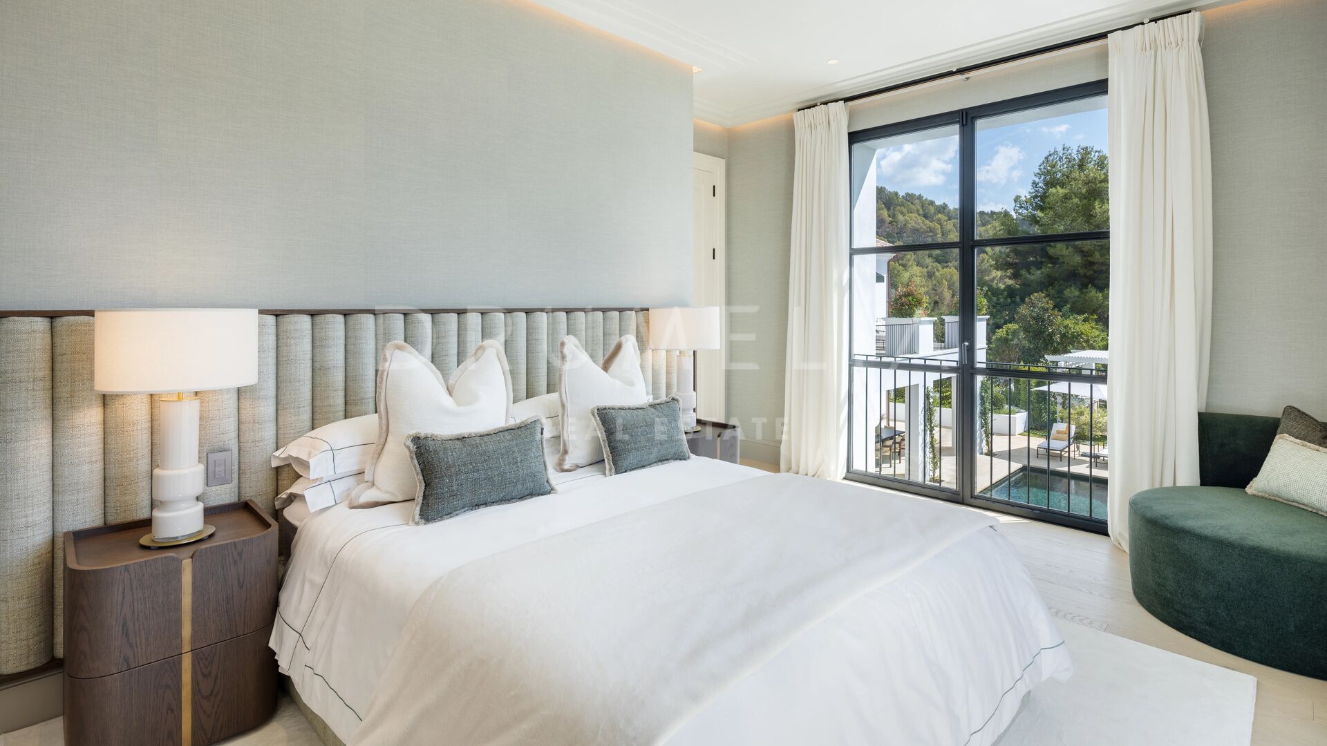 Created by the architect behind the iconic Finca Cortesín, the exterior’s soft natural tones radiate peace and balance. The surrounding gardens form a private sanctuary, ideal for gatherings and outdoor living under Marbella’s endless sunshine. Vibrant floral walls and lush greenery seamlessly merge the property with its natural surroundings.