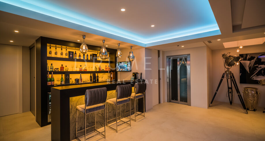 Take a panoramic lift to the roof terrace, fully equipped with every conceivable luxury incl. a pool sized Jacuzzi, bar, VIP-area with romantic open-air cinema, chill-out area and the legendary top of the range professional BBQ. Invite your guests to join the adventure and marvel at the majesty of La Concha Mountain, or look out across the peaceful Mediterranean towards Africa.