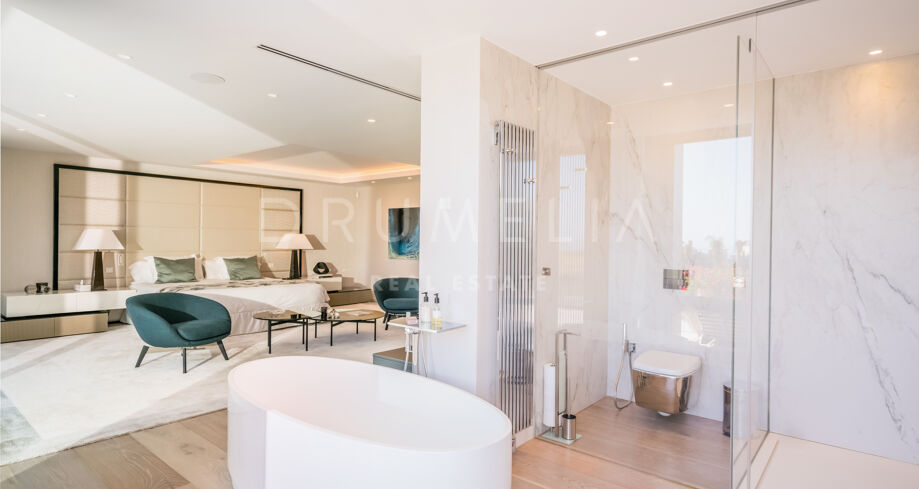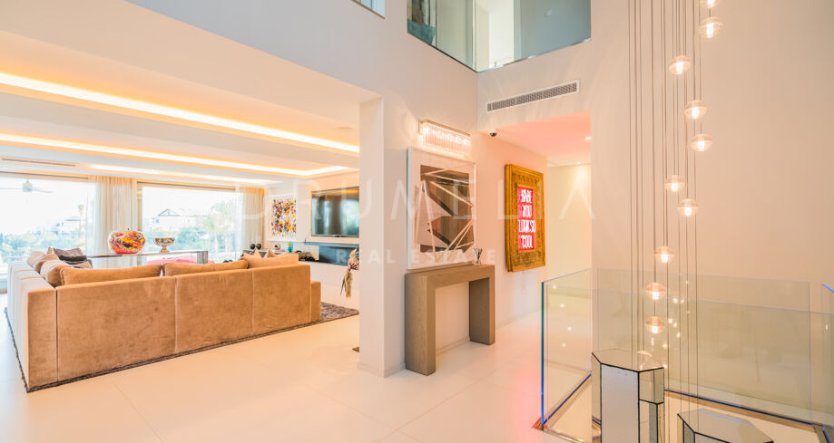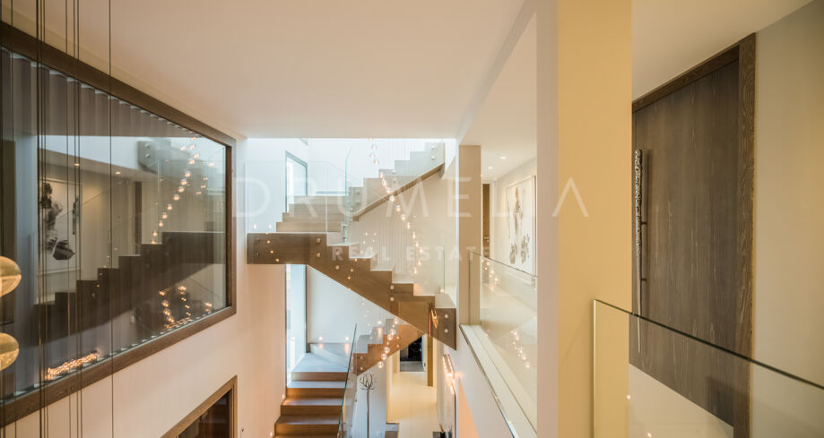 Enter through the bespoke over-sized doorway and you will be immediately impressed by natural symmetry of the space, choice of materials and top quality of the build and fabulous interior design, abundant natural light rising to the full height of the property and fascinating sophisticated light design, contemporary staircases that go far beyond just functionality, open plan spaces blending seamlessly onto the vast terraces of 500 m², an exterior extension of living areas for fantastic al fresco time.