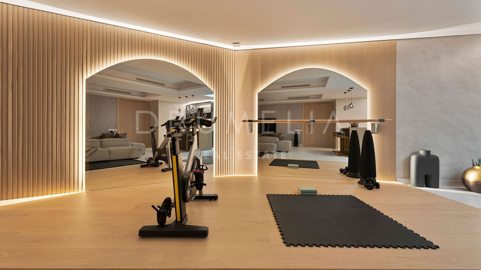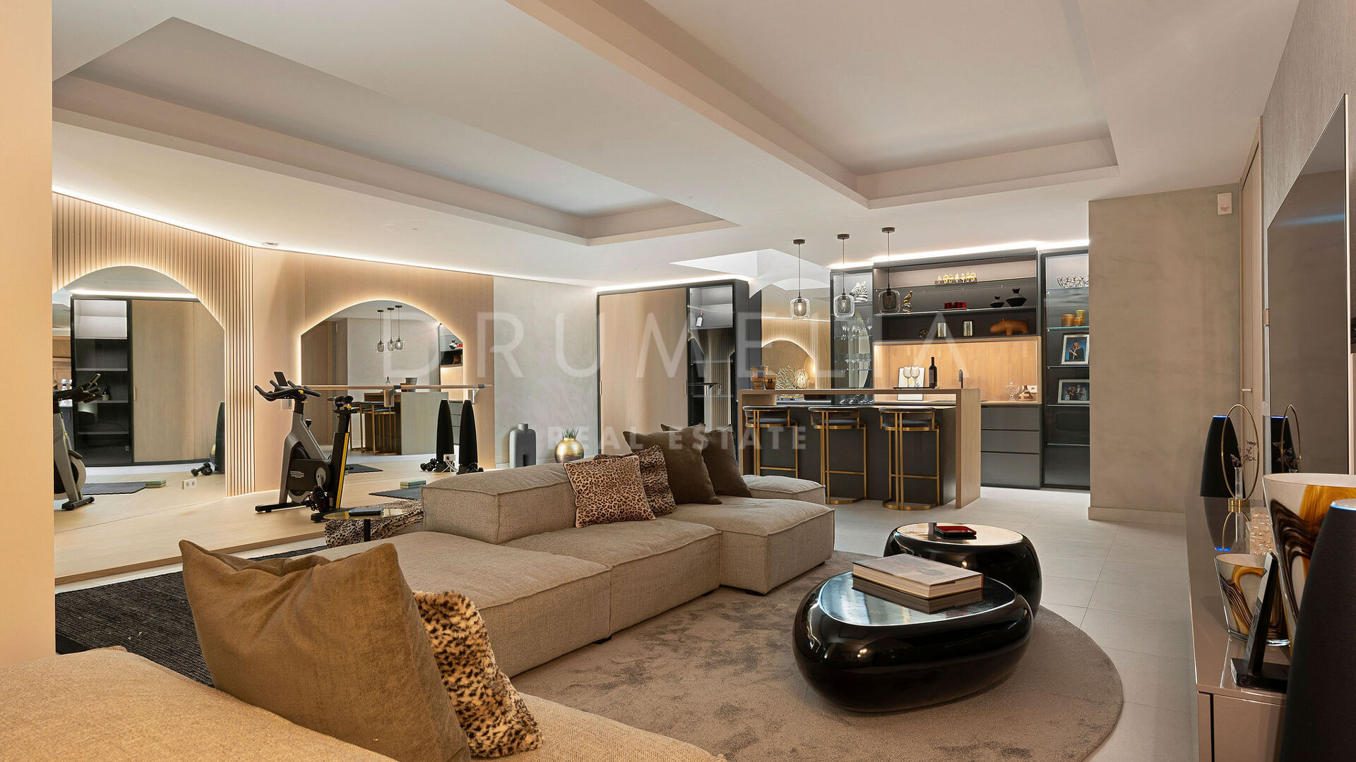 The lower level includes a gym, entertainment space, and a private garage with capacity for two cars. Outdoor areas feature covered and uncovered terraces, ideal for year-round living, and a private pool.