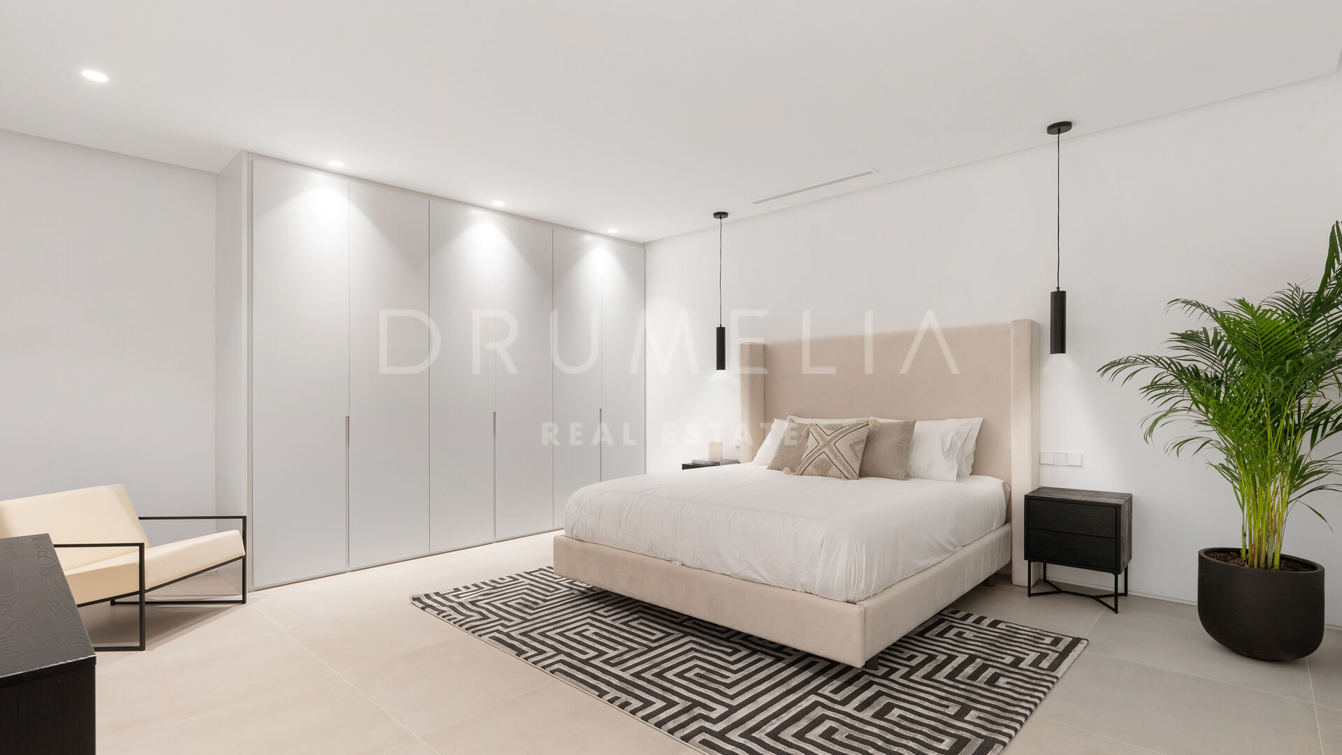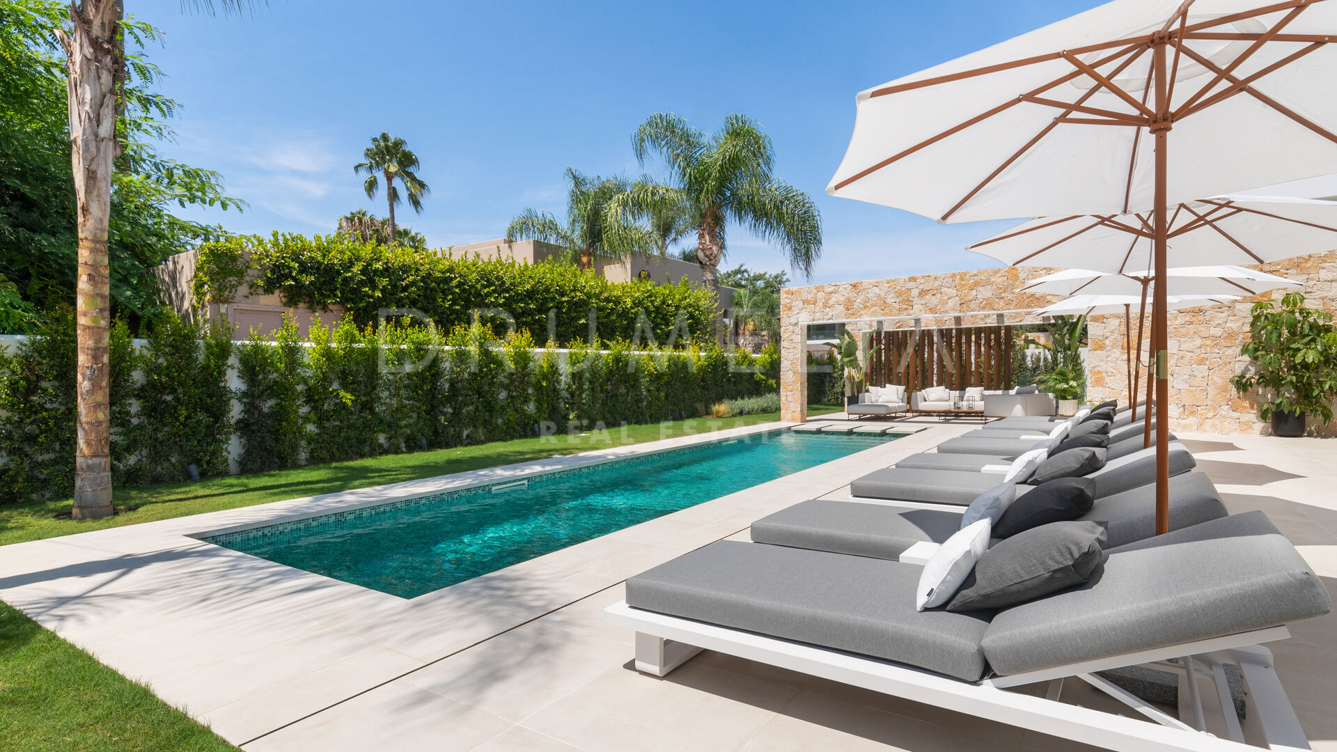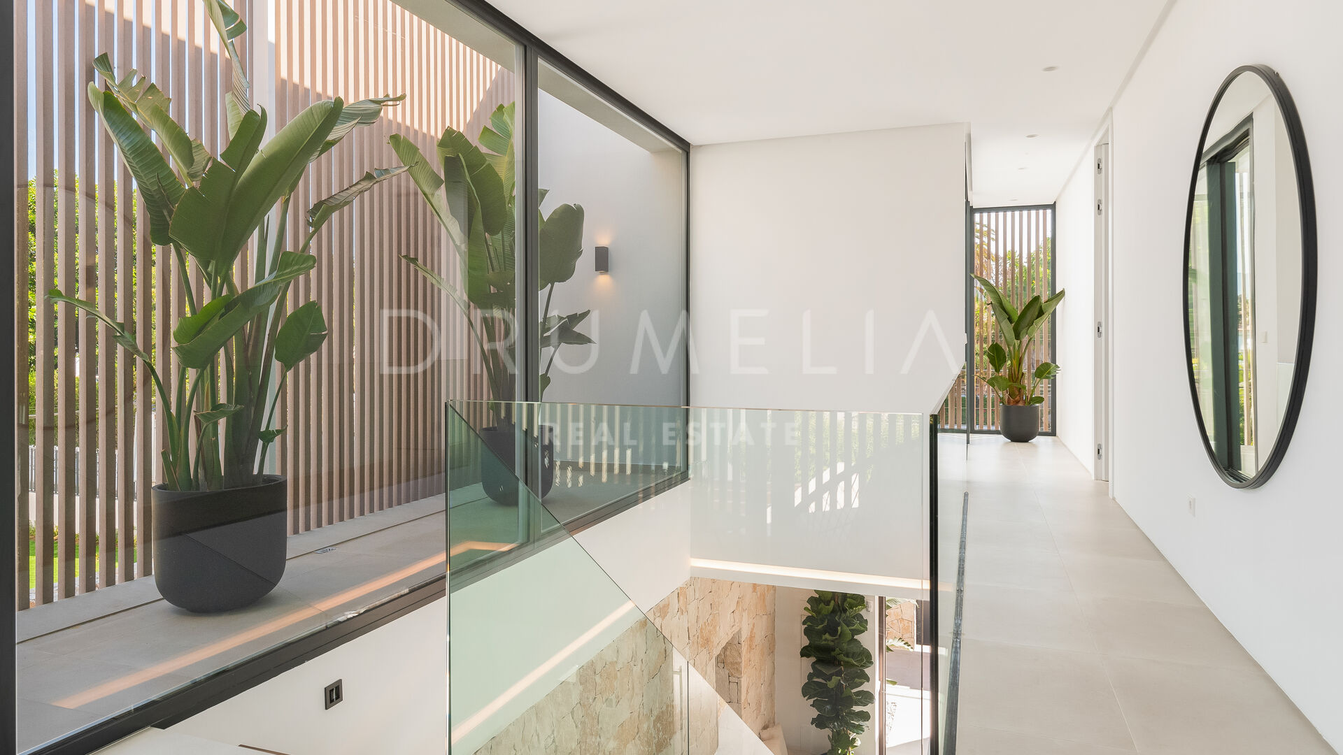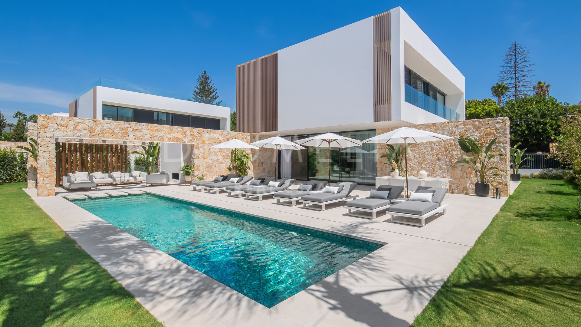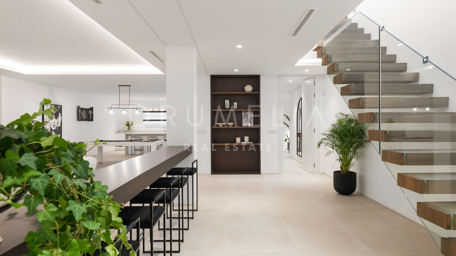 A spectacular contemporary-style 6-bedroom house is offered for sale in a much sought-after community situated in the lovely and well-established seaside area of Cortijo Blanco, in San Pedro de Alcantara. Part of a special exclusive collection of beautiful designer villas, it comes fully ready for you to move in and enjoy the glorious Marbella lifestyle. Cortijo Blanco is one of the original historic districts of Marbella, with the Hotel Cortijo opened in 1961 as an artistic enclave that attracted a number of famous painters, writers, actors and filmmakers, including Jean Cocteau. This is a quiet and peaceful neighbourhood where you can walk to the Mediterranean Sea (3-min from the house to the beach) and to fabulous Puerto Banus (15 min stroll). You can go shopping or dining without need to drive. The area offers excellent international schools, supermarkets, sports and social clubs, beach bars and restaurants. Golf enthusiasts will find 7 golf courses within a radius of 5 km.