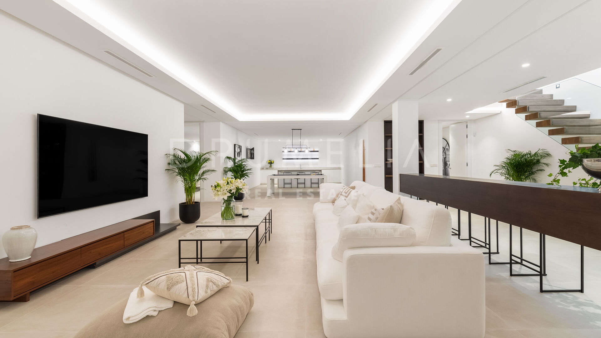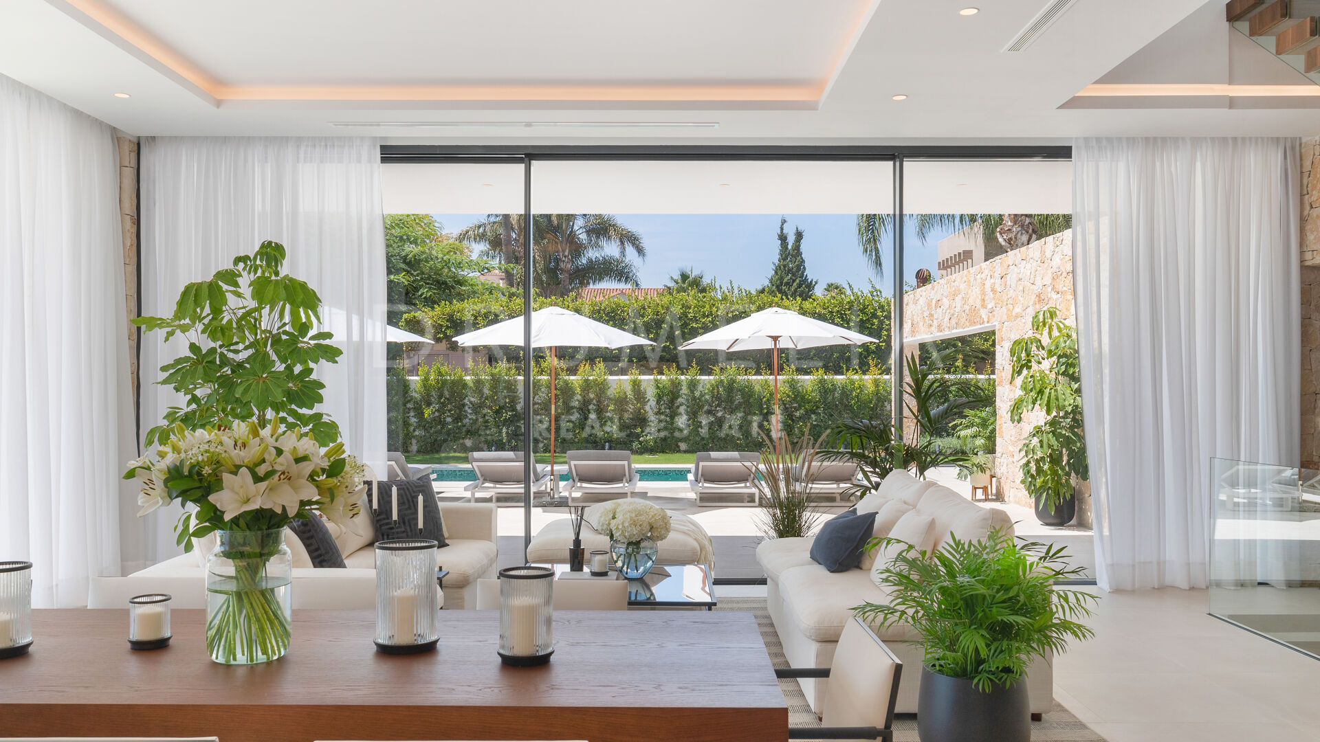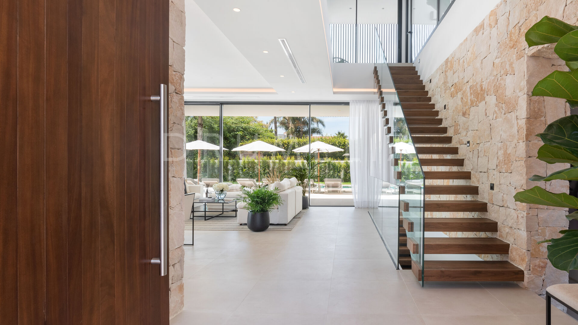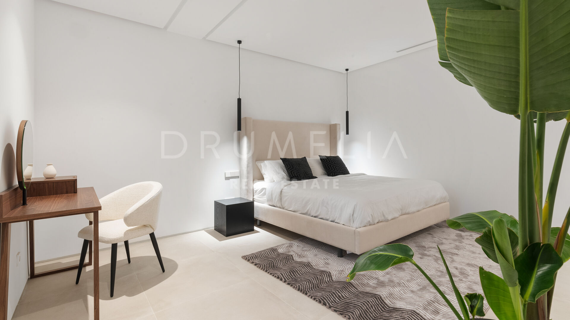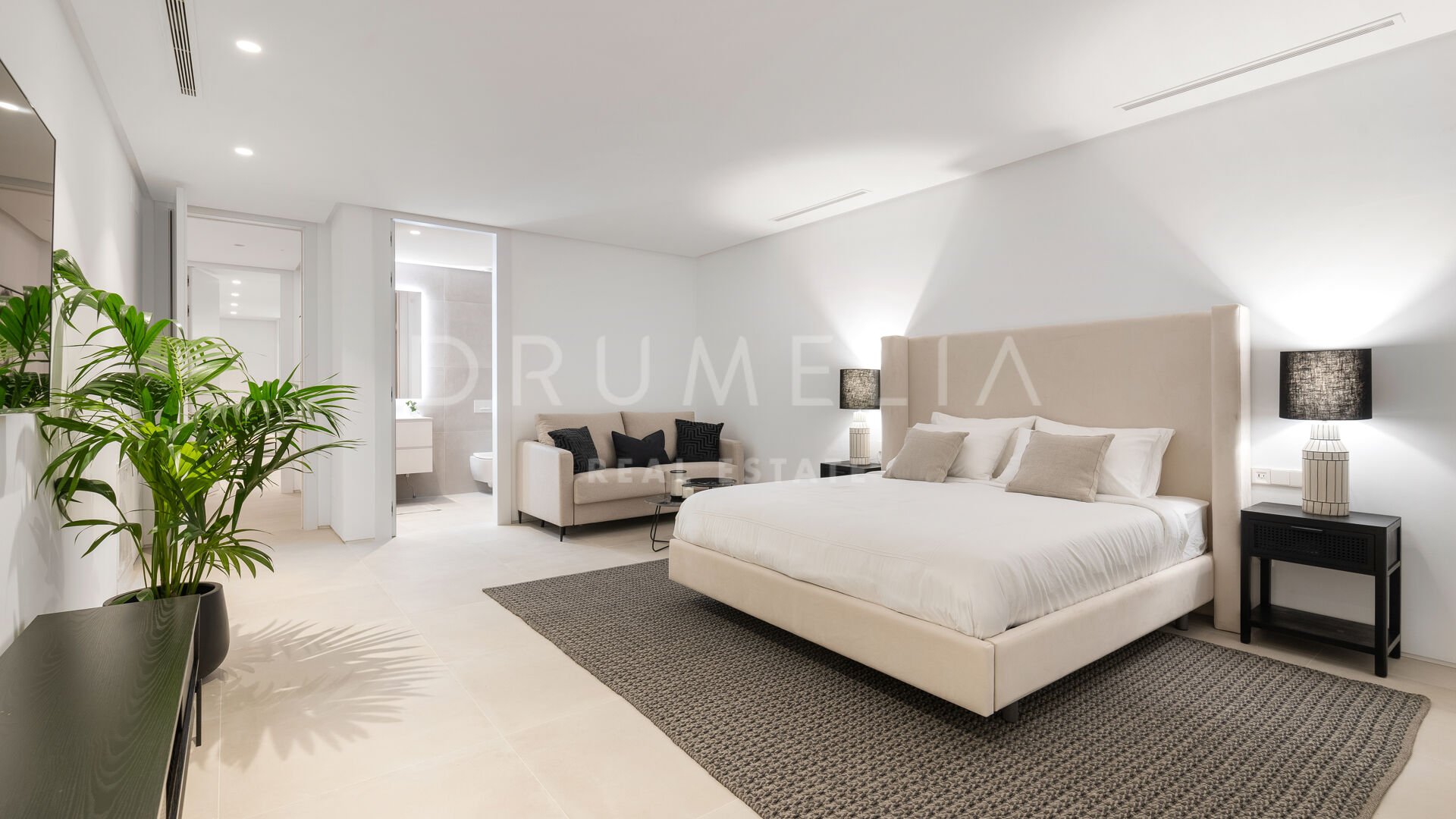 A spectacular contemporary-style 6-bedroom house is offered for sale in a much sought-after community situated in the lovely and well-established seaside area of Cortijo Blanco, in San Pedro de Alcantara. Part of a special exclusive collection of beautiful designer villas, it comes fully ready for you to move in and enjoy the glorious Marbella lifestyle. Cortijo Blanco is one of the original historic districts of Marbella, with the Hotel Cortijo opened in 1961 as an artistic enclave that attracted a number of famous painters, writers, actors and filmmakers, including Jean Cocteau. This is a quiet and peaceful neighbourhood where you can walk to the Mediterranean Sea (3-min from the house to the beach) and to fabulous Puerto Banus (15 min stroll). You can go shopping or dining without need to drive. The area offers excellent international schools, supermarkets, sports and social clubs, beach bars and restaurants. Golf enthusiasts will find 7 golf courses within a radius of 5 km.