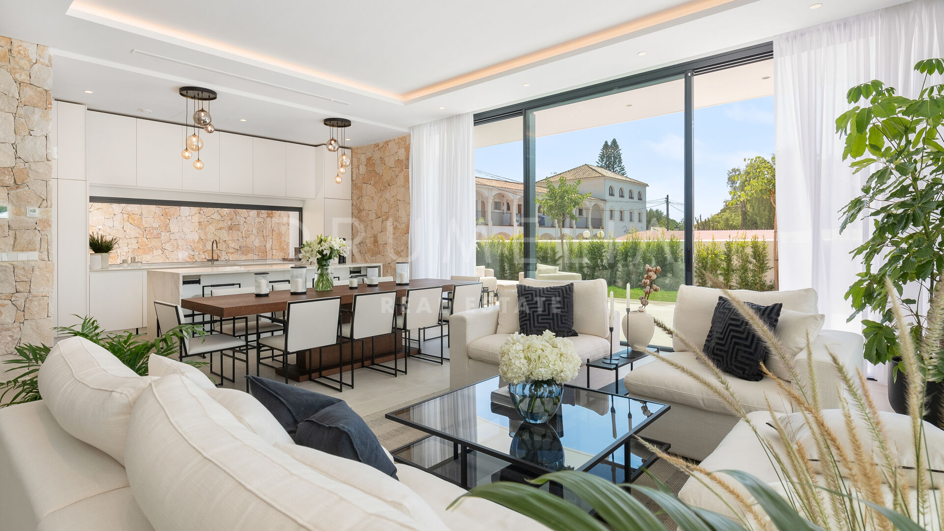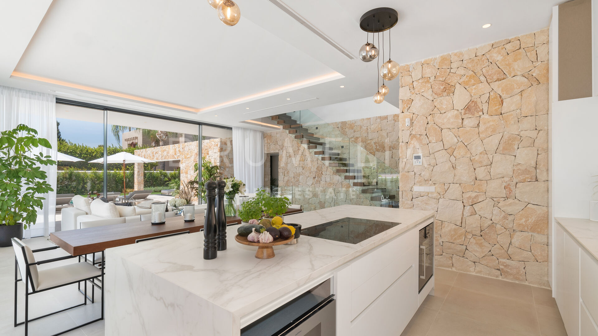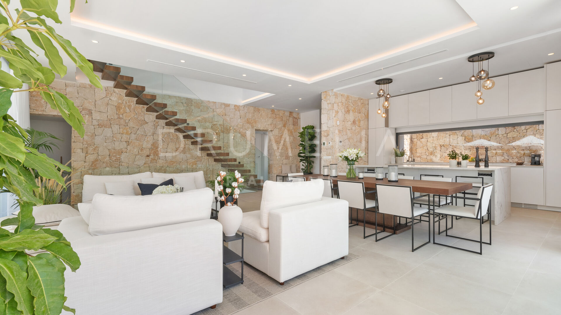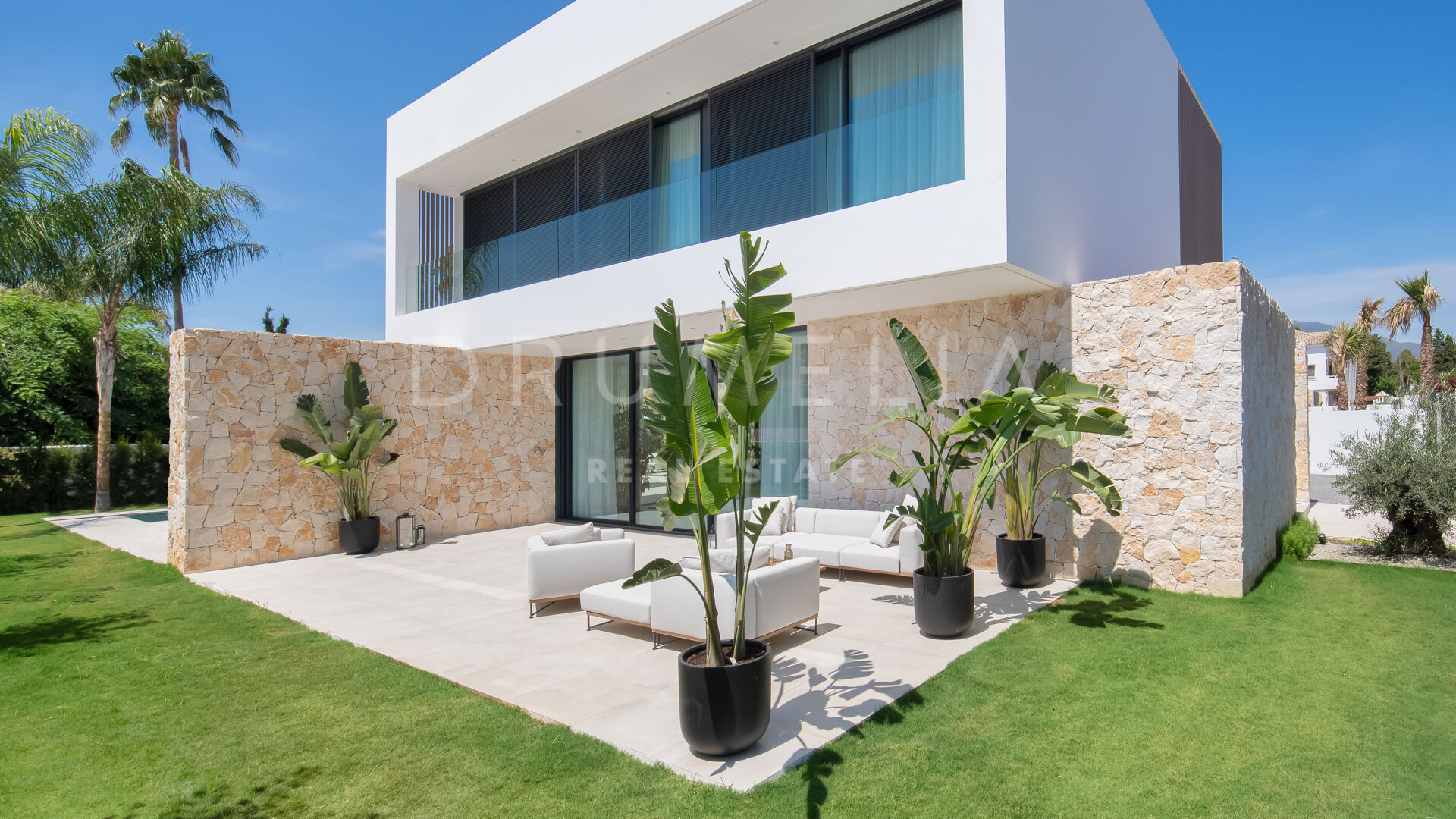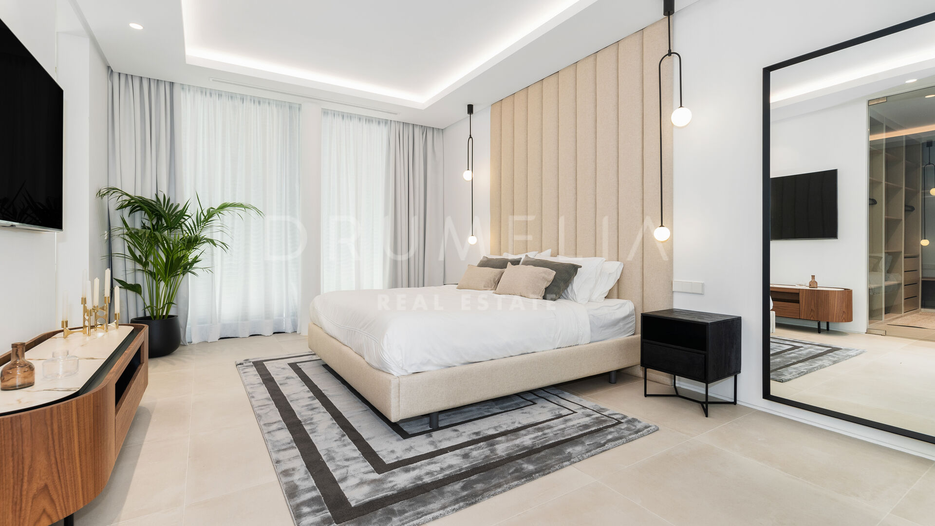 A spectacular contemporary-style 6-bedroom house is offered for sale in a much sought-after community situated in the lovely and well-established seaside area of Cortijo Blanco, in San Pedro de Alcantara. Part of a special exclusive collection of beautiful designer villas, it comes fully ready for you to move in and enjoy the glorious Marbella lifestyle. Cortijo Blanco is one of the original historic districts of Marbella, with the Hotel Cortijo opened in 1961 as an artistic enclave that attracted a number of famous painters, writers, actors and filmmakers, including Jean Cocteau. This is a quiet and peaceful neighbourhood where you can walk to the Mediterranean Sea (3-min from the house to the beach) and to fabulous Puerto Banus (15 min stroll). You can go shopping or dining without need to drive. The area offers excellent international schools, supermarkets, sports and social clubs, beach bars and restaurants. Golf enthusiasts will find 7 golf courses within a radius of 5 km.