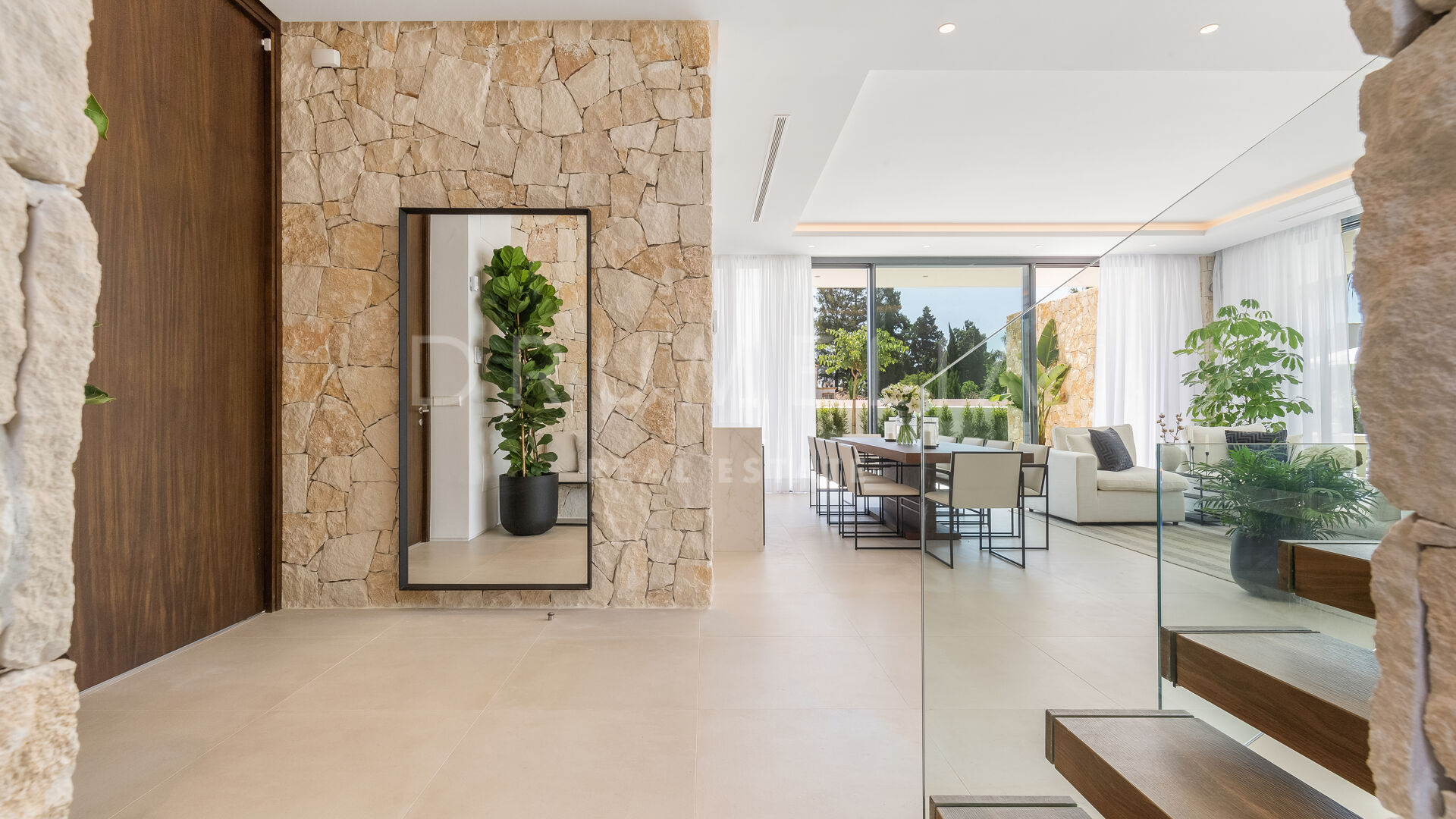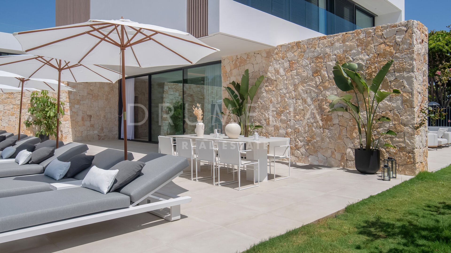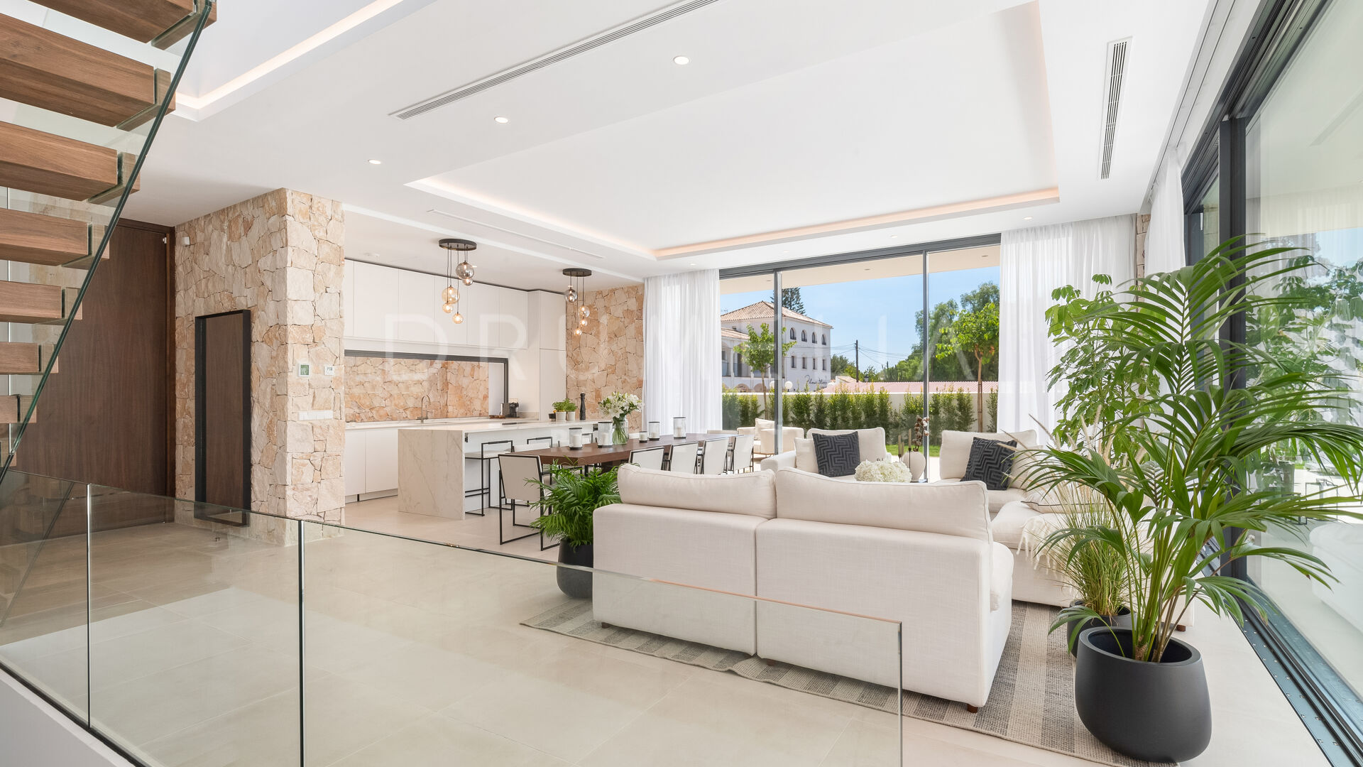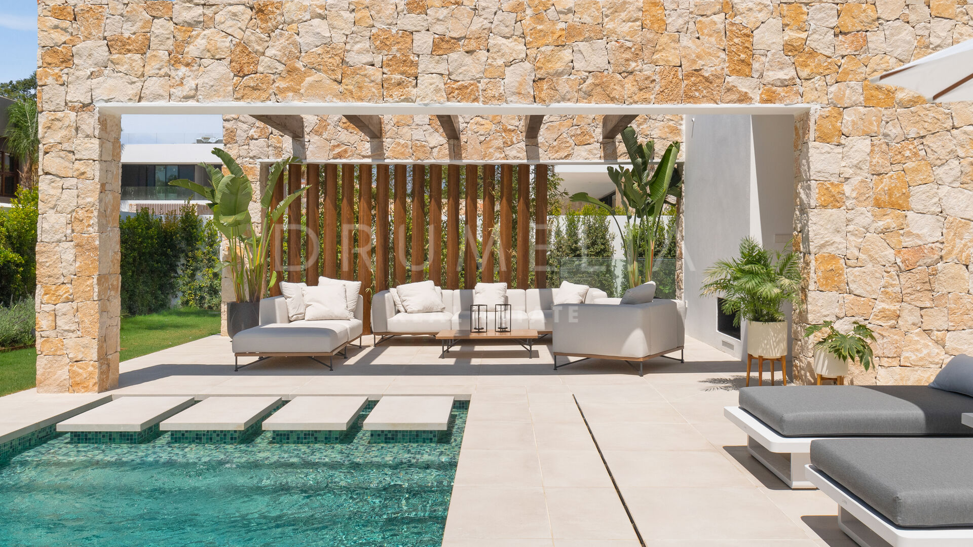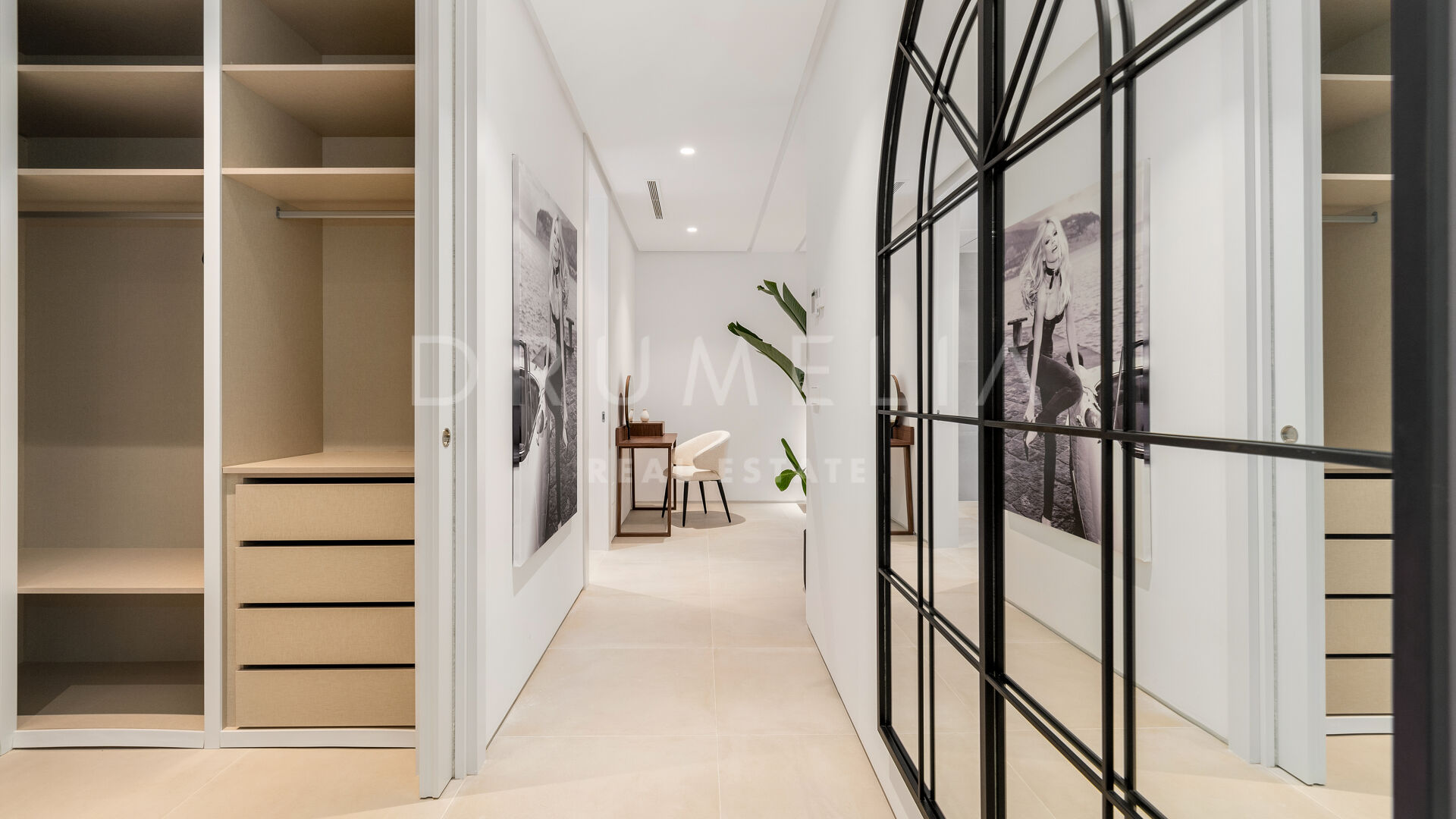 A spectacular contemporary-style 6-bedroom house is offered for sale in a much sought-after community situated in the lovely and well-established seaside area of Cortijo Blanco, in San Pedro de Alcantara. Part of a special exclusive collection of beautiful designer villas, it comes fully ready for you to move in and enjoy the glorious Marbella lifestyle. Cortijo Blanco is one of the original historic districts of Marbella, with the Hotel Cortijo opened in 1961 as an artistic enclave that attracted a number of famous painters, writers, actors and filmmakers, including Jean Cocteau. This is a quiet and peaceful neighbourhood where you can walk to the Mediterranean Sea (3-min from the house to the beach) and to fabulous Puerto Banus (15 min stroll). You can go shopping or dining without need to drive. The area offers excellent international schools, supermarkets, sports and social clubs, beach bars and restaurants. Golf enthusiasts will find 7 golf courses within a radius of 5 km.