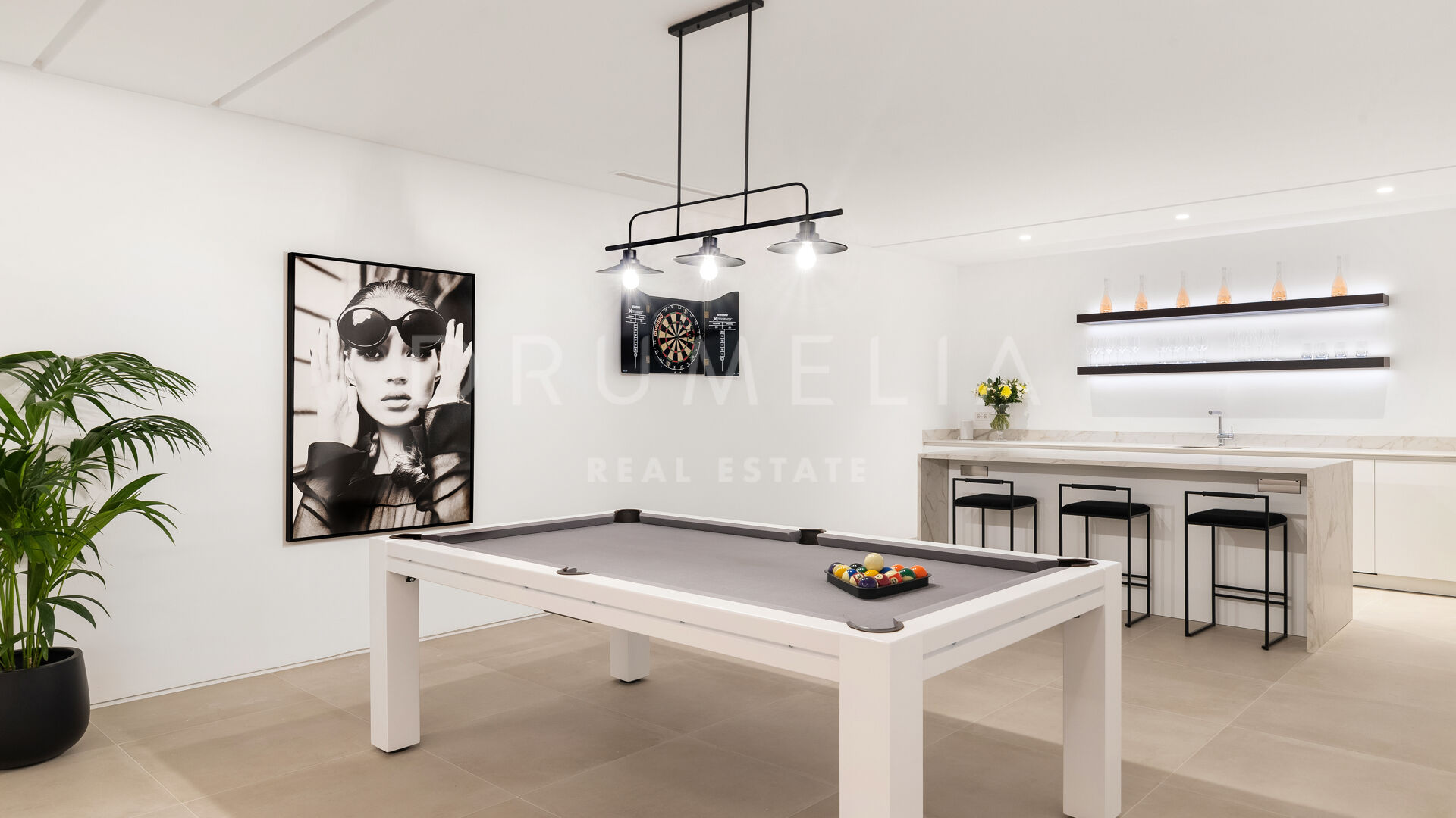 A floating staircase combines the best elements of contemporary design, solid wood and glass railing for a stylish minimalist look. Upstairs, there are 3 bedroom suites. The Master Suite has a bedroom with a large bed, a Smart TV, and a luxurious en-suite bathroom with a shower, bathtub and two sinks. The 2nd bedroom features a double bed and its own bathroom with shower. The 3rd suite has 2 single beds, a built-in wardrobe and a bathroom also with shower. Finally, the 4th and 5th bedroom suites are on the lower level and feature a spacious open-style walk-in closet, fitted wardrobes and own bathrooms. This floor of the family-friendly villa boasts a fun zone complete with a bar, billiard area and TV room.
