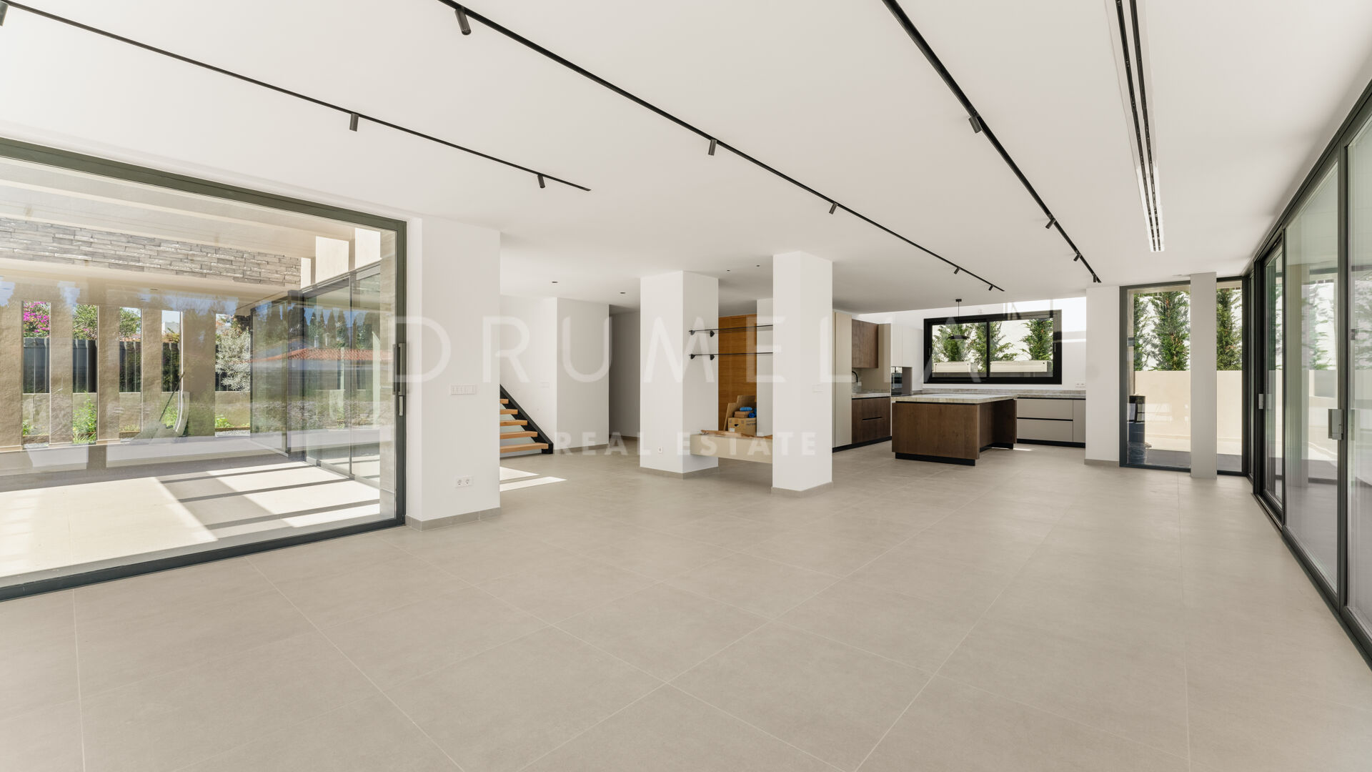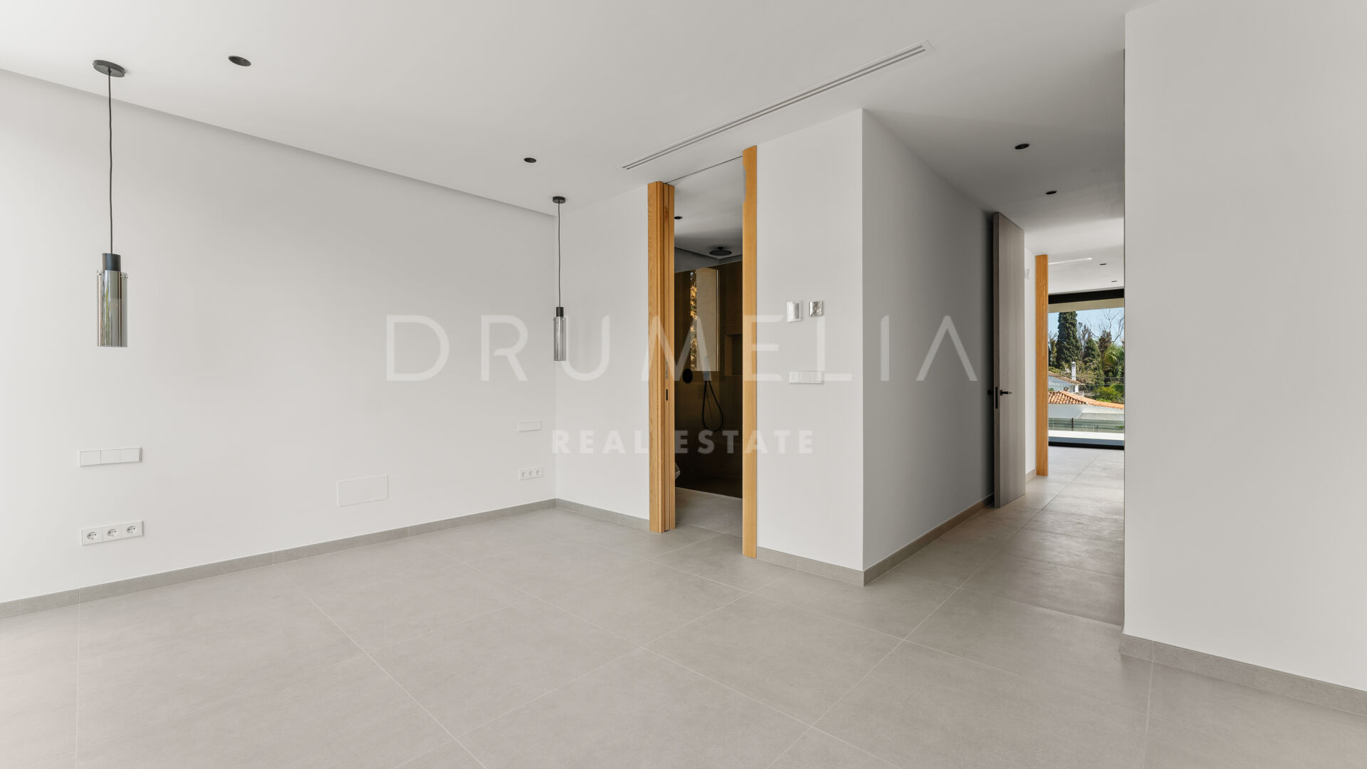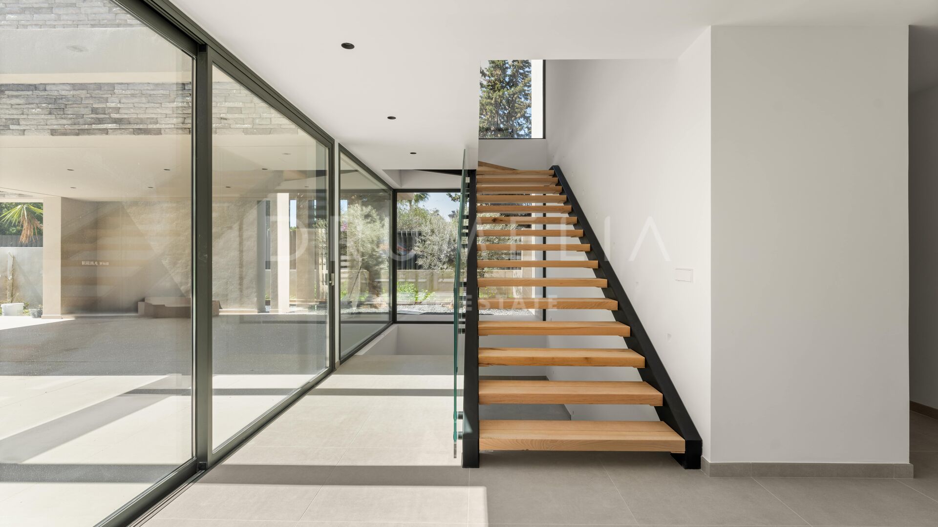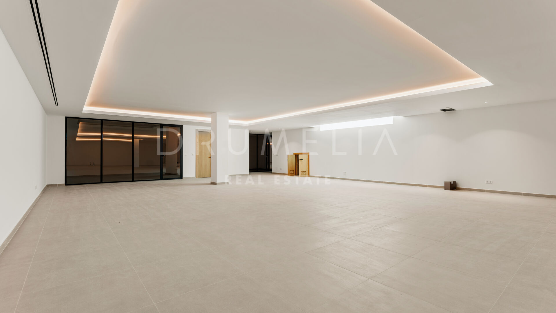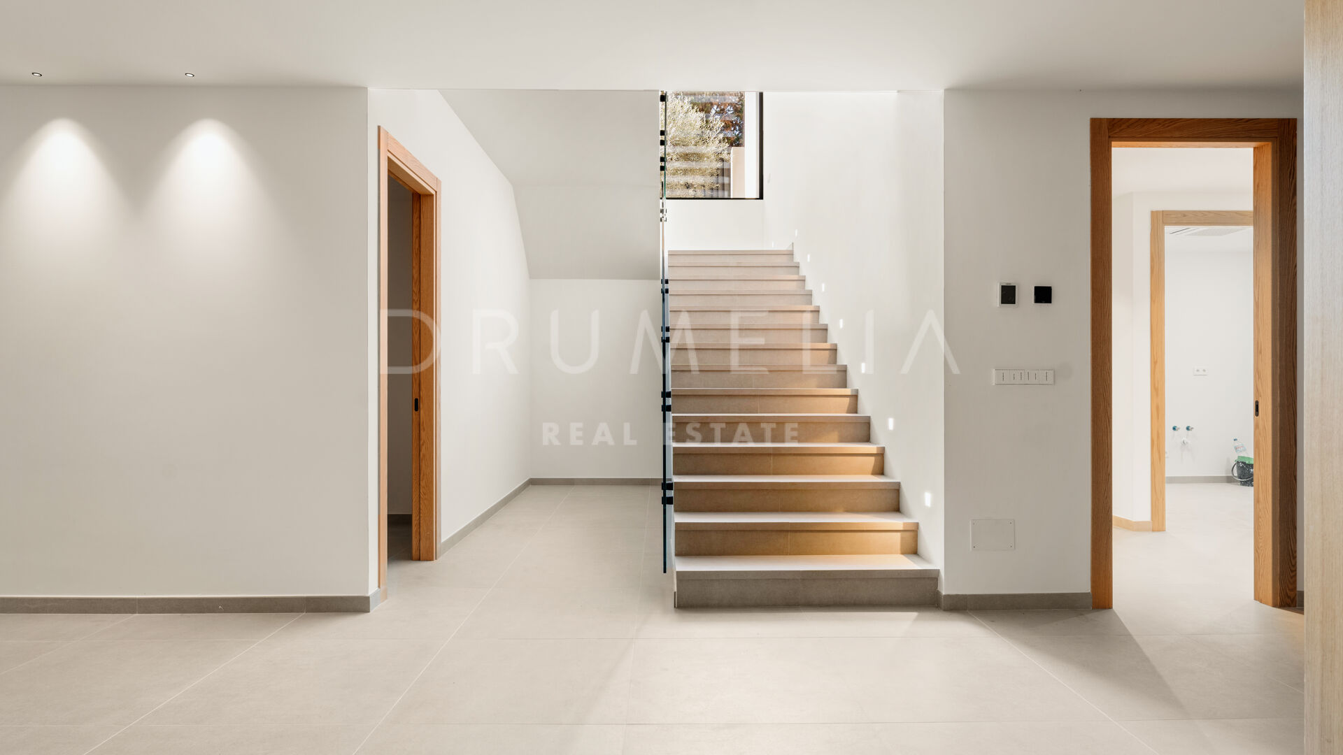 This newly built contemporary villa in Cortijo Blanco, San Pedro features clean lines, open spaces, and high-quality materials. Set on a 1.151 m² plot, the property includes 877 m² of interior space and 273 m² of terraces, designed for seamless indoor-outdoor living.