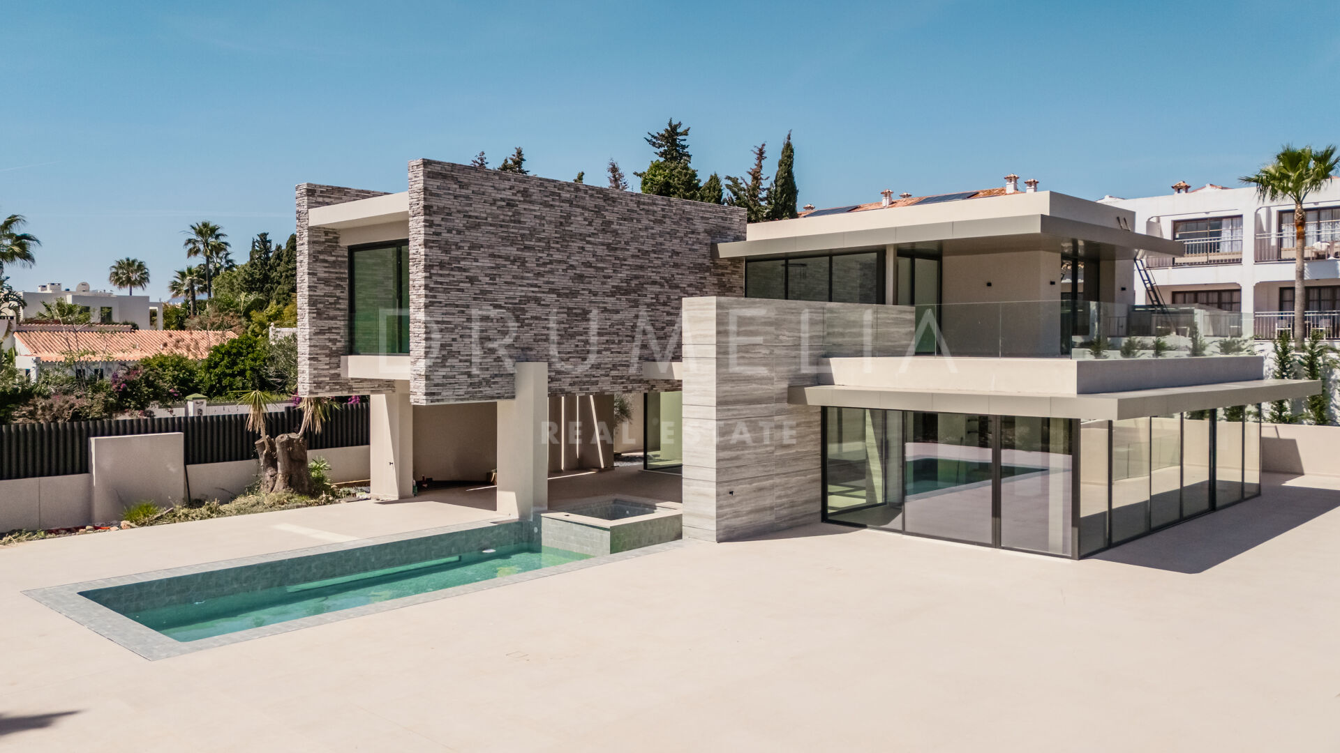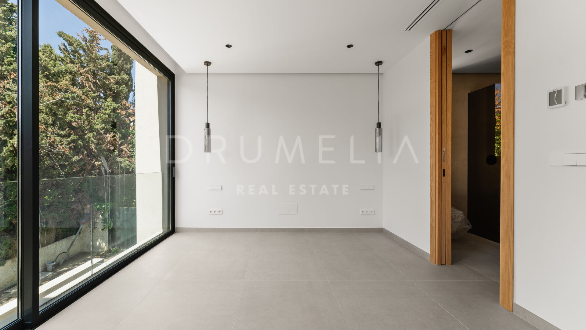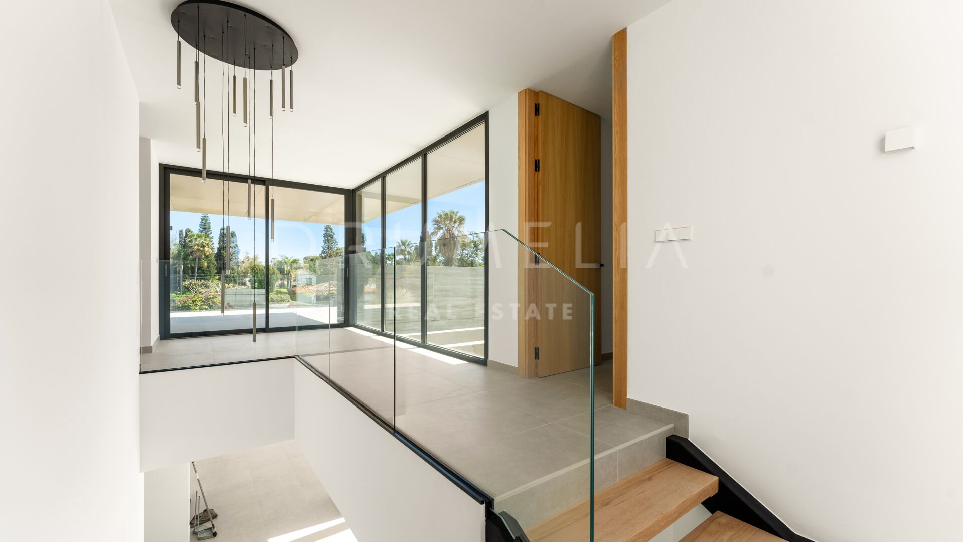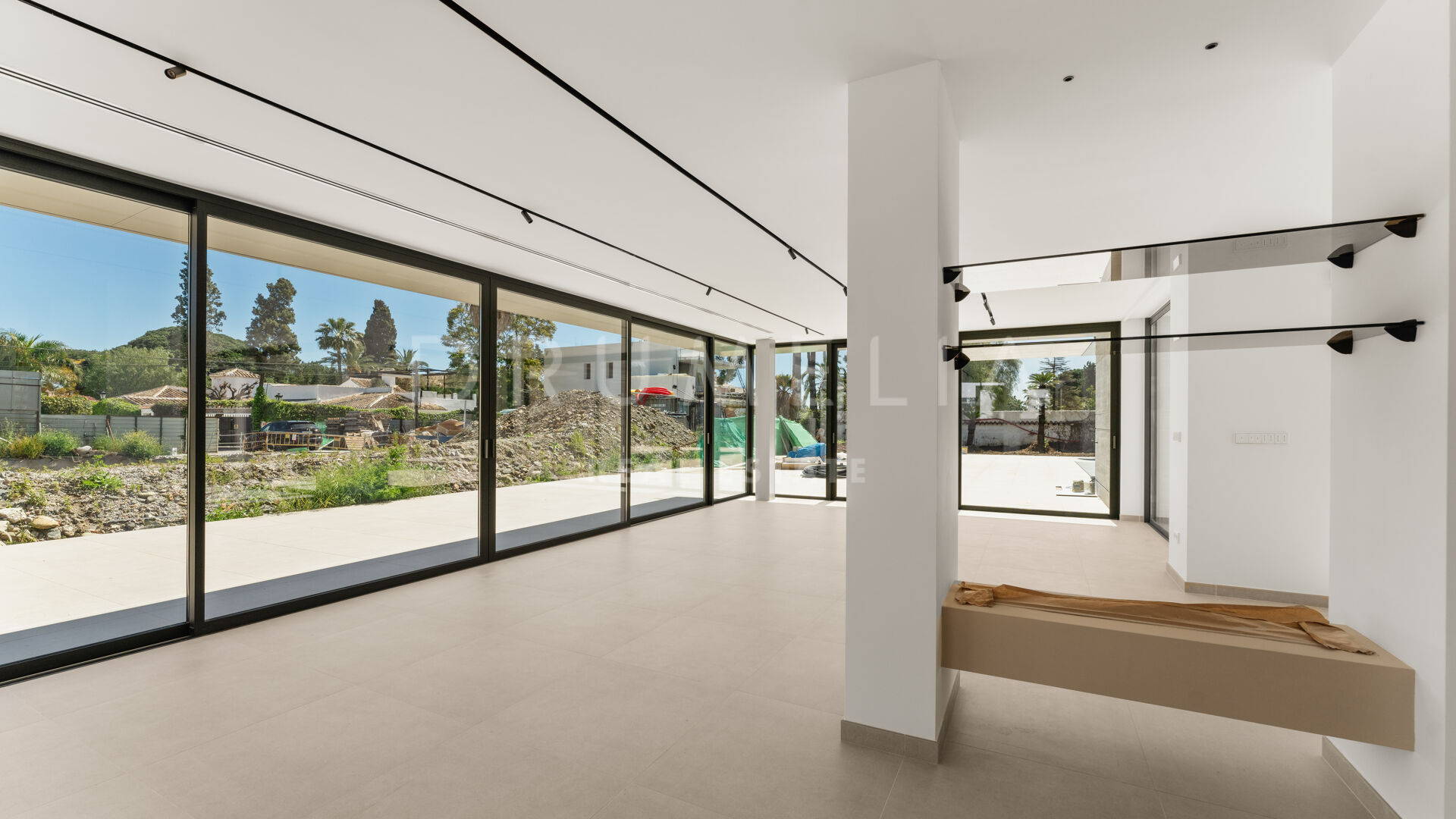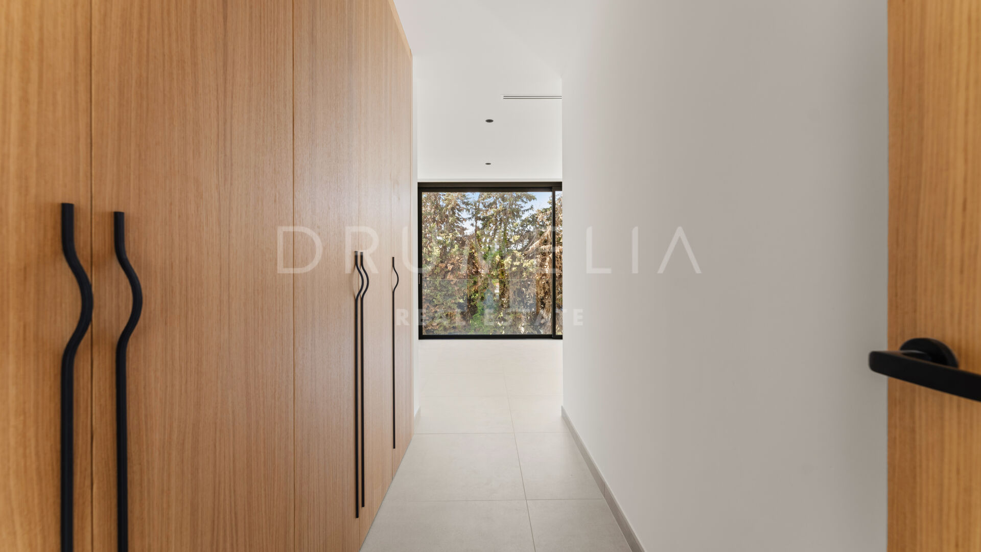 This newly built contemporary villa in Cortijo Blanco, San Pedro features clean lines, open spaces, and high-quality materials. Set on a 1.151 m² plot, the property includes 877 m² of interior space and 273 m² of terraces, designed for seamless indoor-outdoor living.