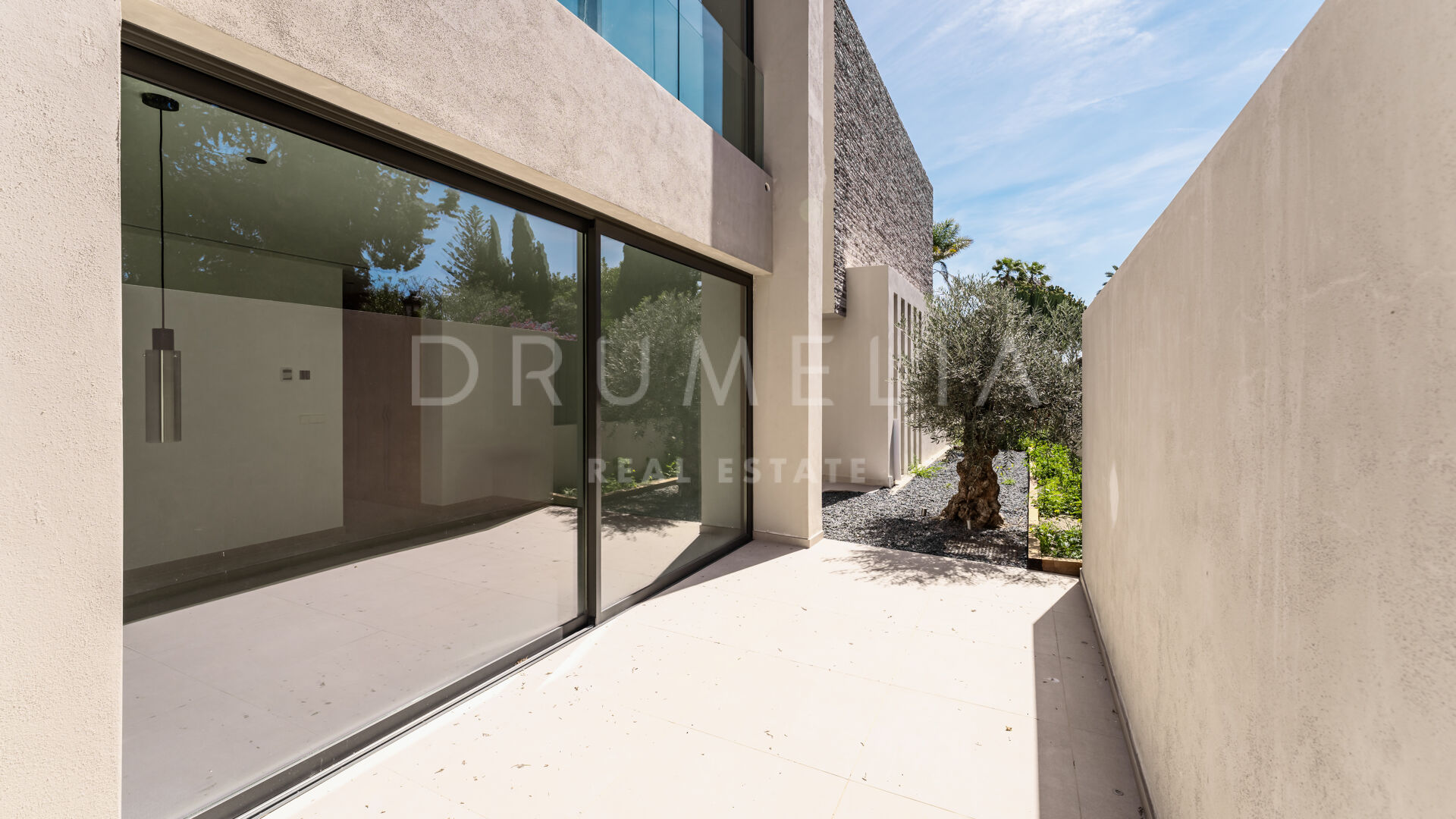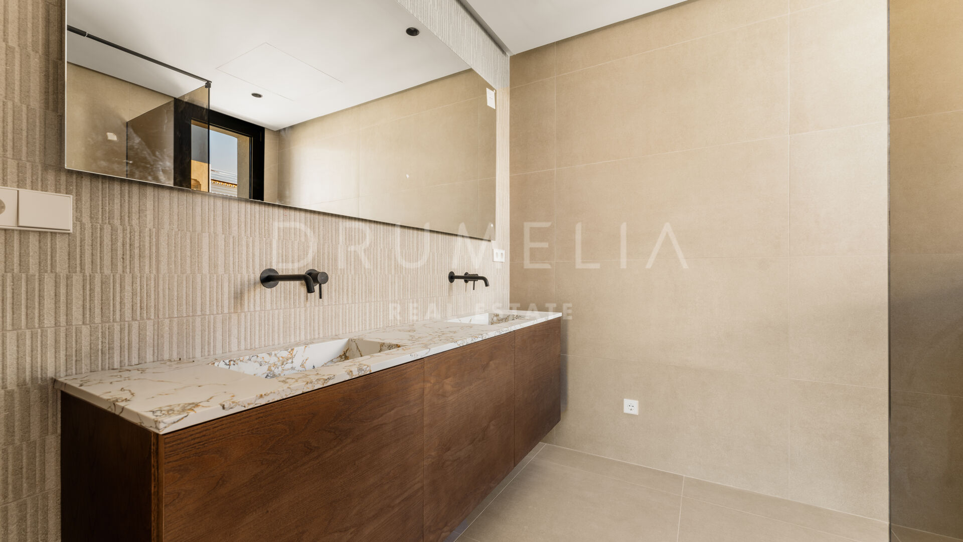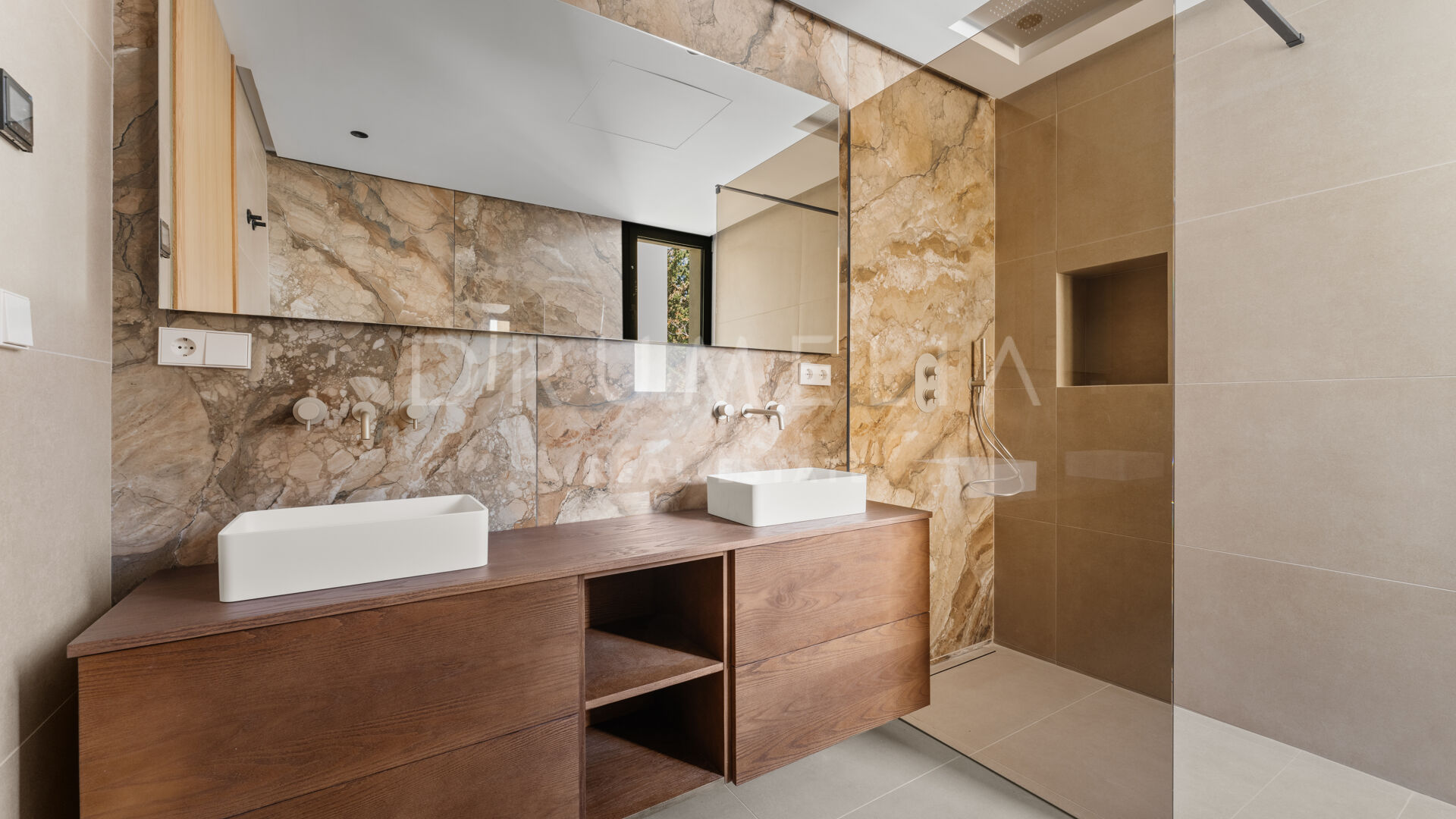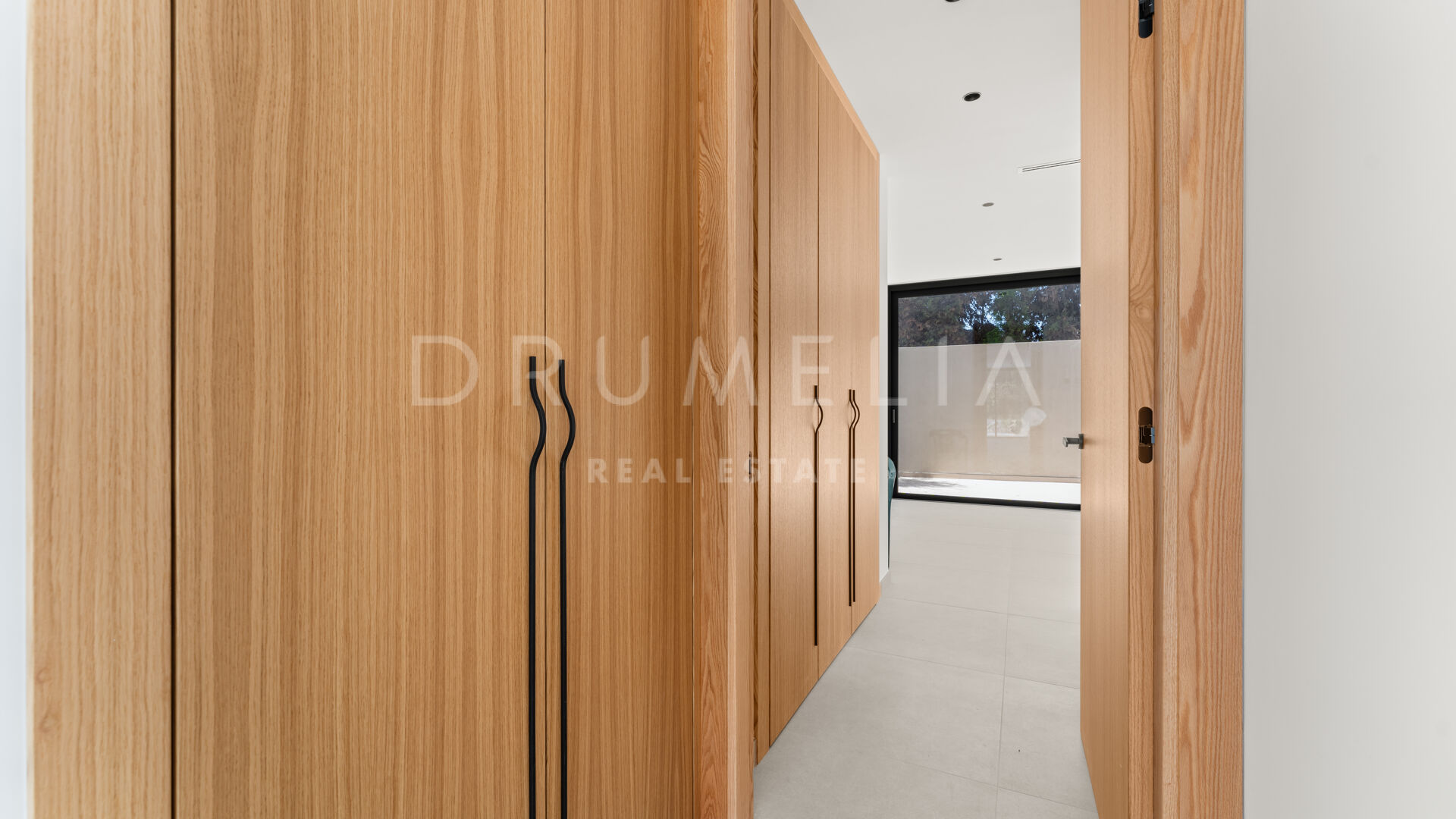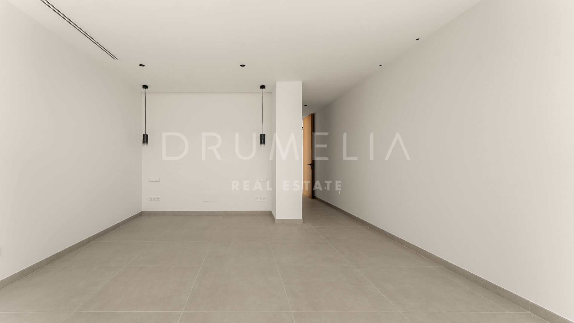 This newly built contemporary villa in Cortijo Blanco, San Pedro features clean lines, open spaces, and high-quality materials. Set on a 1.151 m² plot, the property includes 877 m² of interior space and 273 m² of terraces, designed for seamless indoor-outdoor living.