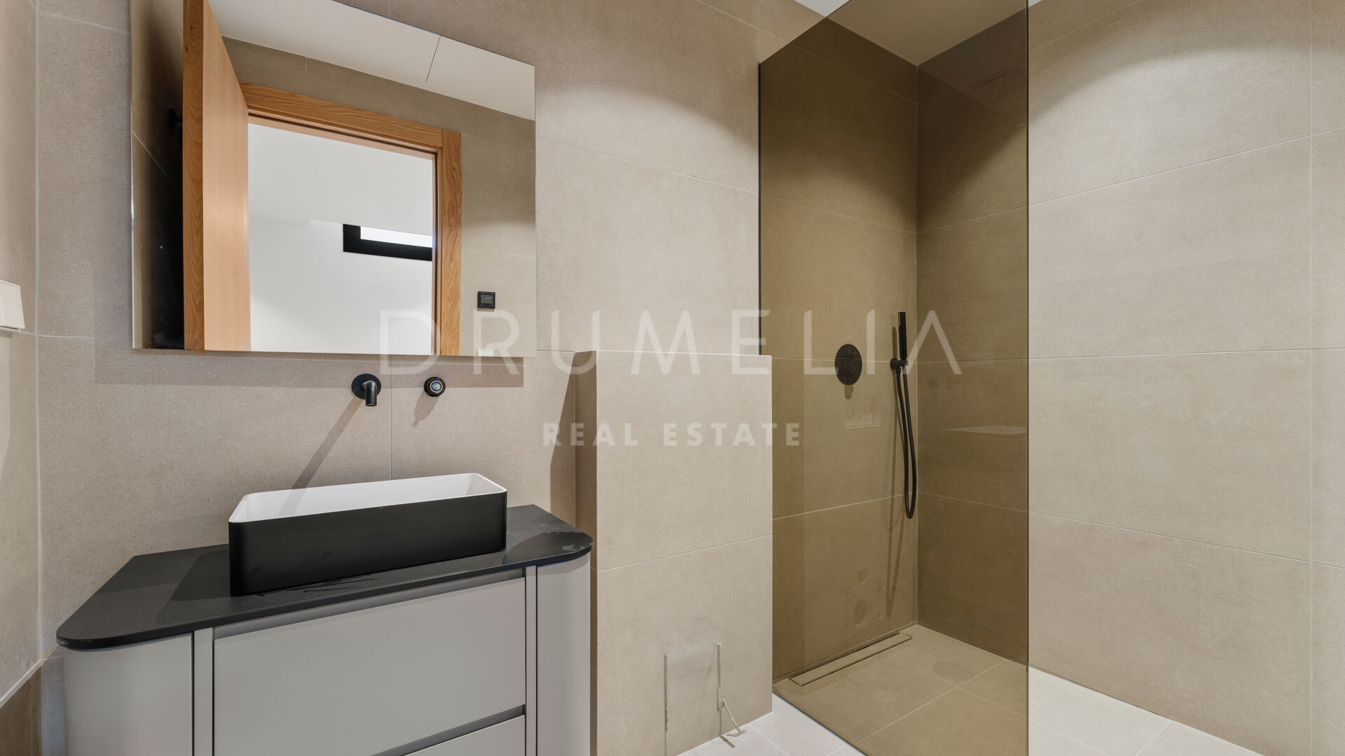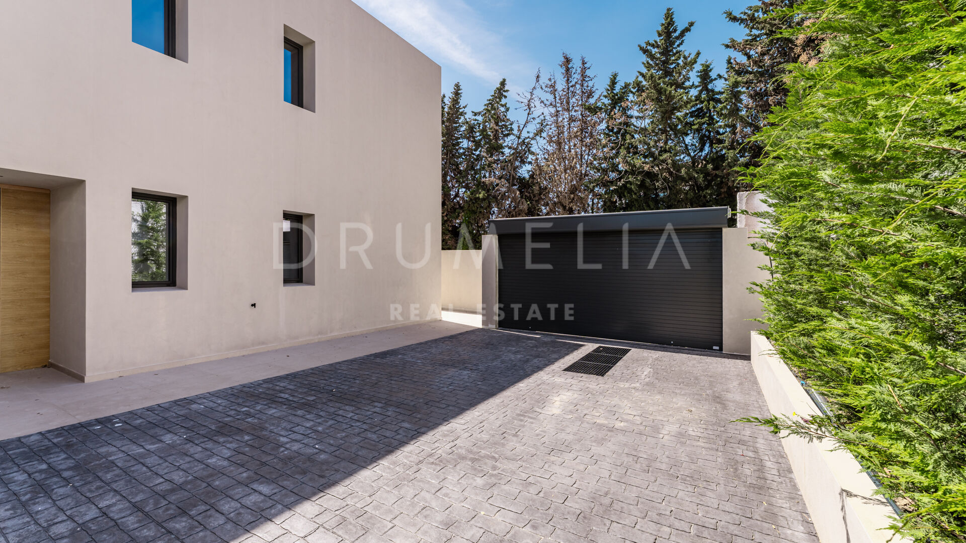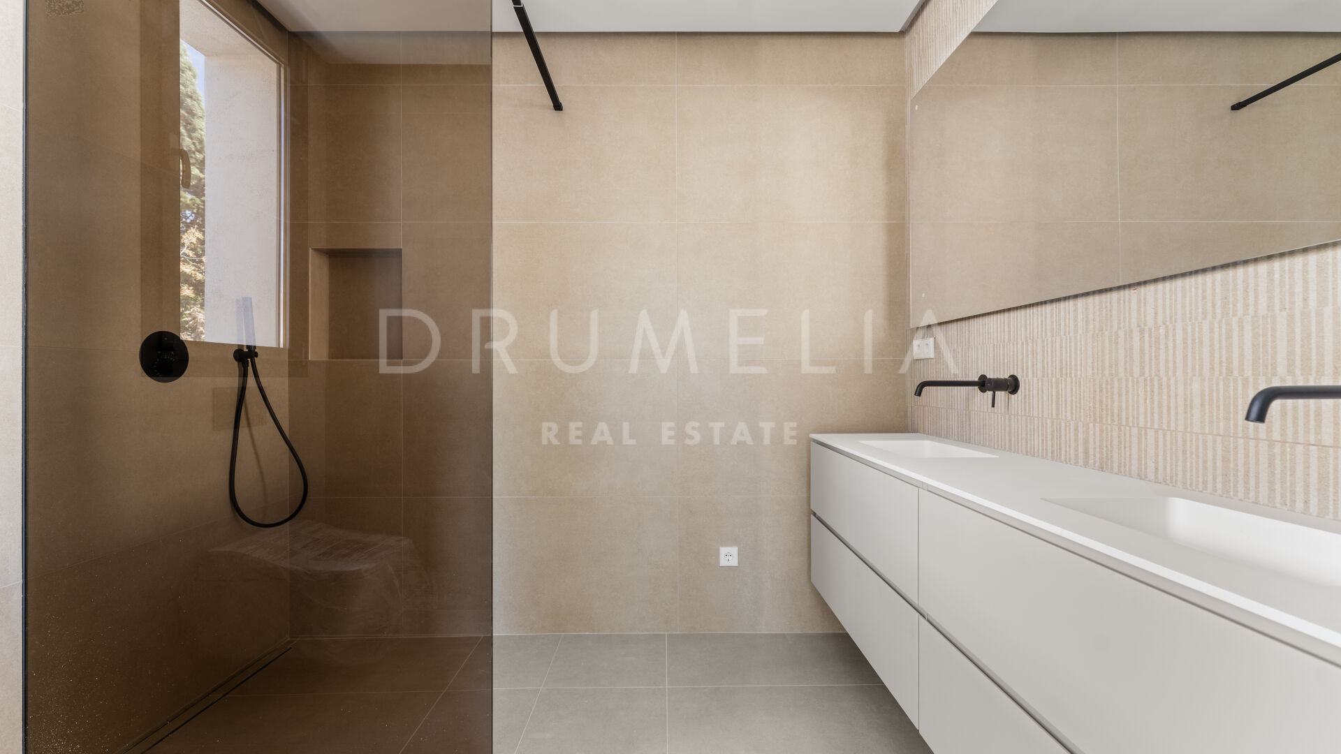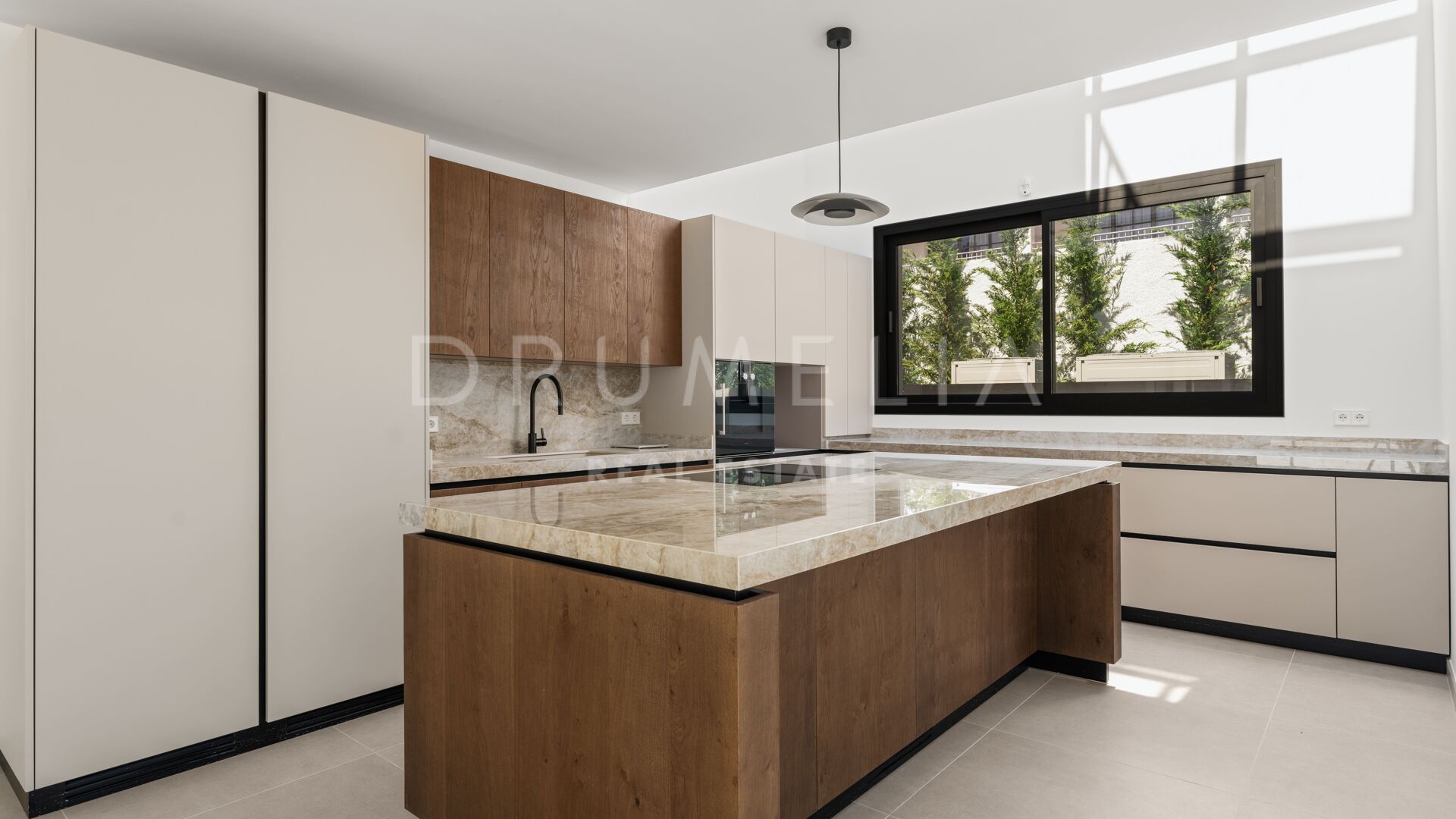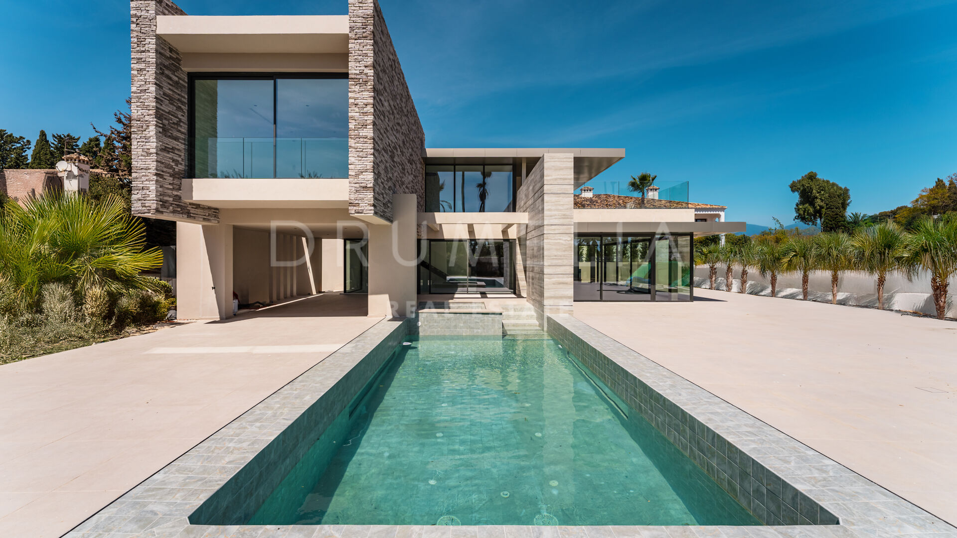 This newly built contemporary villa in Cortijo Blanco, San Pedro features clean lines, open spaces, and high-quality materials. Set on a 1.151 m² plot, the property includes 877 m² of interior space and 273 m² of terraces, designed for seamless indoor-outdoor living.