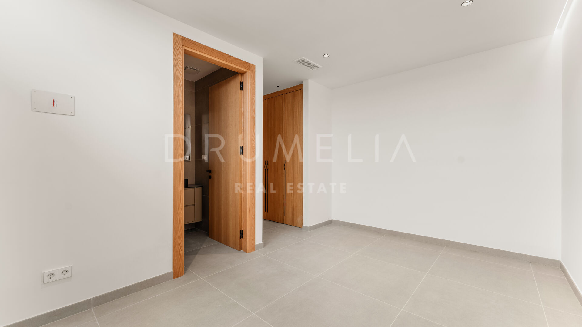 The first floor has three en-suite bedrooms, including the master suite with a private terrace. The other bedrooms have built-in wardrobes and access to outdoor areas.
