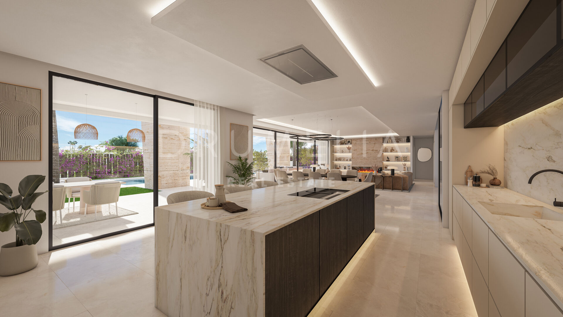 Each villa has been thoughtfully designed with clean architectural lines and spacious, light-filled interiors that seamlessly connect to landscaped gardens, private swimming pools, and rooftop solariums with jacuzzis. The interiors feature five en-suite bedrooms, generous open-plan living and dining areas, and versatile basements that can be adapted into gyms, cinemas, or additional living spaces. Fully furnished with interior design by La Albaida, the homes are finished to an exceptional standard, incorporating aerothermal climate systems, smart home technology, underfloor heating, and large-format natural stone flooring.