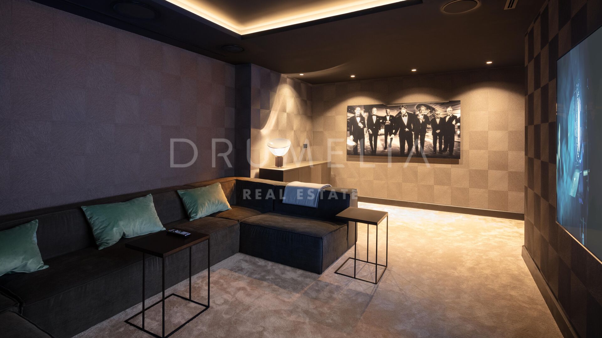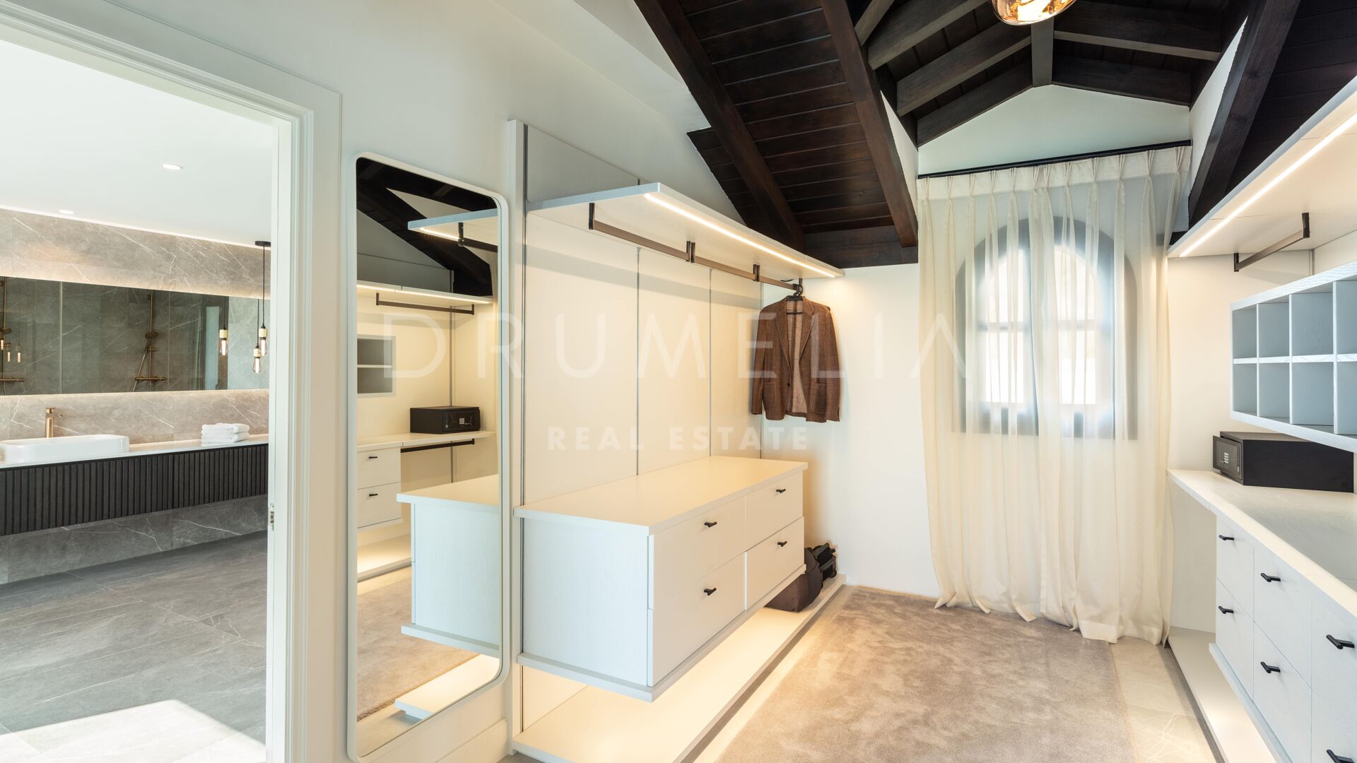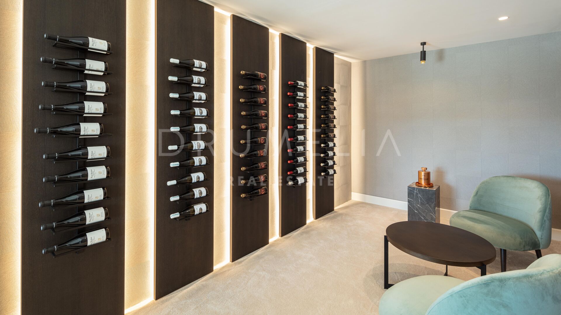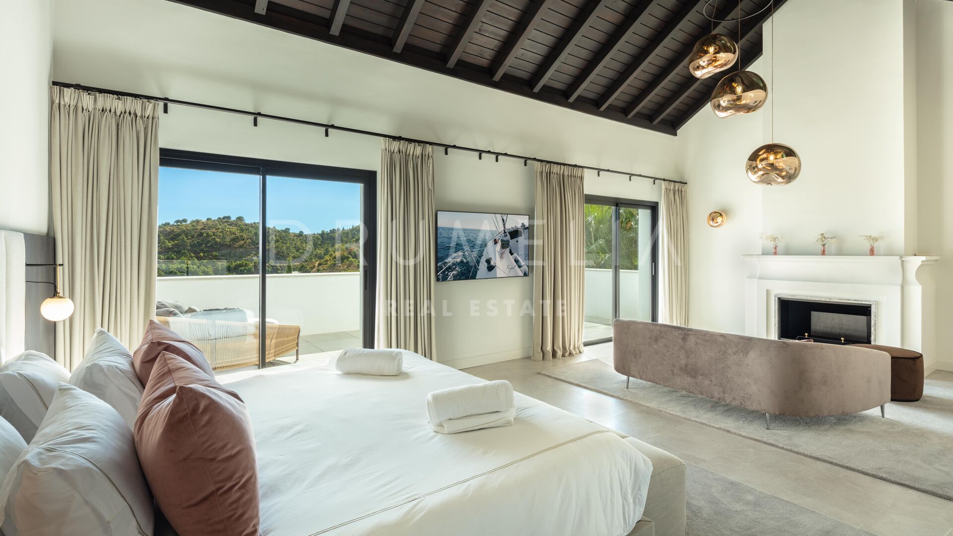 The open floor plan and elegant interiors create a harmonious and welcoming living and dining room environment, with classic fireplaces all connected to the terraces. A fully fitted, large and beautiful kitchen has quality appliances, a massive island and an exit to the terrace as well. Upstairs, the large Master suite boasts a special charm and extraordinary views from this level. It has oak-panelled ceilings, a lounge area, a marbled bathroom for ‘him’ and ‘her’ and a freestanding tub, a custom-made walk-in closet and a private terrace. The property also hosts 4 further bedroom suites, an impressive welcoming hall, a bodega wall, 2 guest toilets, a fully equipped gym, a cinema and game room, utility, storage and laundry areas. It also offers the best of outdoor living: spacious covered and uncovered terraces, a landscaped garden with lush vegetation, a heated swimming pool with incorporated water features, Jacuzzi and BBQ with an outdoor dining area. Perfect for the most exclusive, glorious Mediterranean lifestyle!