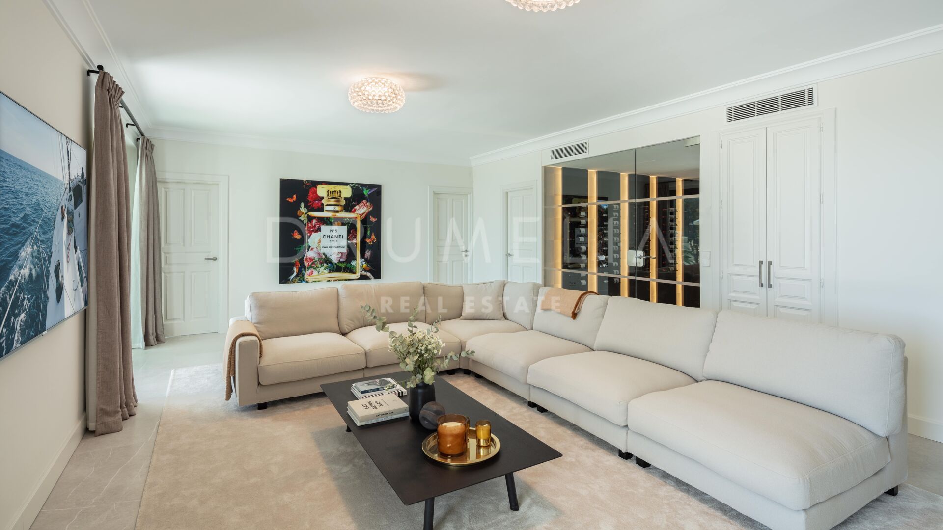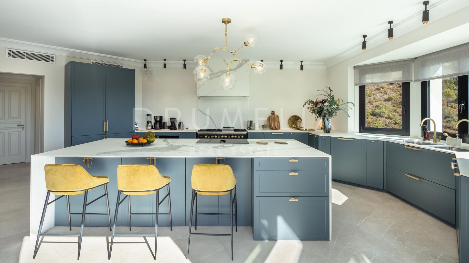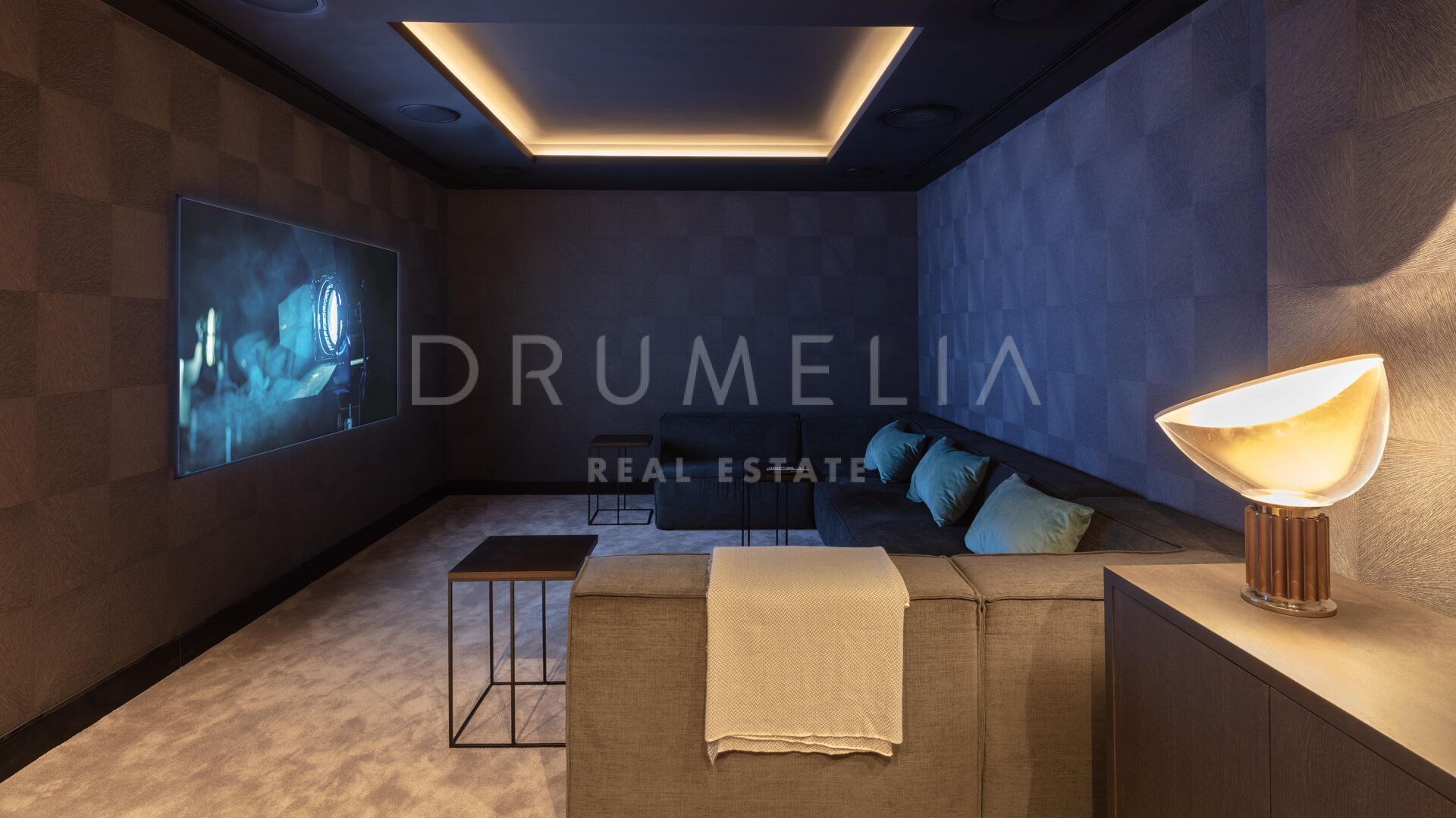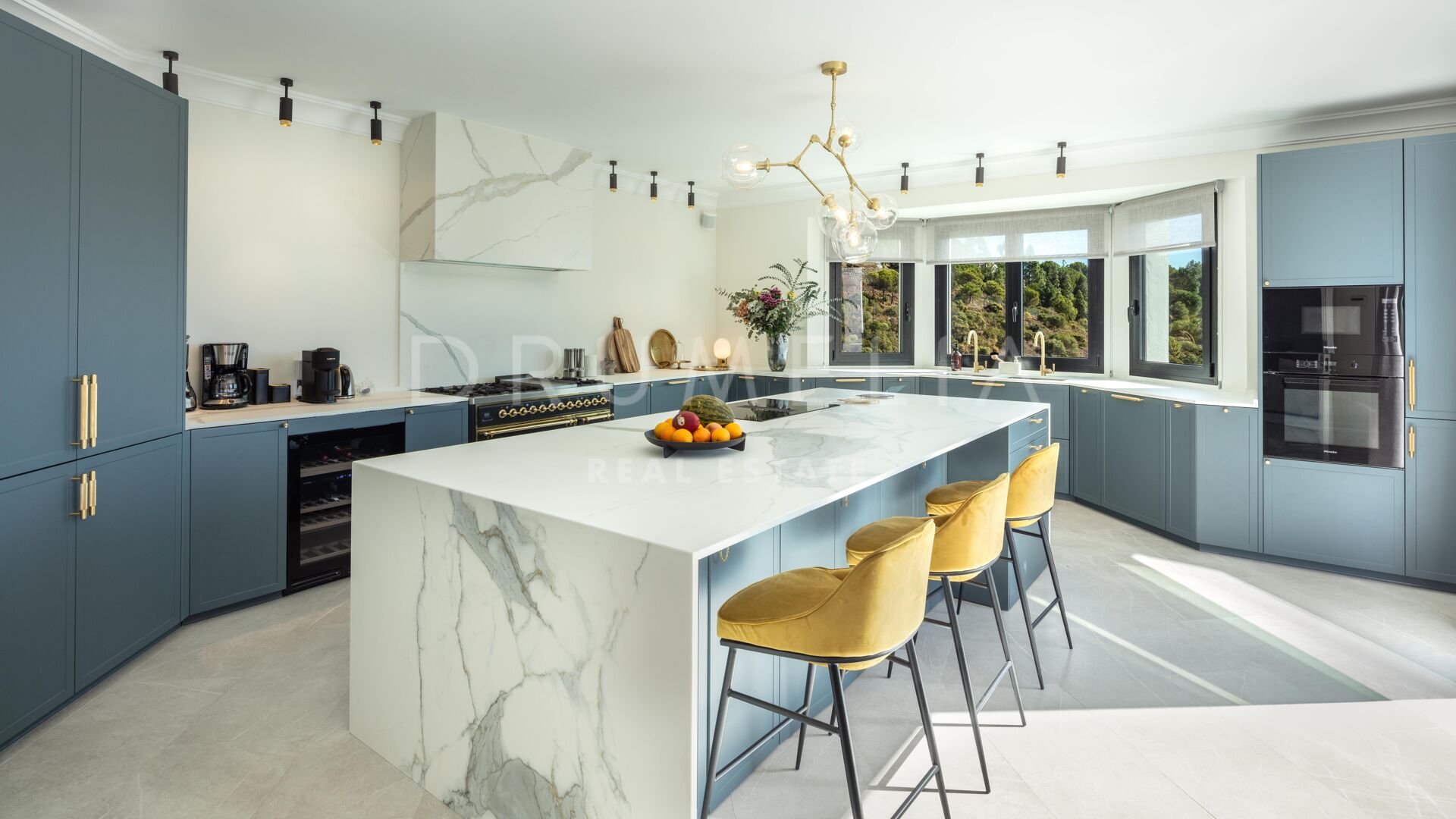 The open floor plan and elegant interiors create a harmonious and welcoming living and dining room environment, with classic fireplaces all connected to the terraces. A fully fitted, large and beautiful kitchen has quality appliances, a massive island and an exit to the terrace as well. Upstairs, the large Master suite boasts a special charm and extraordinary views from this level. It has oak-panelled ceilings, a lounge area, a marbled bathroom for ‘him’ and ‘her’ and a freestanding tub, a custom-made walk-in closet and a private terrace. The property also hosts 4 further bedroom suites, an impressive welcoming hall, a bodega wall, 2 guest toilets, a fully equipped gym, a cinema and game room, utility, storage and laundry areas. It also offers the best of outdoor living: spacious covered and uncovered terraces, a landscaped garden with lush vegetation, a heated swimming pool with incorporated water features, Jacuzzi and BBQ with an outdoor dining area. Perfect for the most exclusive, glorious Mediterranean lifestyle!
