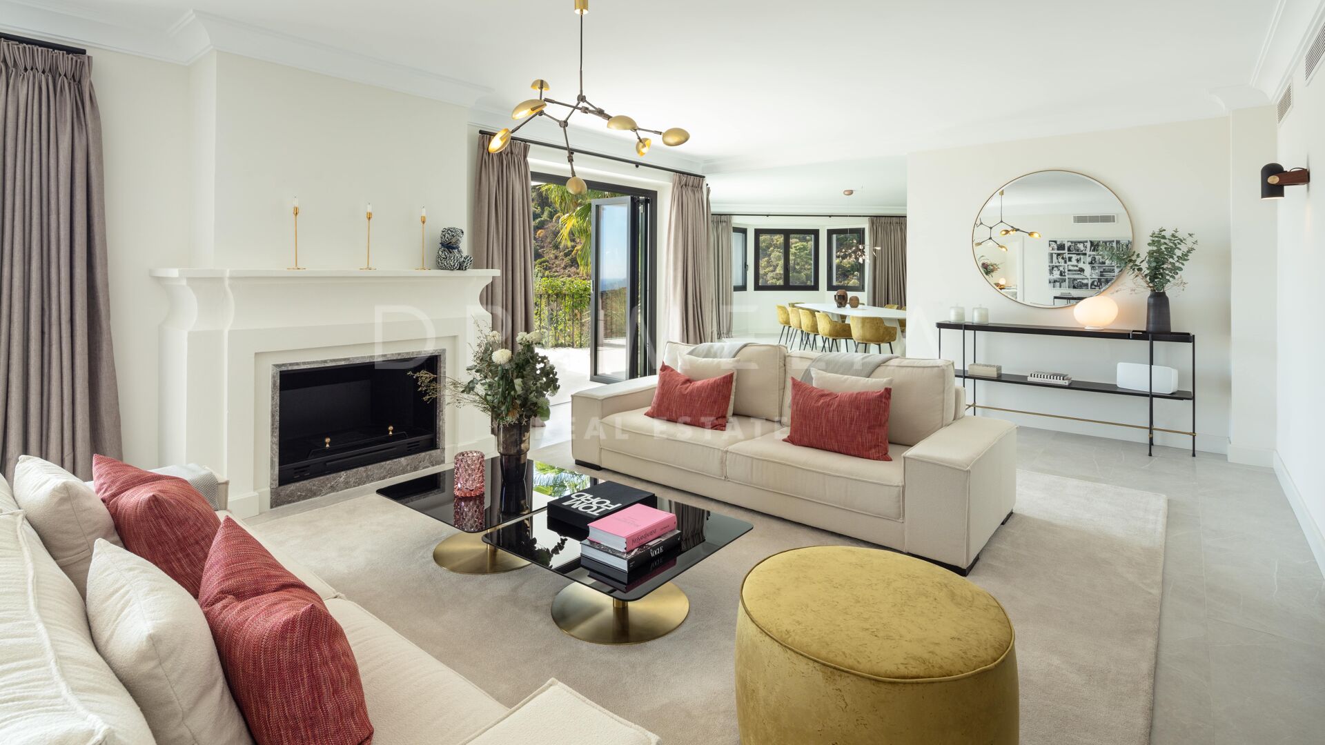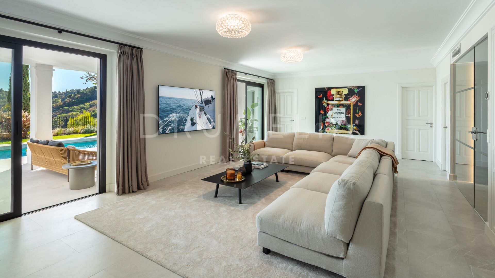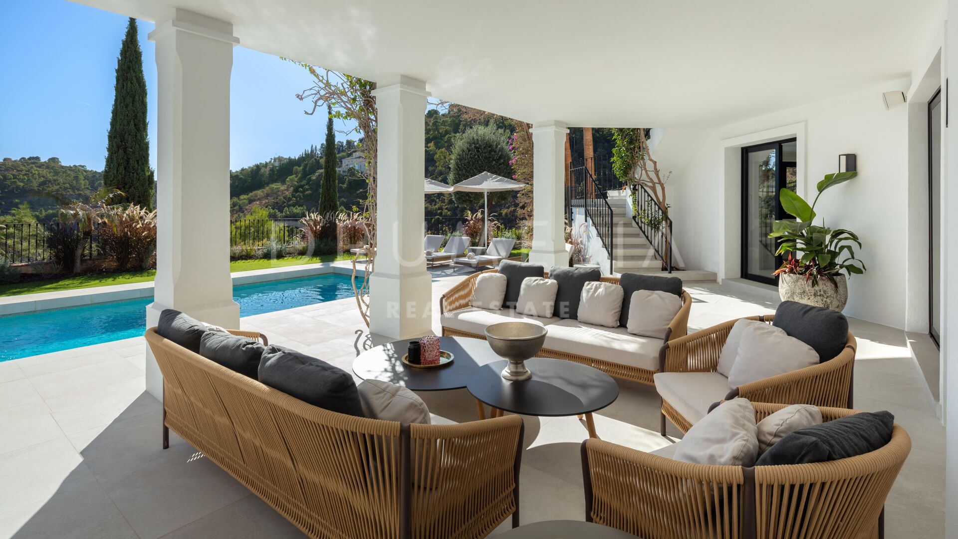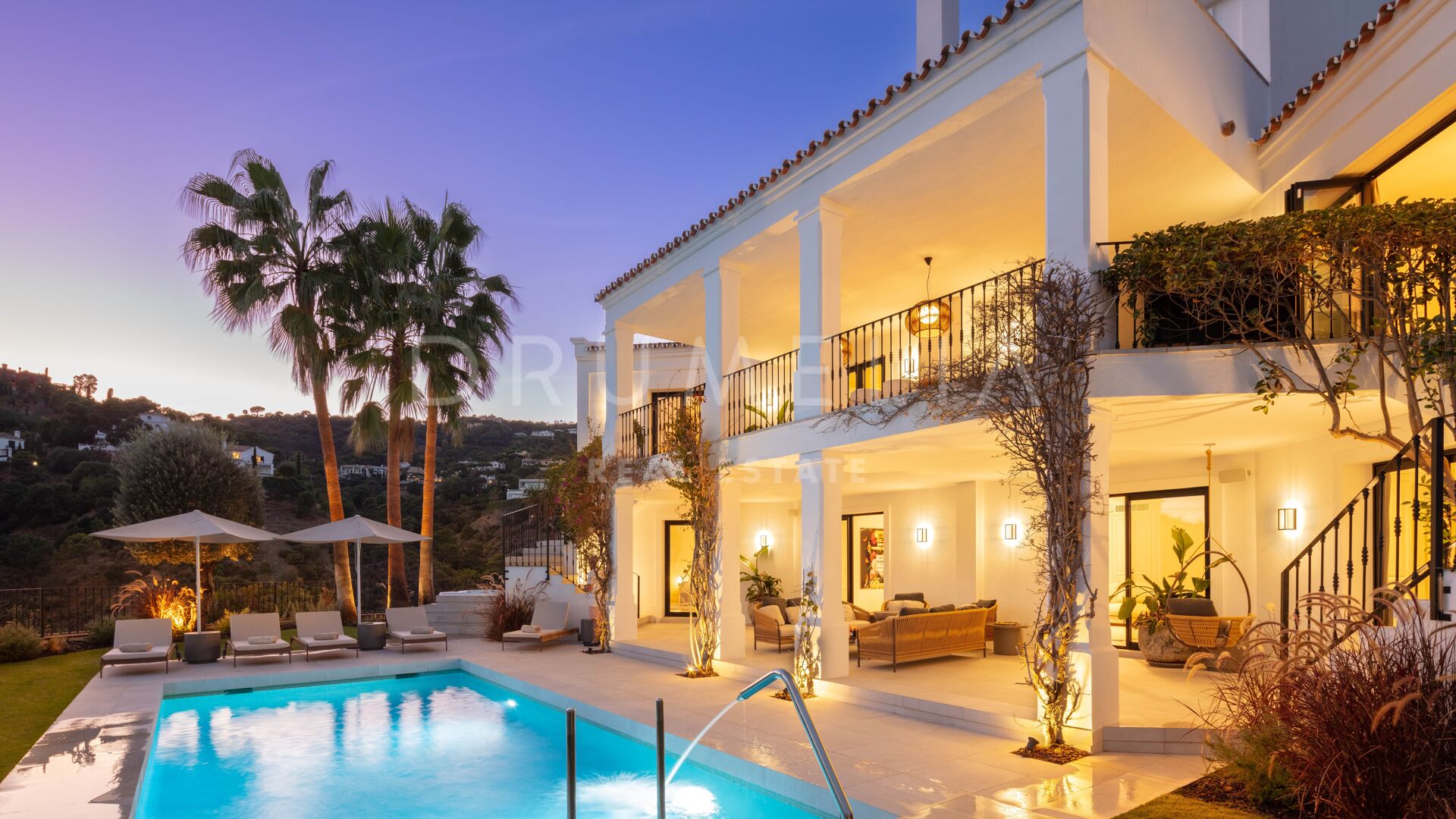 This elegant Andalusian villa with contemporary interiors sits proudly on the hillside of El Madroñal, Benahavis, one of the most prestigious residential addresses on the Costa del Sol. The exclusive neighbourhood is located on Ronda road, above fabulous Puerto Banus, San Pedro de Alcantara resort and La Quinta Golf & Country Club. Surrounded by similar luxury properties of the Benahavis area and beautiful nature, the high-end community is within a 10-15 minute drive to the coast and has all amenities around.