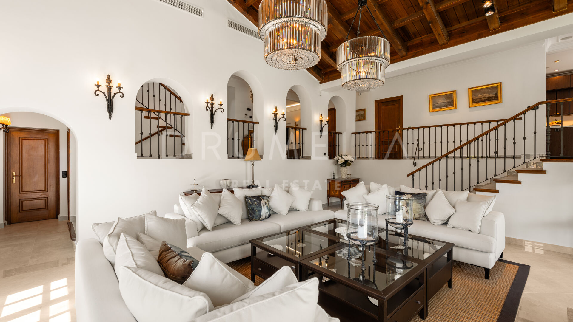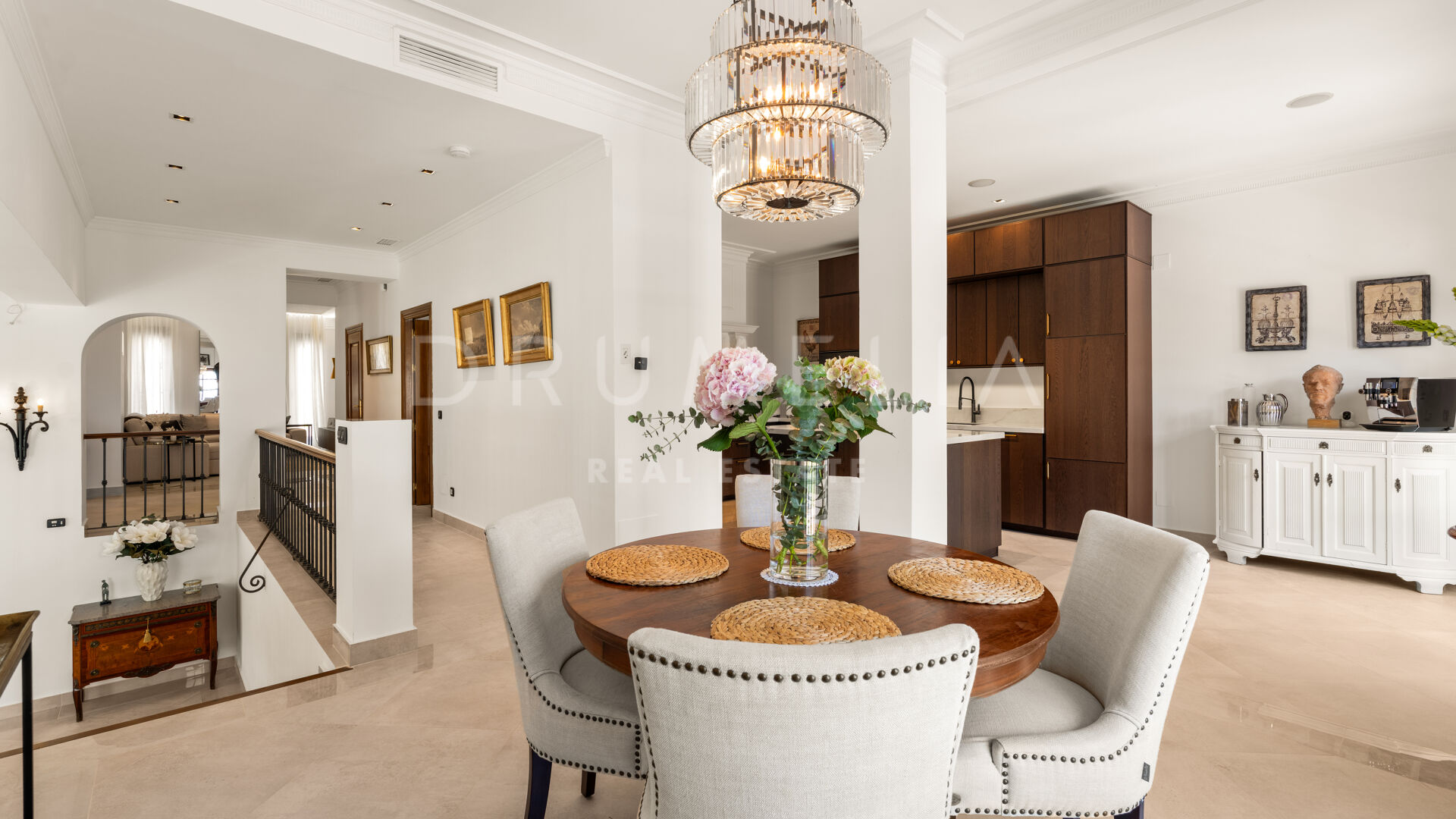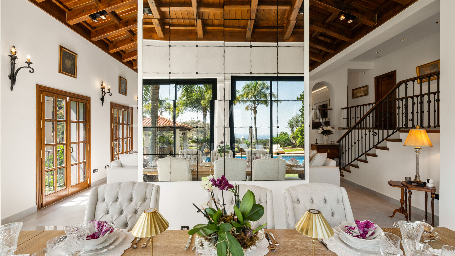 The 531 m² property is designed in a traditional Andalusian style with distinctive architecture, high ceilings, exposed wooden beams, and large windows that maximise natural light. The main living room opens directly to the garden and pool area, seamlessly connecting indoor and outdoor spaces. Next to it, a dedicated TV room extends the living area, while the adjoining dining room leads to a fully fitted kitchen with modern cabinetry and integrated appliances.