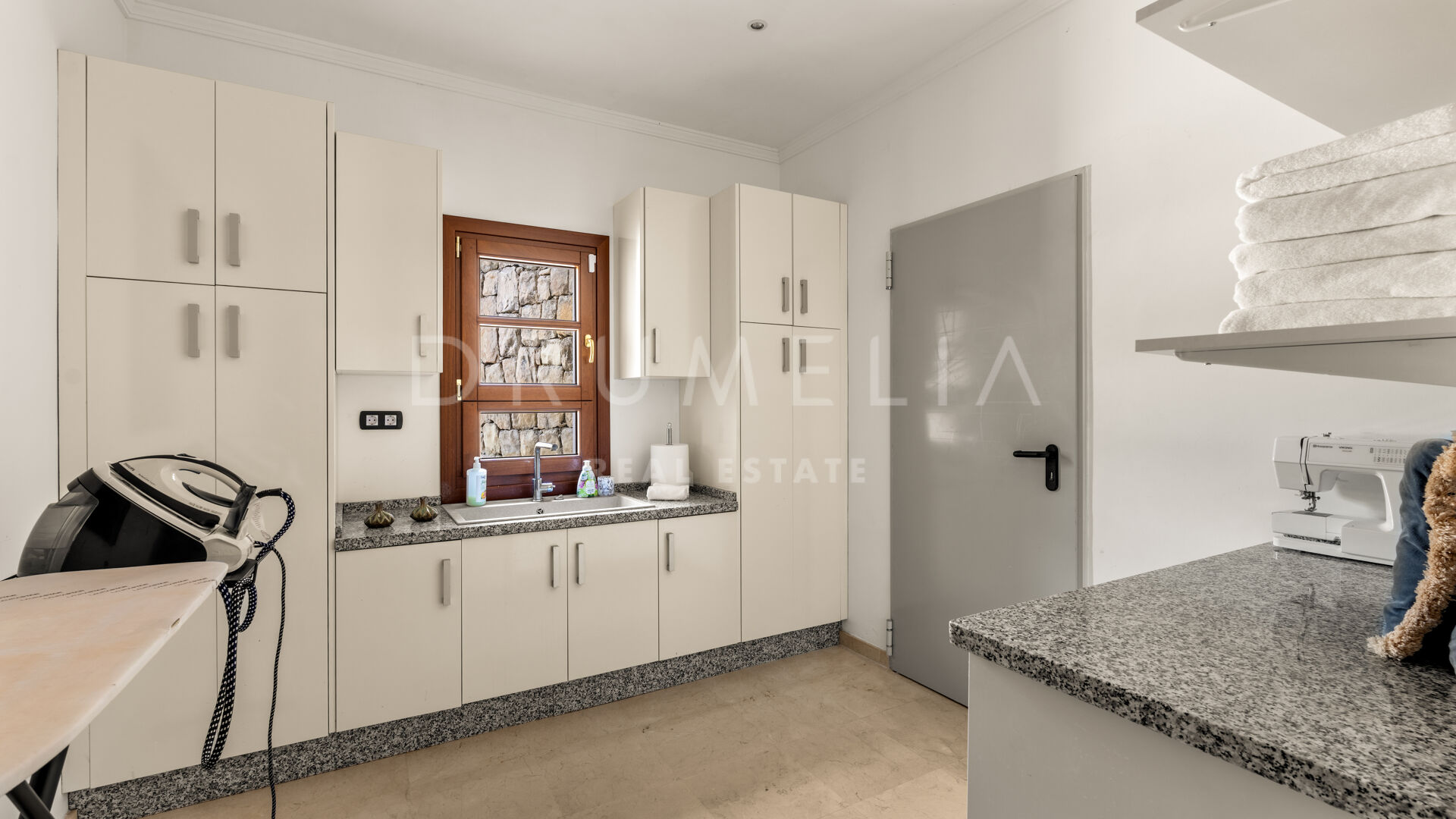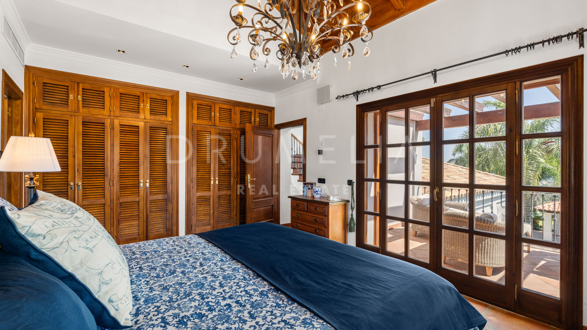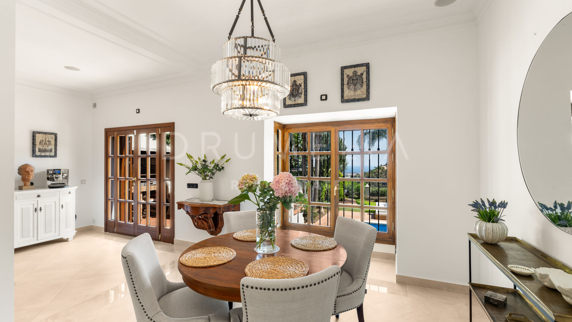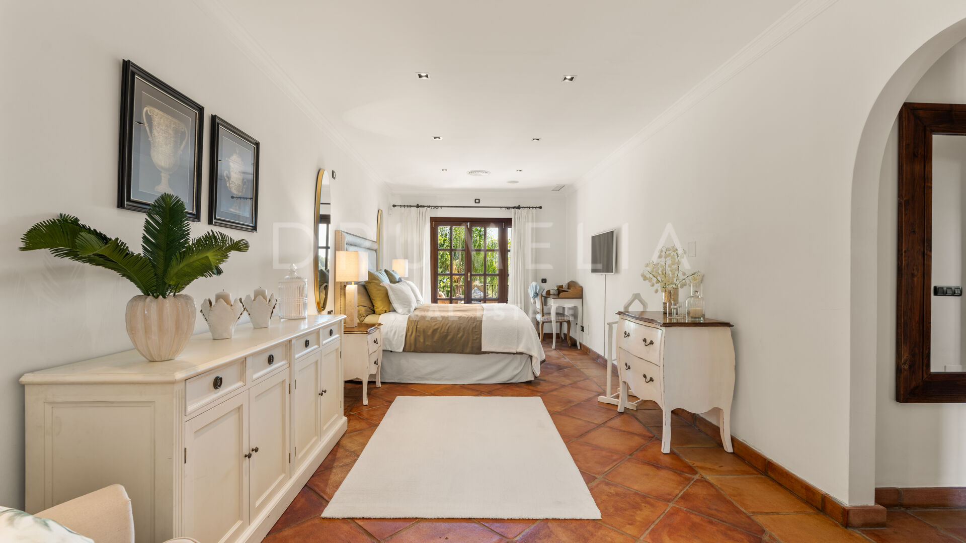 The 531 m² property is designed in a traditional Andalusian style with distinctive architecture, high ceilings, exposed wooden beams, and large windows that maximise natural light. The main living room opens directly to the garden and pool area, seamlessly connecting indoor and outdoor spaces. Next to it, a dedicated TV room extends the living area, while the adjoining dining room leads to a fully fitted kitchen with modern cabinetry and integrated appliances.