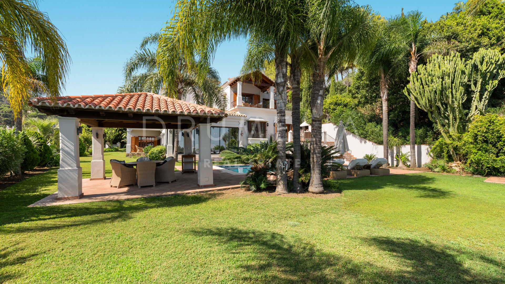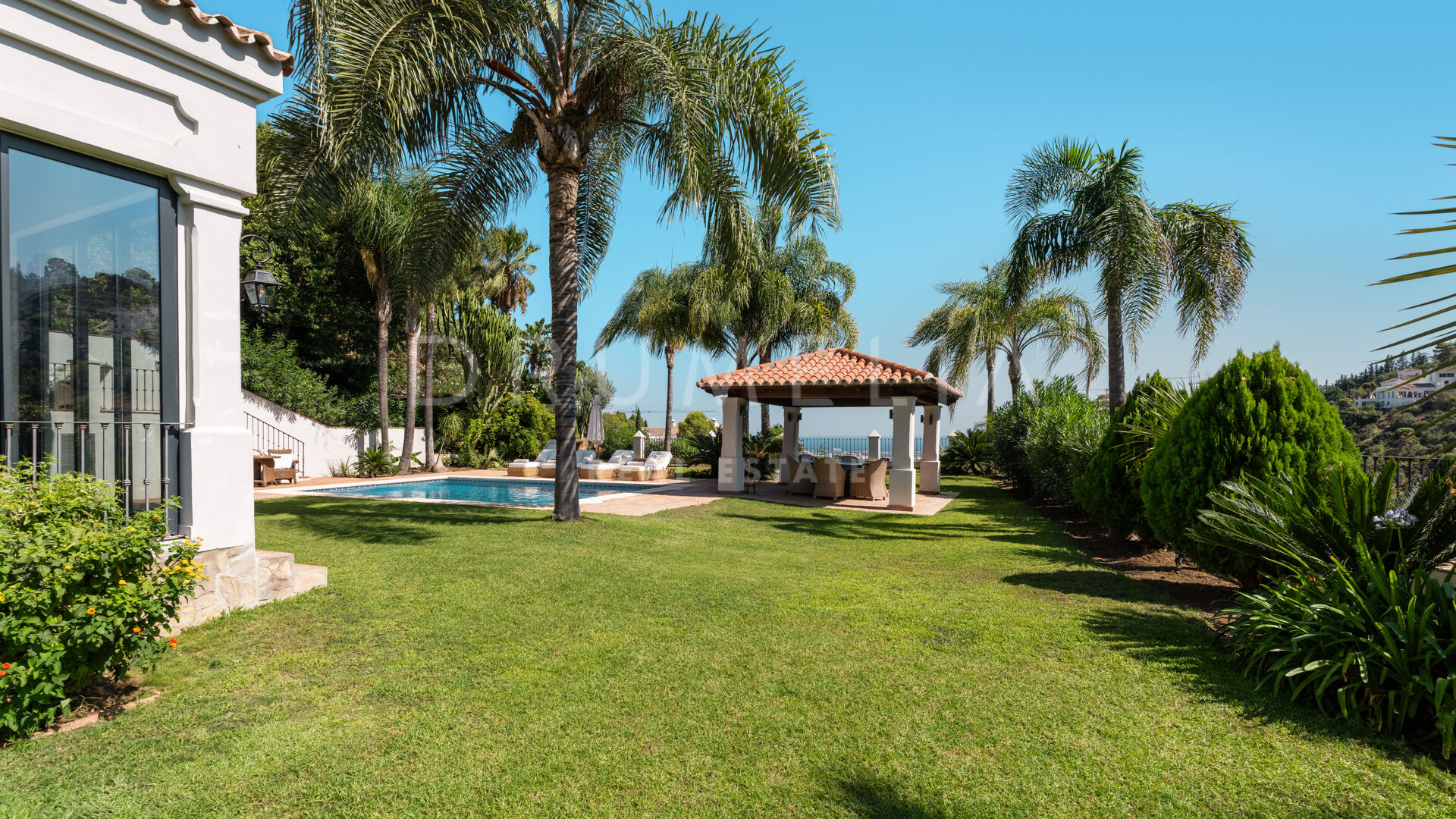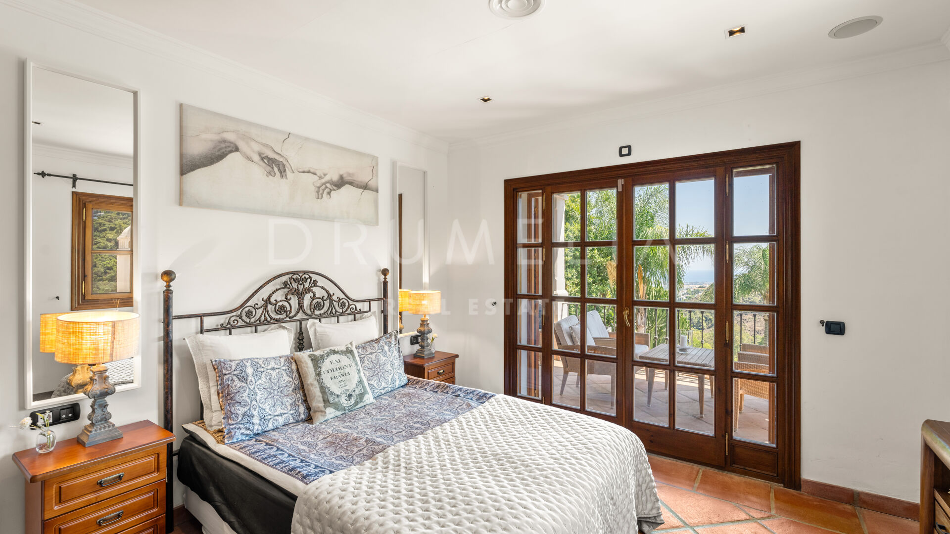 This 4-bedroom villa for sale is located in the secure gated community of El Madroñal, Benahavís, Costa del Sol. Positioned on an elevated south–southwest-facing plot of 5,417 m², it enjoys panoramic views over the Mediterranean Sea, the surrounding valleys, and the mountains. Its position within El Madroñal is unique, combining an elevated setting, panoramic open views, and strong privacy.