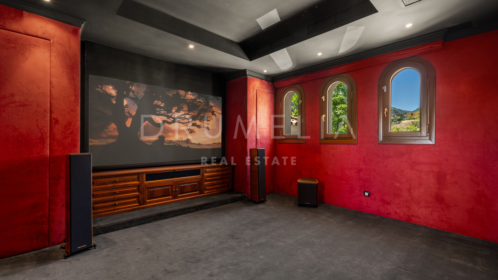 The villa comprises four bedrooms and four bathrooms, plus a guest toilet. The master suite features a walk-in closet, a private terrace with open views across the valley, and an en-suite bathroom with a bathtub. The remaining bathrooms are finished with natural stone and walk-in showers. Additional interior features include a cinema room equipped with a surround sound system, a wine cellar, a utility room, and an audio system installed in all rooms.