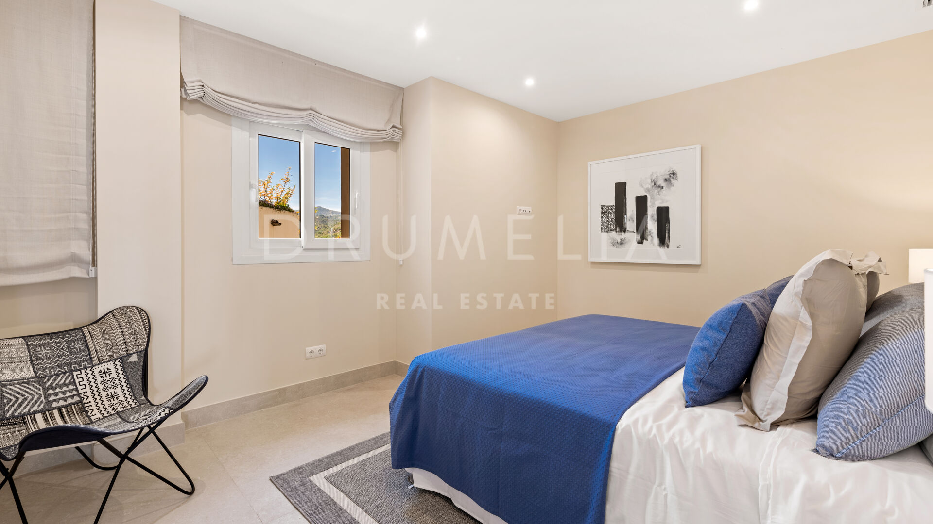 This property has been completely refurbished to provide maximum enjoyment both with the indoor and outdoor living spaces. The terraces on both levels and a stunning roof top solarium with a Jacuzzi and an outdoor gym enjoy views over the picturesque gardens of the 5*resort-style complex and an imposing swimming pool to the beach and the Mediterranean Sea (orientation South).