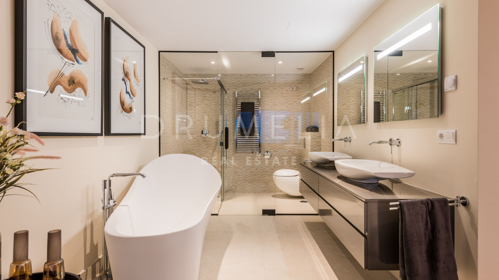 This penthouse of 359 m² features an entrance hallway leading to the open plan living space which combines an elegant lounge with electric log effect fireplace and direct access to the terrace; a dining area that leads out to al fresco dining terrace; and an open concept designer kitchen which has composite work tops, a wine cooler and premium appliances by Neff that raise the bar with sleek, superior design, including an oven, a microwave, an induction hop with integrated extractor, a fridge/freezer and a dishwasher. The entrance level hosts 2 luxury bedroom. The fabulous Master suite is located on the upper floor and features an en-suite bathroom with the high-end fittings, walk-in shower and a luxurious freestanding ‘slipper’ bath which is more comfortable than any regular shaped bath, as it allows to sit more upright with your back supported, to relax easily or even enjoy reading a book while you soak. The 4th bedroom and bathroom area are also on this level.