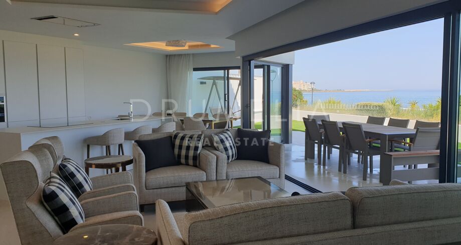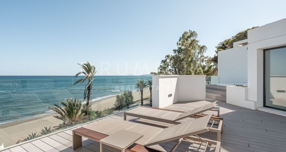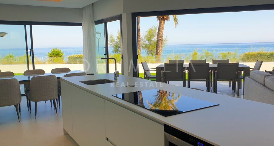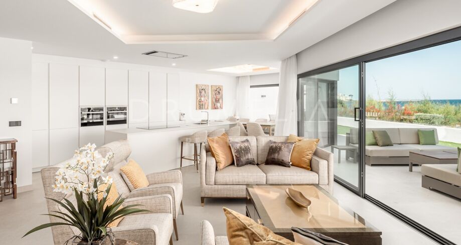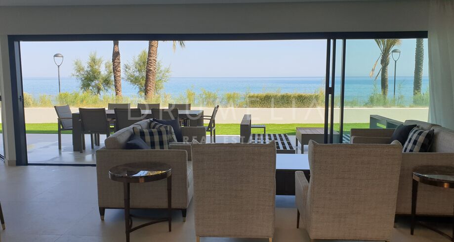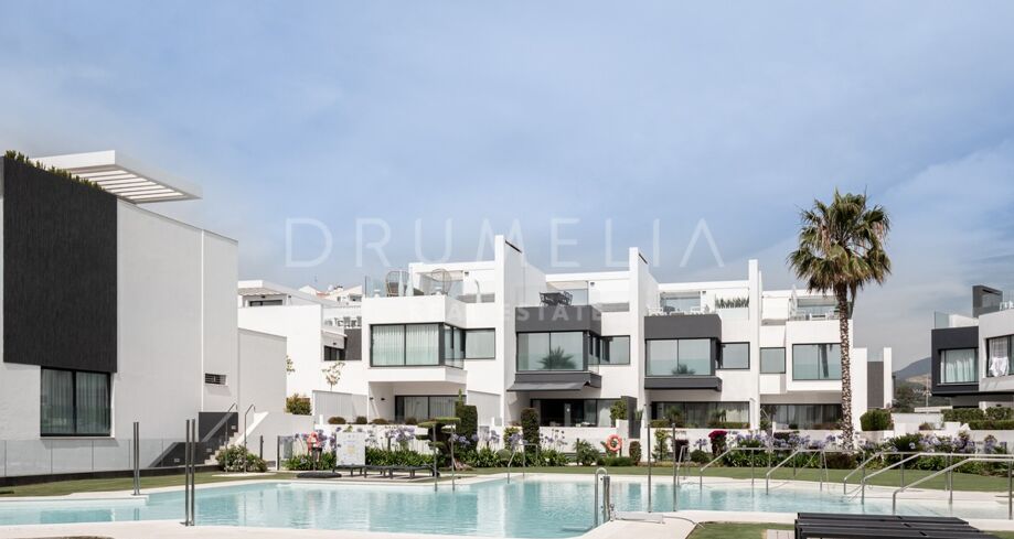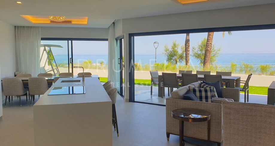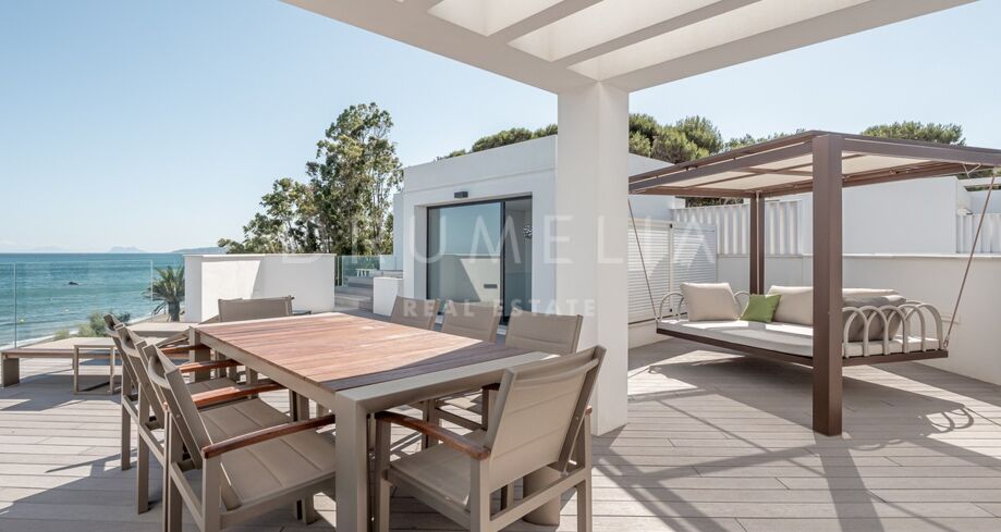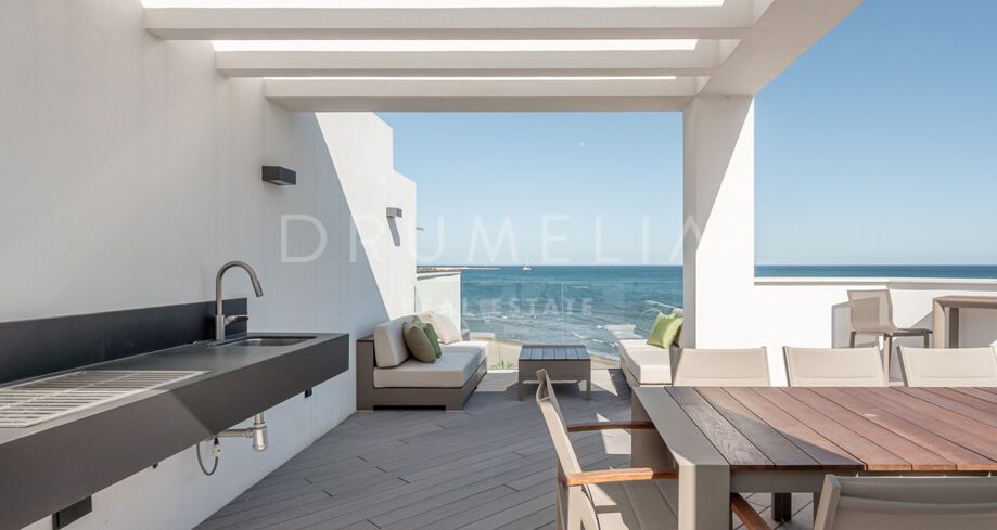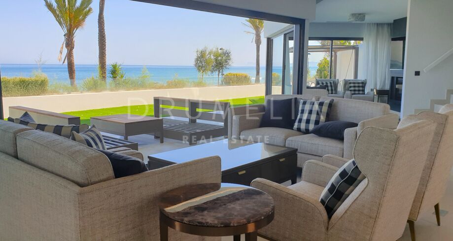 Enjoy an exclusive seaside lifestyle in this modern beachfront townhouse in Estepona, with direct access to the Mediterranean. The property forms part of a prestigious contemporary residential community that combines modern architecture, privacy and a carefully maintained coastal setting.