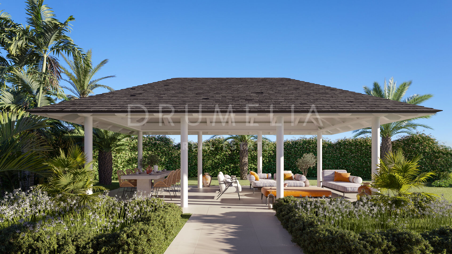 The generous outdoor terraces cater to those who cherish time spent outdoors, like to relax with a glass of wine a sunset cocktail, dine under the stars, have barbecue with friends and family. The meticulously manicured gardens provide an enchanting backdrop and ample outdoor space for entertaining and enjoying the sunshine and glorious Mediterranean lifestyle. The impressive infinity pool invites to relax while taking in the surrounding views, or throw a pool party for your friends or kids. The integrated gazebo is perfect for outdoor seating and al fresco dining.