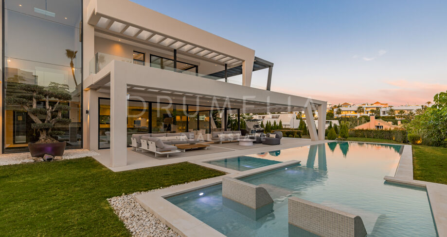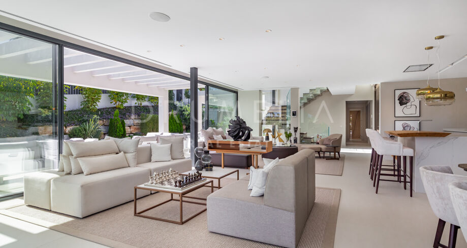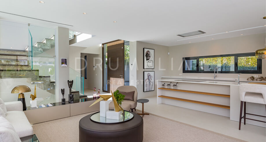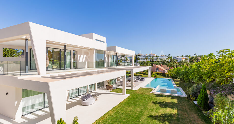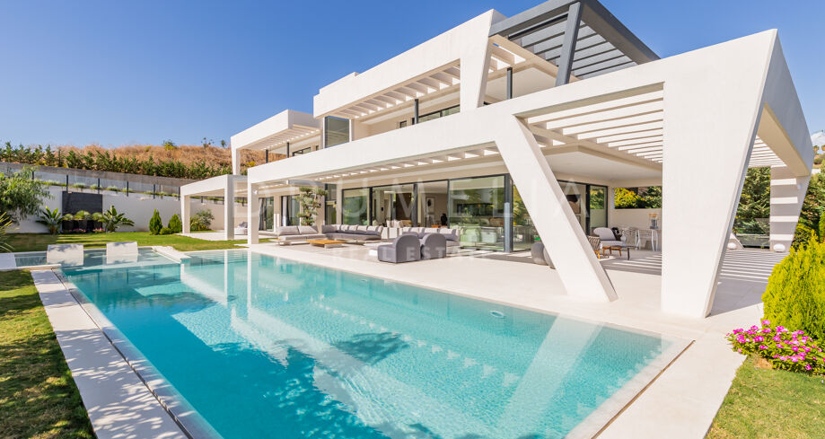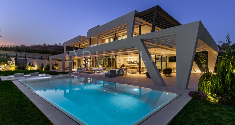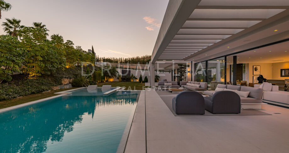 This brand-new modern villa for sale in the tranquil neighbourhood of Haza del Conde in the heart of the prestigious Golf Valley, Nueva Andalucía, offers a unique contemporary design, proximity to all amenities, superb golf courses and the legendary Puerto Banus with its luxurious yachts and cars, night and beach clubs, fashionable boutiques and gourmet restaurants (5 km).