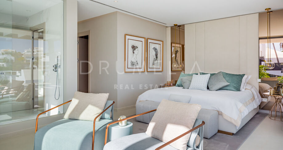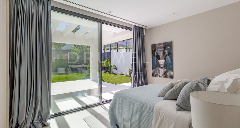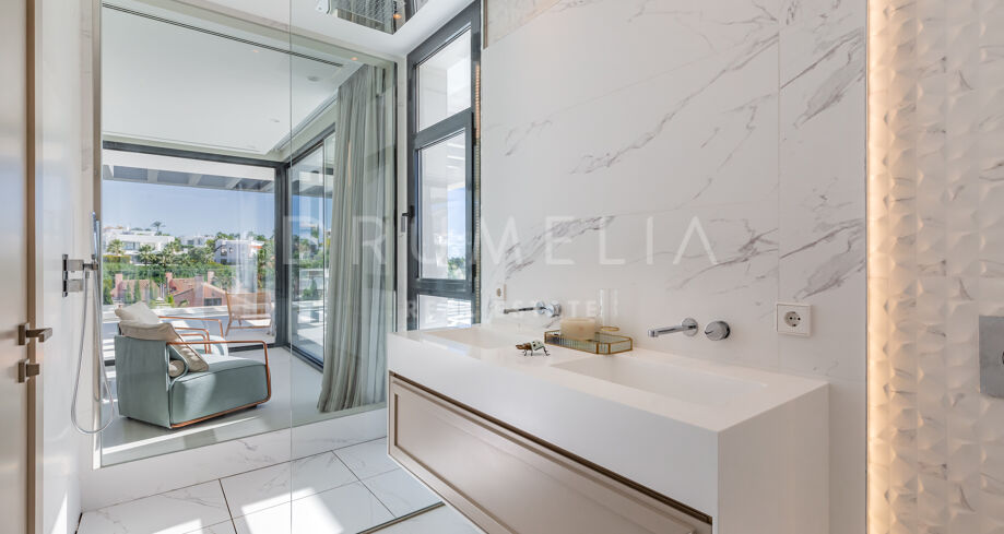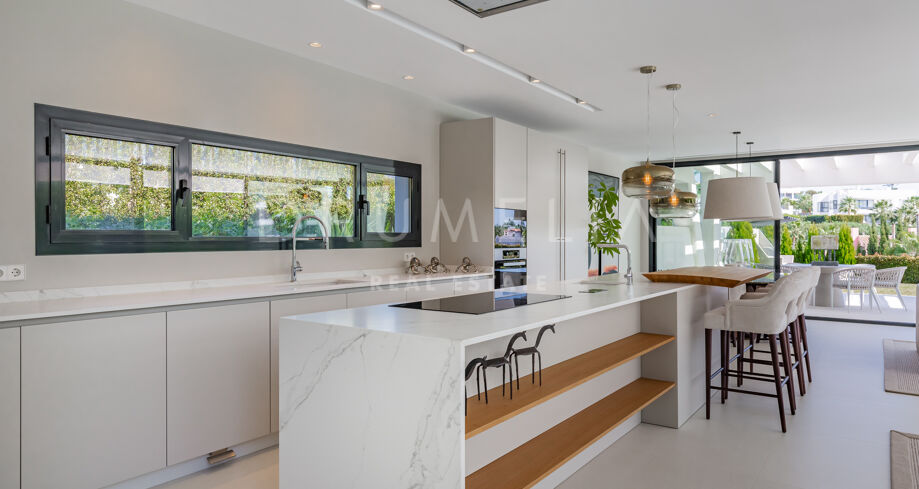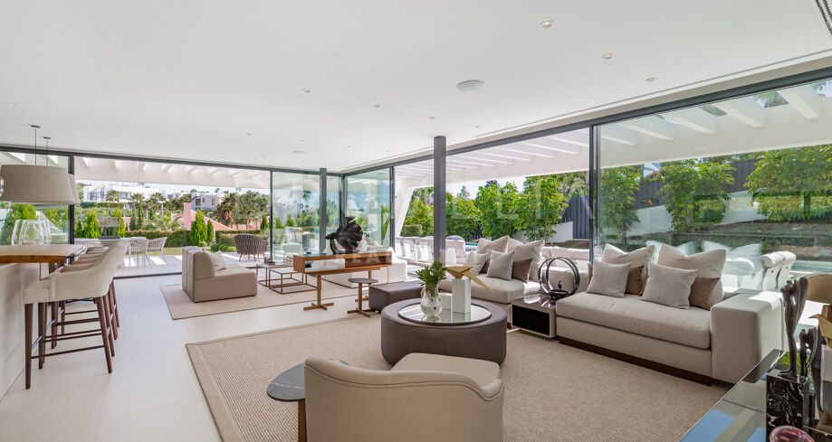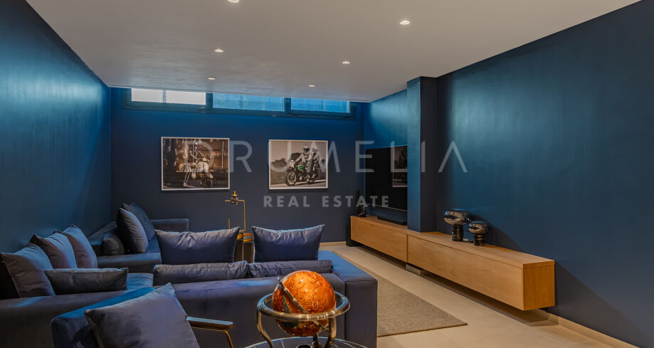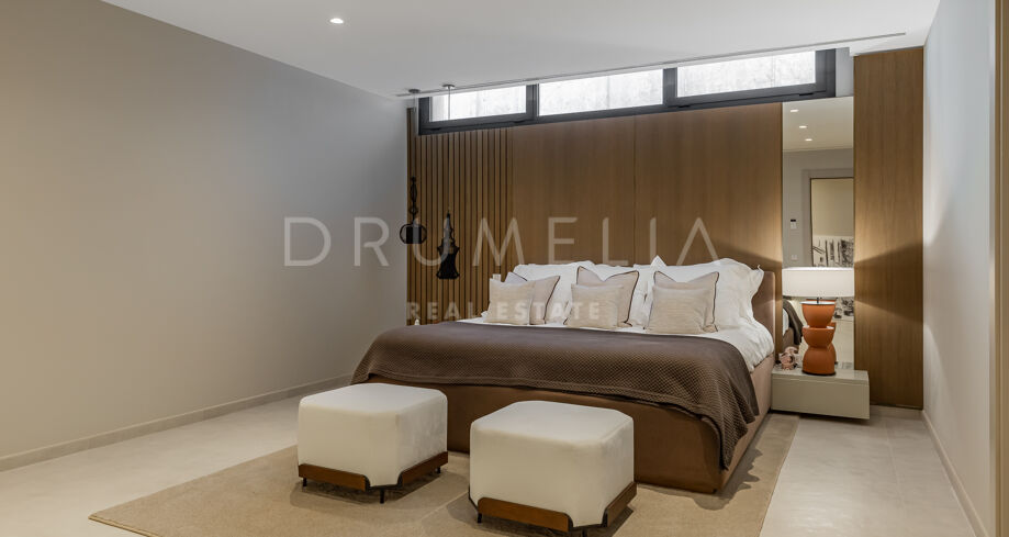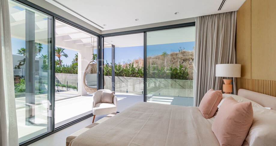 This brand-new modern villa for sale in the tranquil neighbourhood of Haza del Conde in the heart of the prestigious Golf Valley, Nueva Andalucía, offers a unique contemporary design, proximity to all amenities, superb golf courses and the legendary Puerto Banus with its luxurious yachts and cars, night and beach clubs, fashionable boutiques and gourmet restaurants (5 km).