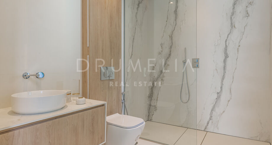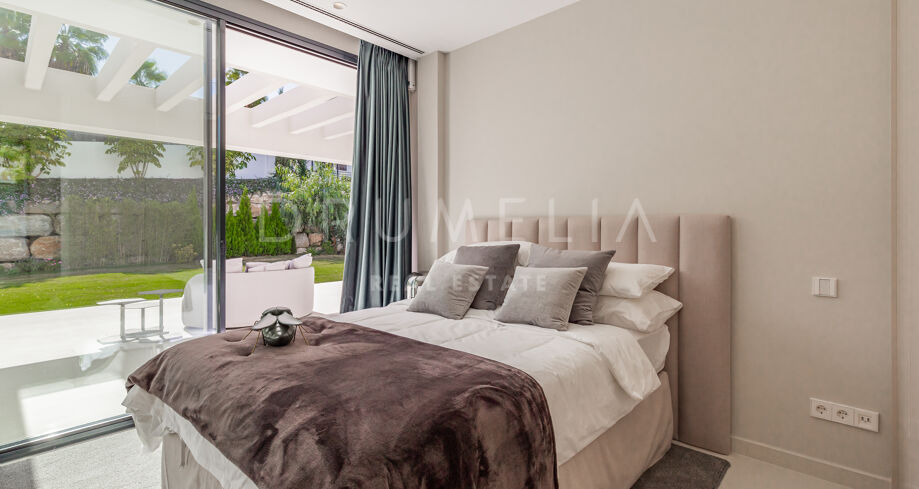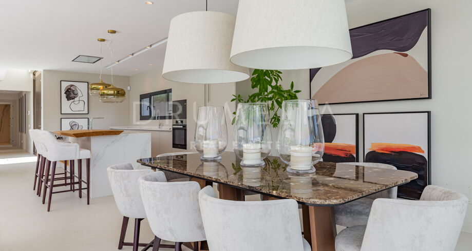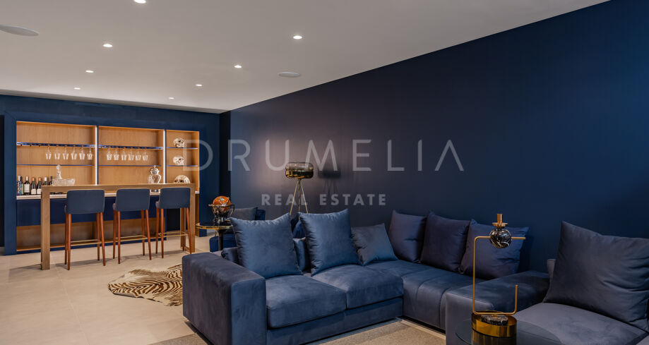 Surrounded with subtropical greenery, golf courses and similar luxury properties of Nueva Andalucía, this high-end villa is situated at approximately 700 m from the Clubhouse of Los Naranjos Golf Club. Everything you may need is at hand, including wide range of services of various kind, such as bars, restaurants, banks, shops, fitness centres, hairdressers, as well as international schools, popular golf courses, Casino, street markets, all amenities of Nueva Andalucía, Puerto Banus, San Pedro and Marbella.