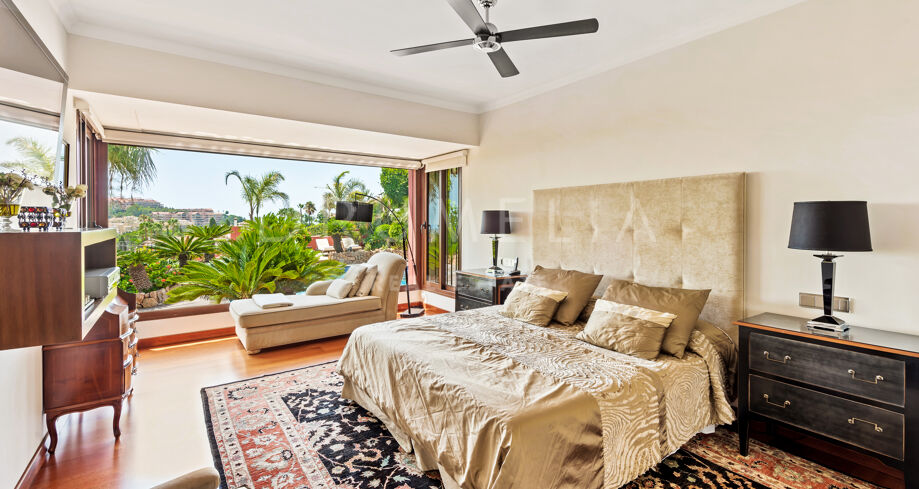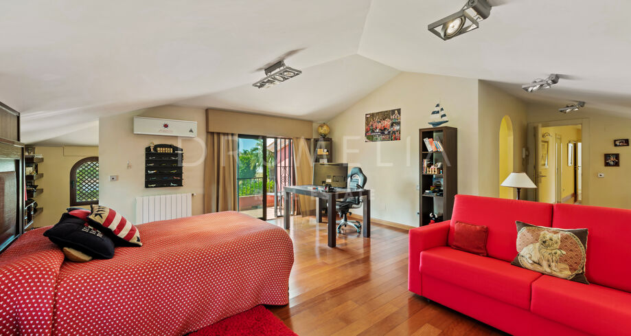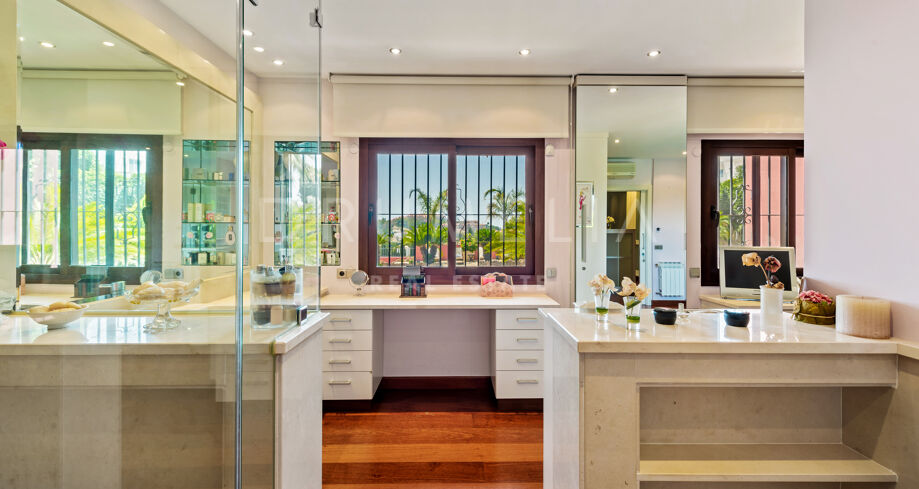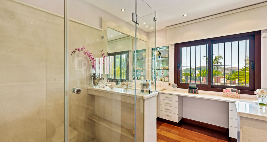 This beautiful villa for sale is located in one of the most popular areas of the Costa del Sol, Nueva Andalucía, which is the biggest and well-established part of Marbella with all amenities you need. Surrounded by the similar luxury properties and prestigious golf courses like Los Naranjos, Las Brisas and Aloha, the Mediterranean-style house was refurnished in 2015, keeping Andalusian style in the exterior and introducing modern touch and high-quality specifications in the interior. You will be impressed with its marble, iroko wood, Technal windows with climalit, and other luxurious features.