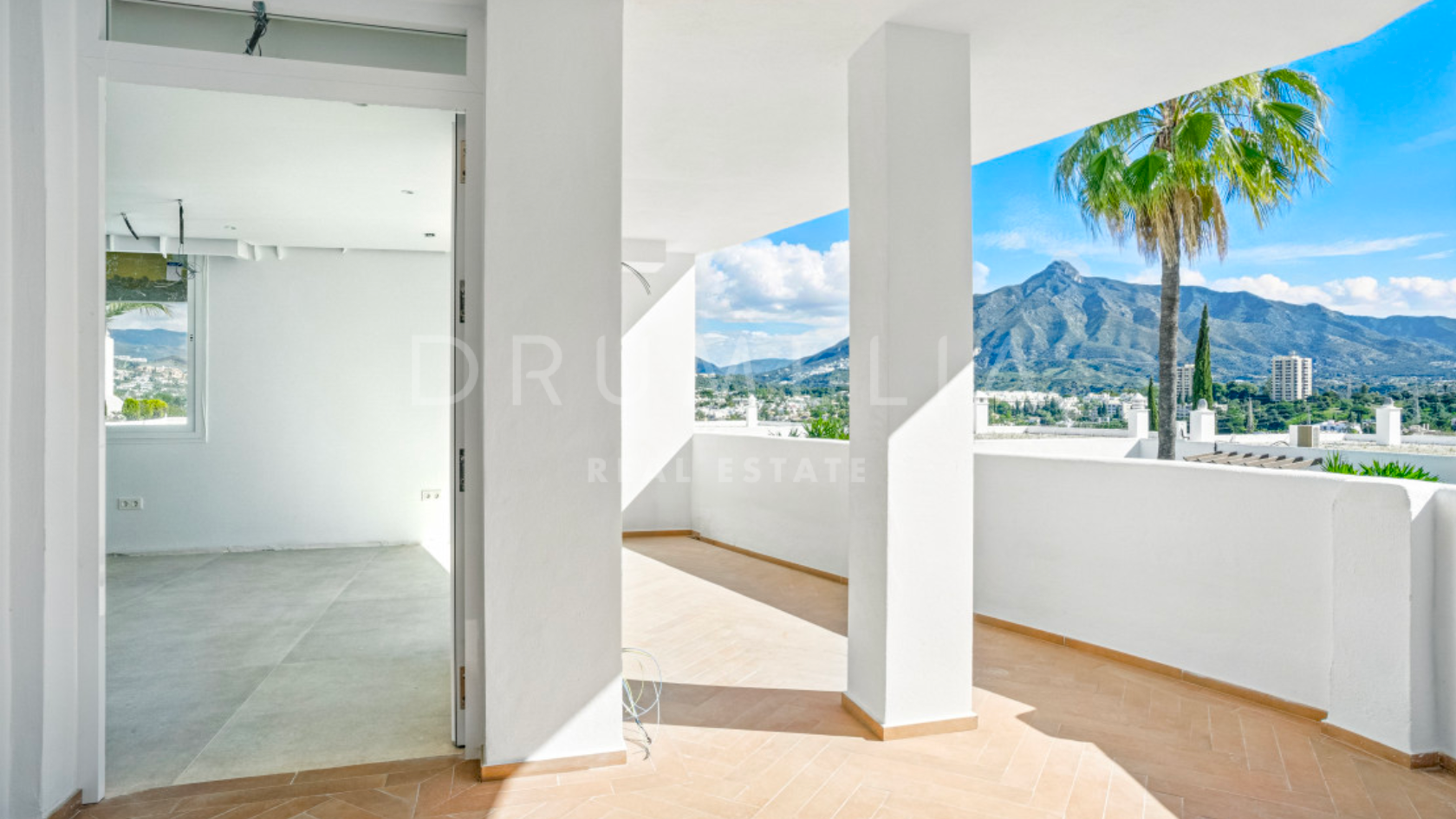 Beautifully renovated two-bedroom apartment in the gated community of Jardines de Andalucía, Nueva Andalucía. This property features a spacious open-plan kitchen, living and dining area; a guest bedroom with bathroom; and a master suite. All rooms have direct access to a private terrace with stunning views of La Concha mountain and partial sea views. Other features include air conditioning, a private parking space, and a storage room.