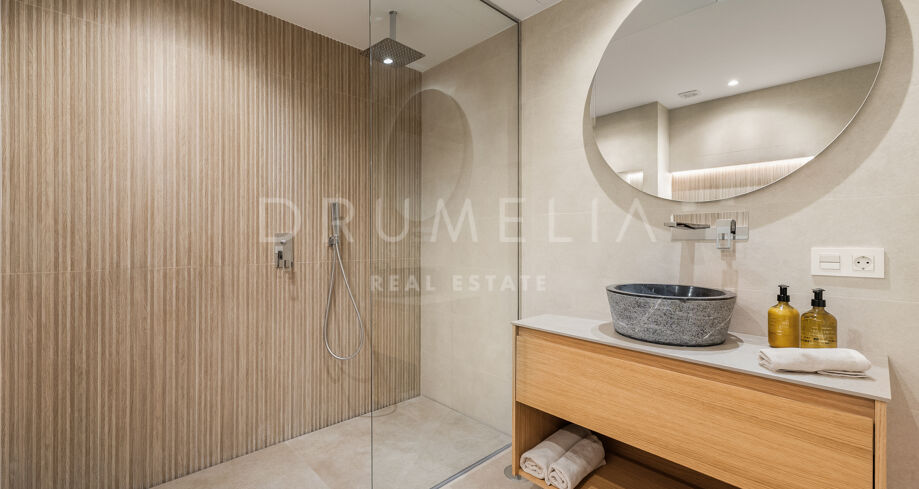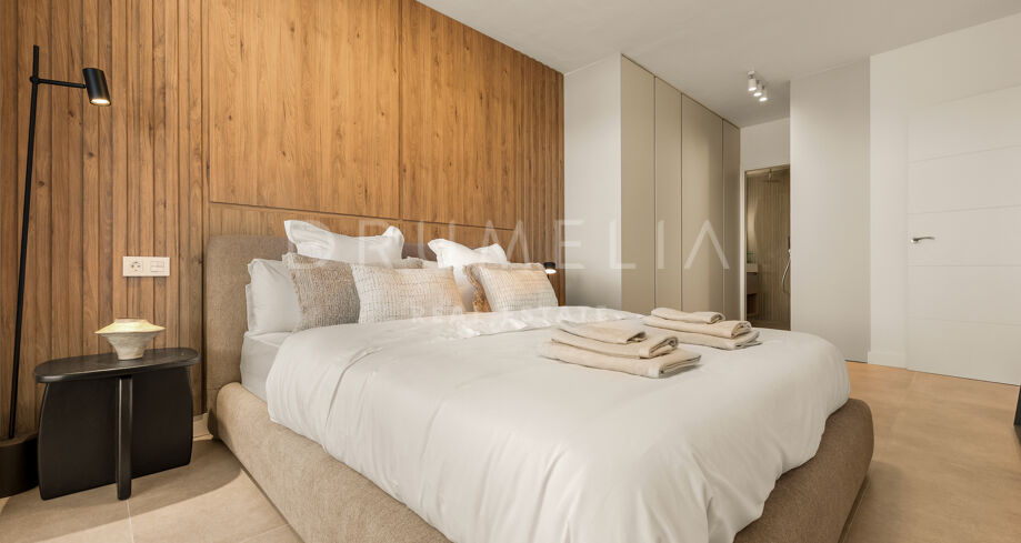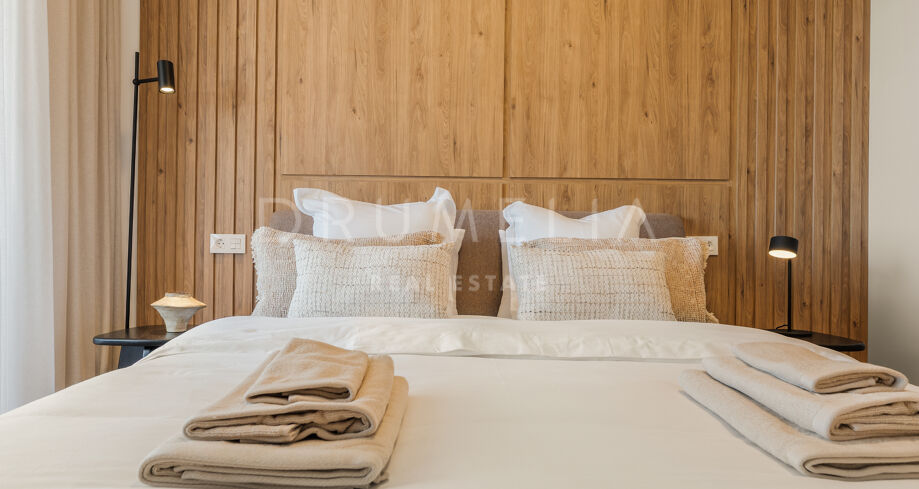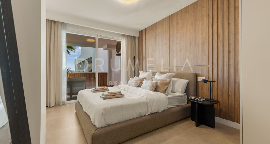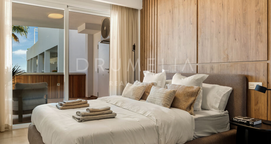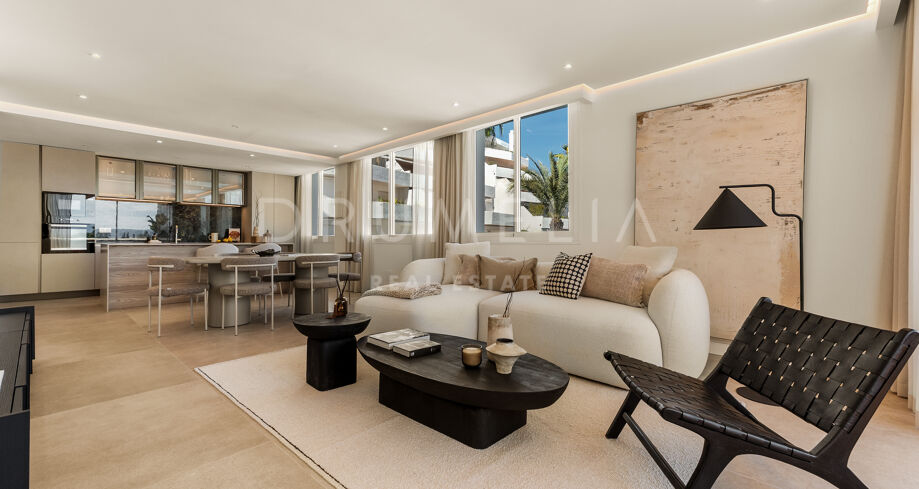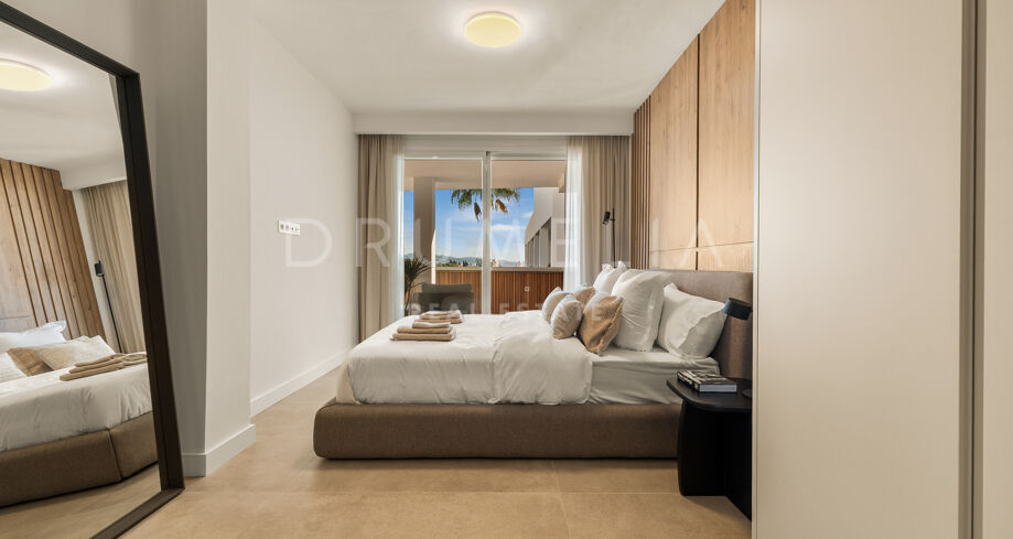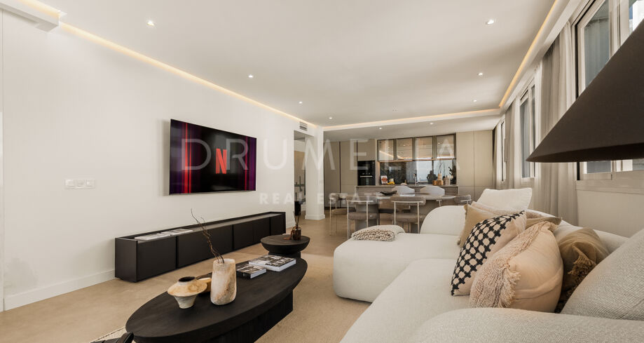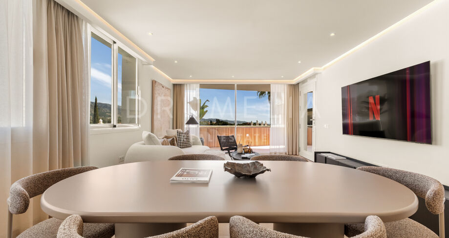 This renovated apartment in Nueva Andalucía, Marbella, combines clean contemporary design with open mountain views and a highly connected location near Puerto Banús and leading golf courses.