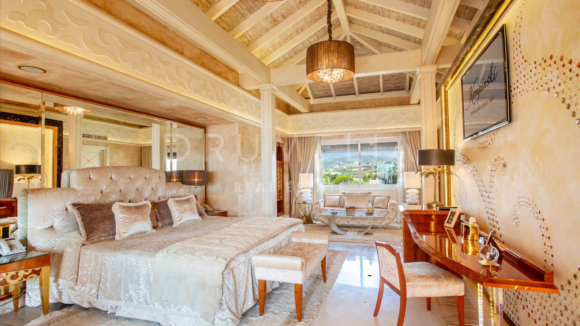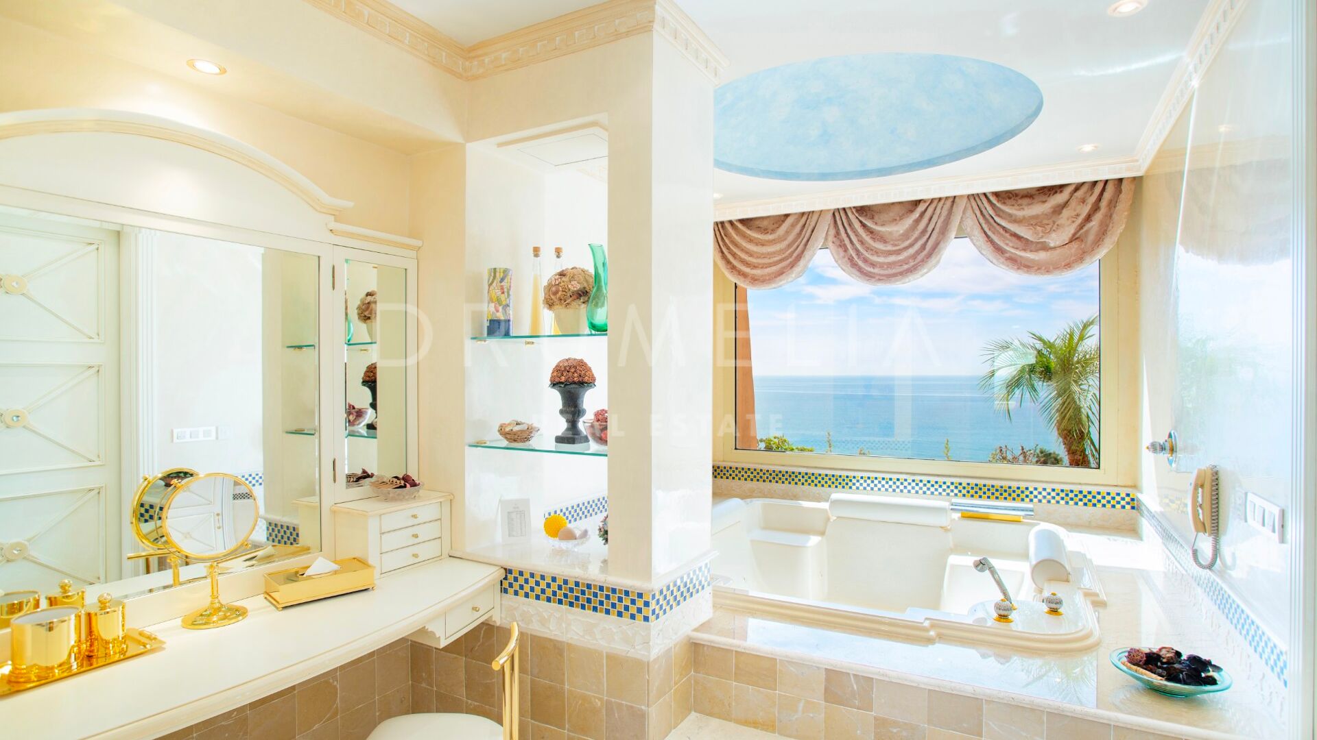 The left wing houses a large bedroom suite with a south-facing terrace and the sumptuous owners’ suite, featuring vaulted ceilings, custom-designed marble floors, a large dressing room, jacuzzi with sea views, and a private terrace. The right wing includes two additional bedroom suites with sea views and terrace access, and a chef’s kitchen equipped with top-of-the-line Siemens appliances.