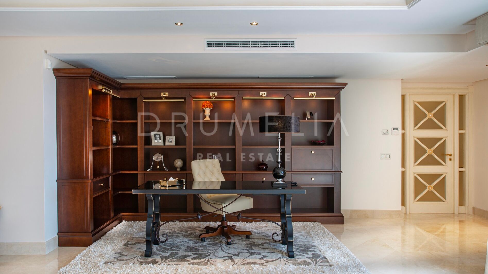 The penthouse boasts distinct living sections, including a south-facing sitting area with direct terrace access, a richly appointed office space, and a large family dining area with an adjoining smaller dining area with TV. The expansive terrace offers spectacular sea views and various spaces for dining alfresco or lounging on sunbeds, epitomizing the essence of indoor-outdoor living.