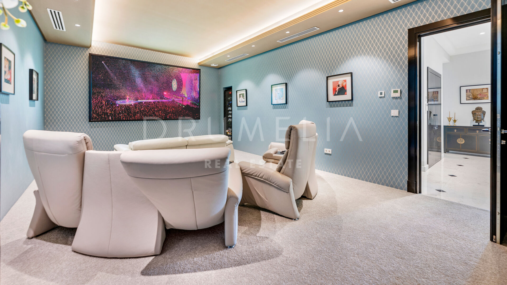Outdoor living is arranged around the main terrace, where an upper infinity-style pool flows into a larger lower pool, visually linking the architecture with the landscaped gardens. The upper floor is dedicated to the primary suite with a private terrace, dressing room and open sea views, alongside two additional en-suite bedrooms. The lower level includes a private cinema room, gym, spa area with sauna and Turkish bath, wine cellar, entertainment room, service apartment and storage spaces.