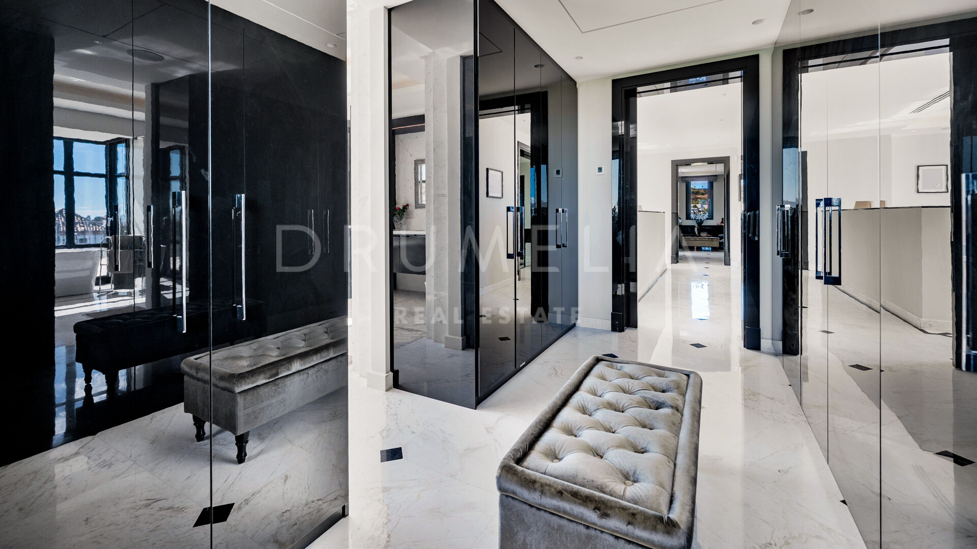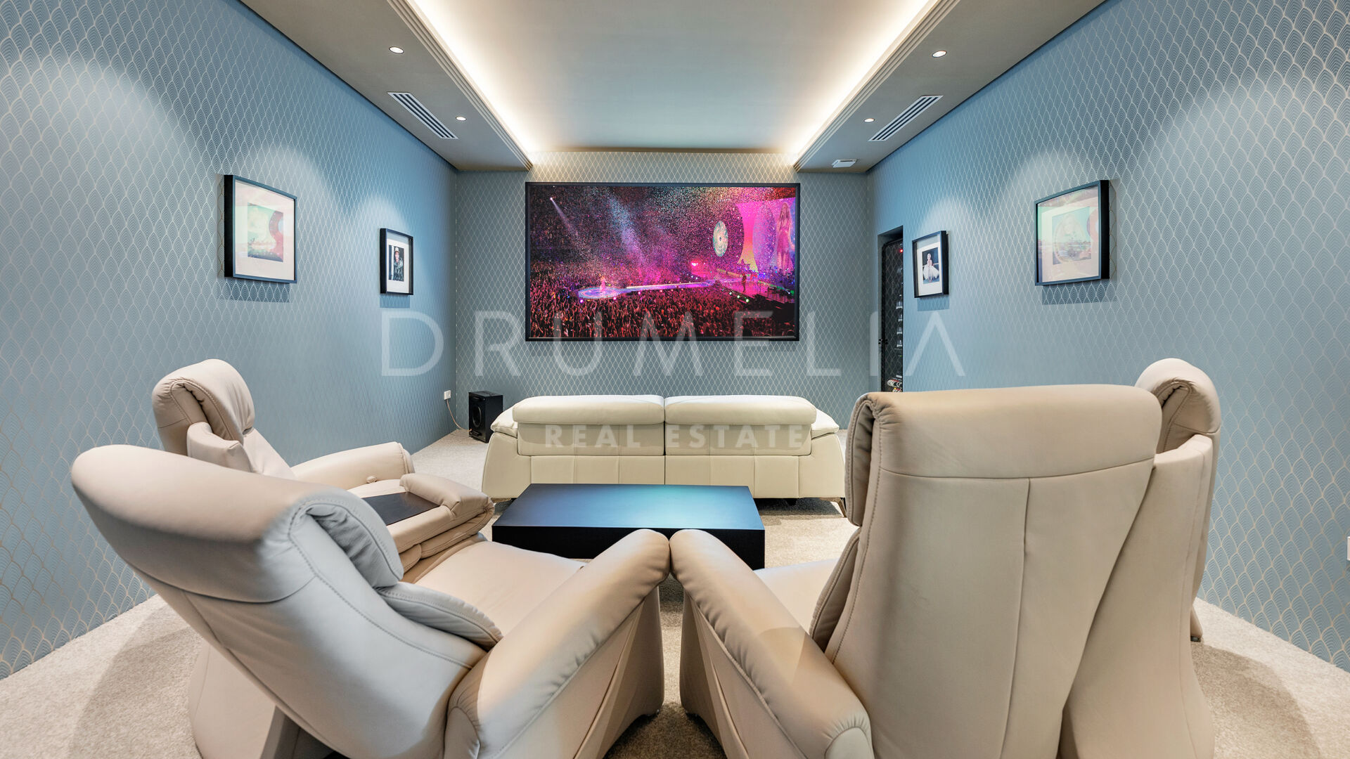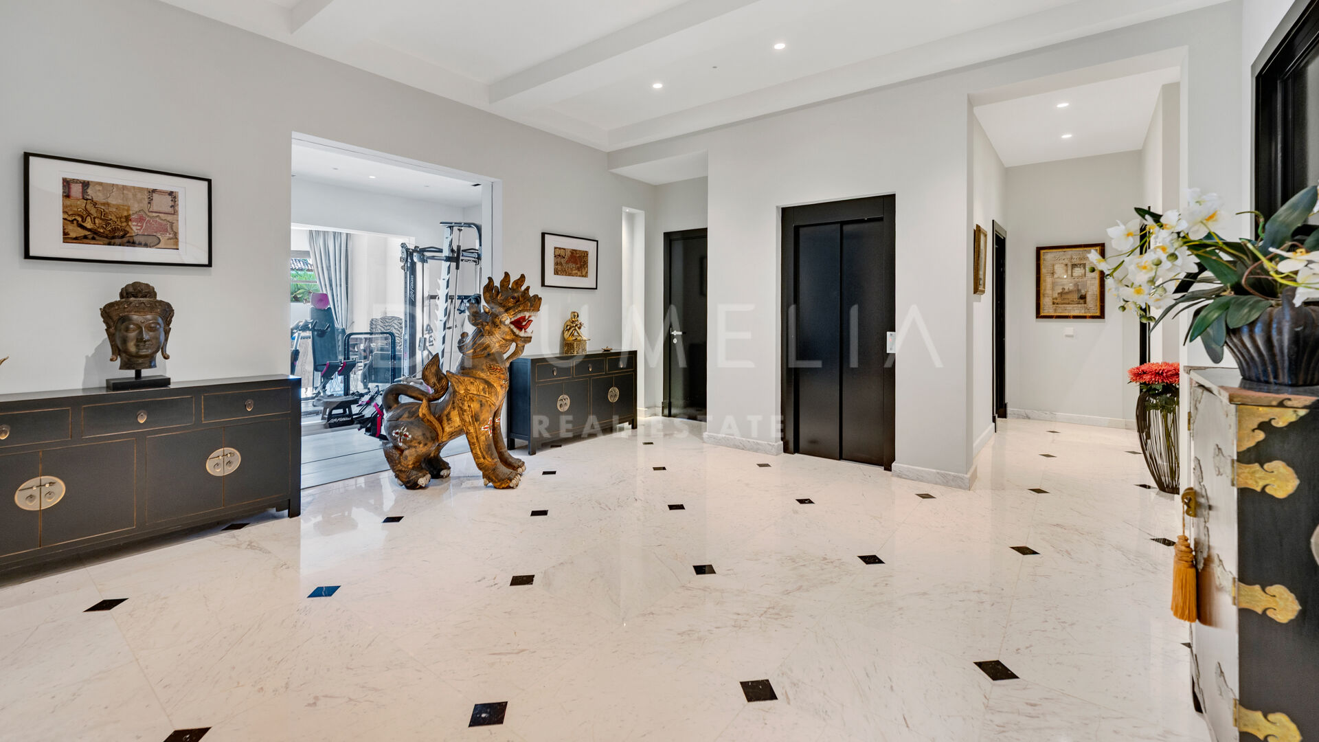 This three-level villa combines classical architecture with elegant contemporary interiors and an elevated position overlooking golf courses, the valley, the mountains and the Mediterranean Sea. The property is set within a well-established residential area and enjoys open views across the surrounding landscape.