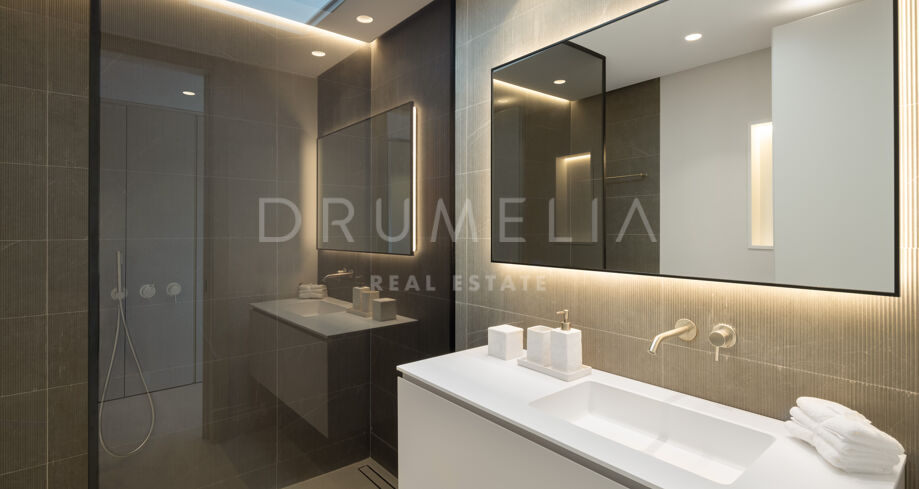 Spread over three levels, the upper floor is dedicated to well-appointed bedrooms, each creating a tranquil and elegant ambiance. The master suite is a showcase of functional and comfortable interior design, complete with a private terrace and an ensuite bathroom featuring a shower, stand-alone bathtub, double vanity with marble and wood, and flattering LED lighting.