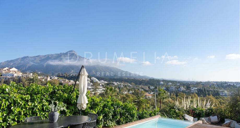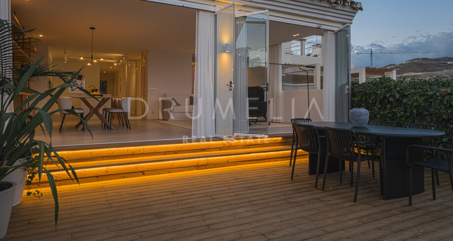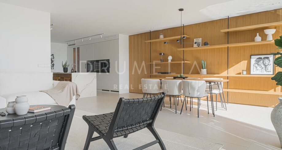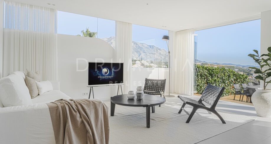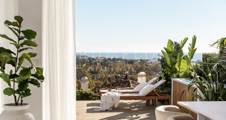 A three-bedroom apartment in La Cerquilla, Nueva Andalucía, where an elevated position delivers open views across the Mediterranean and the La Concha mountain range — simultaneously, from the same living space.