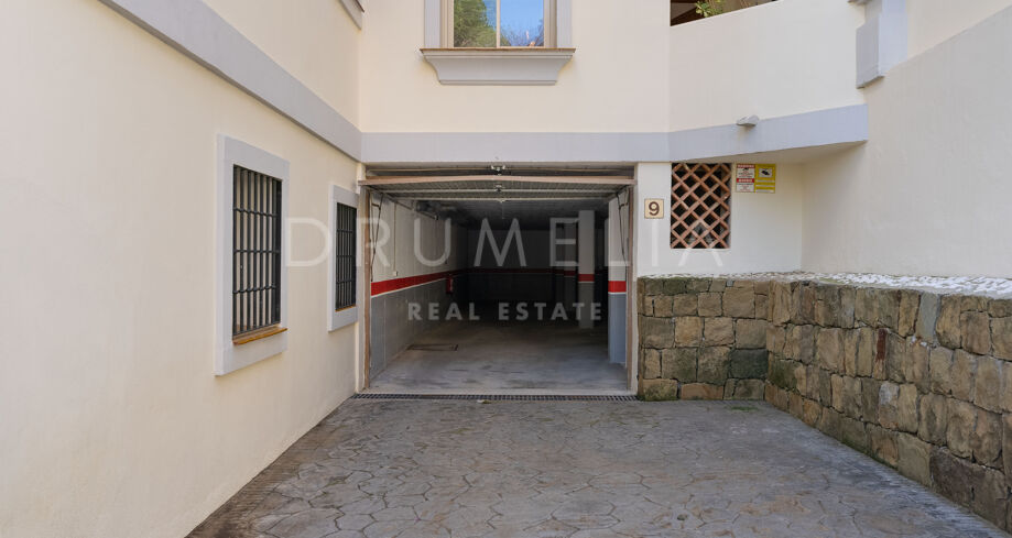 La Cerquilla sits within the golf valley of Nueva Andalucía, flanked by Los Naranjos Golf, Aloha Golf, and Las Brisas Golf. Puerto Banús is approximately 5 minutes by car, Marbella centre around 10 minutes, and Málaga airport approximately 45 minutes. The community is gated, with the apartment accessed directly from the underground garage via a private lift.