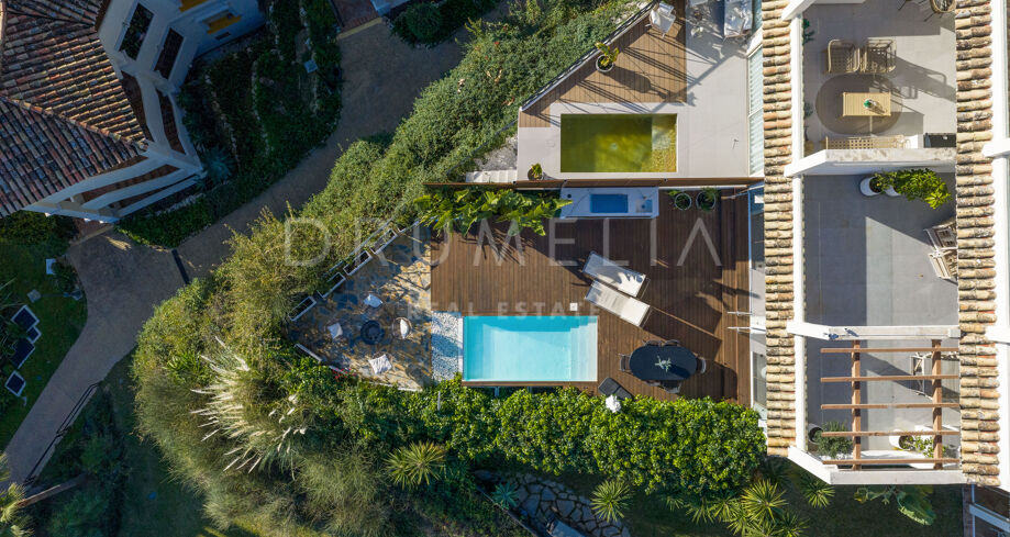 Outside, the garden-level terrace is laid in hardwood decking with a private pool framed by a glass panel, illuminated staircase, and an outdoor kitchen unit. The terrace connects visually to a stone-paved lower garden area with mature tropical planting. The upper terrace, accessed separately, is decked and outfitted with sun loungers — framing unobstructed views toward the sea. The property also includes a separate laundry room, underfloor heating throughout, and one garage space with storage room.